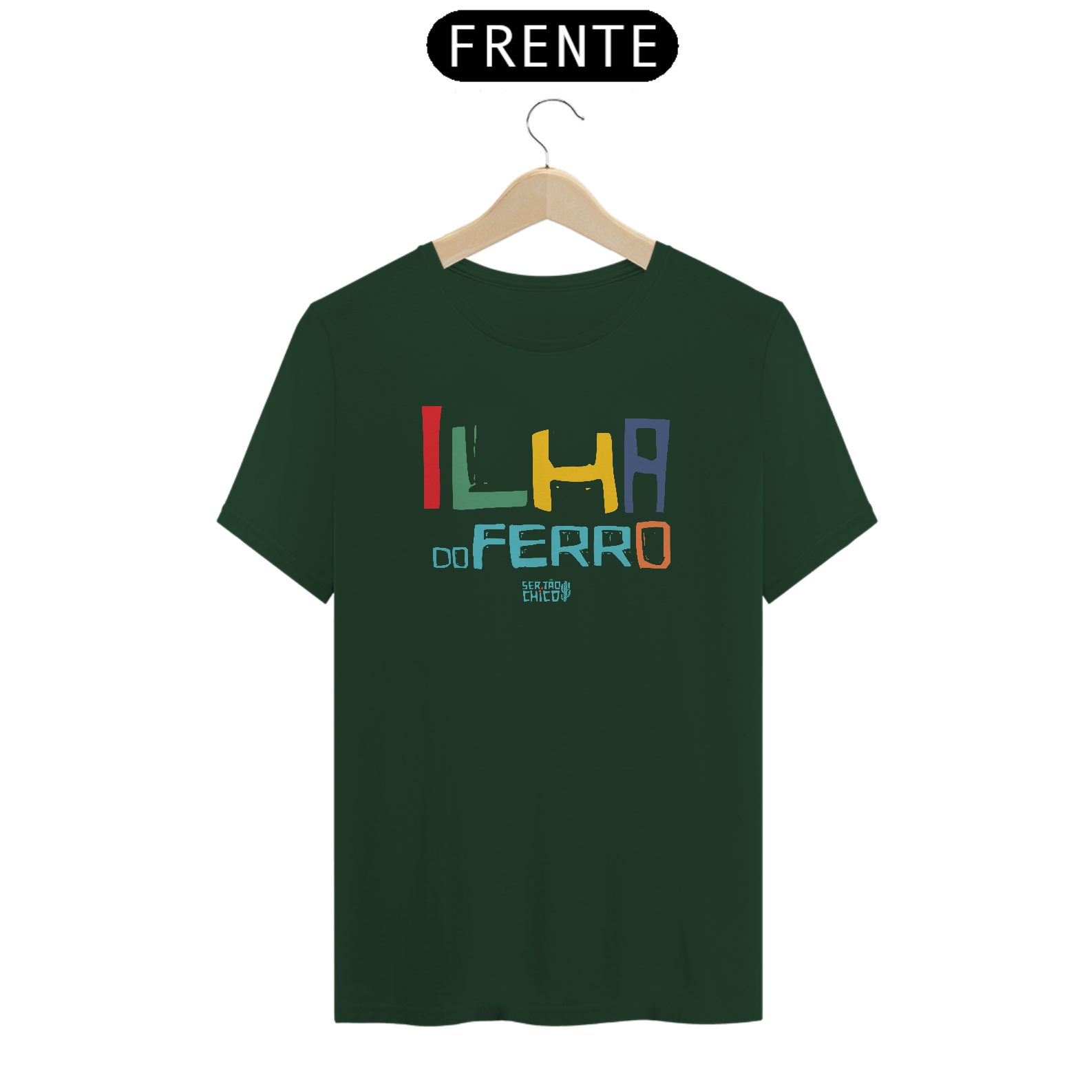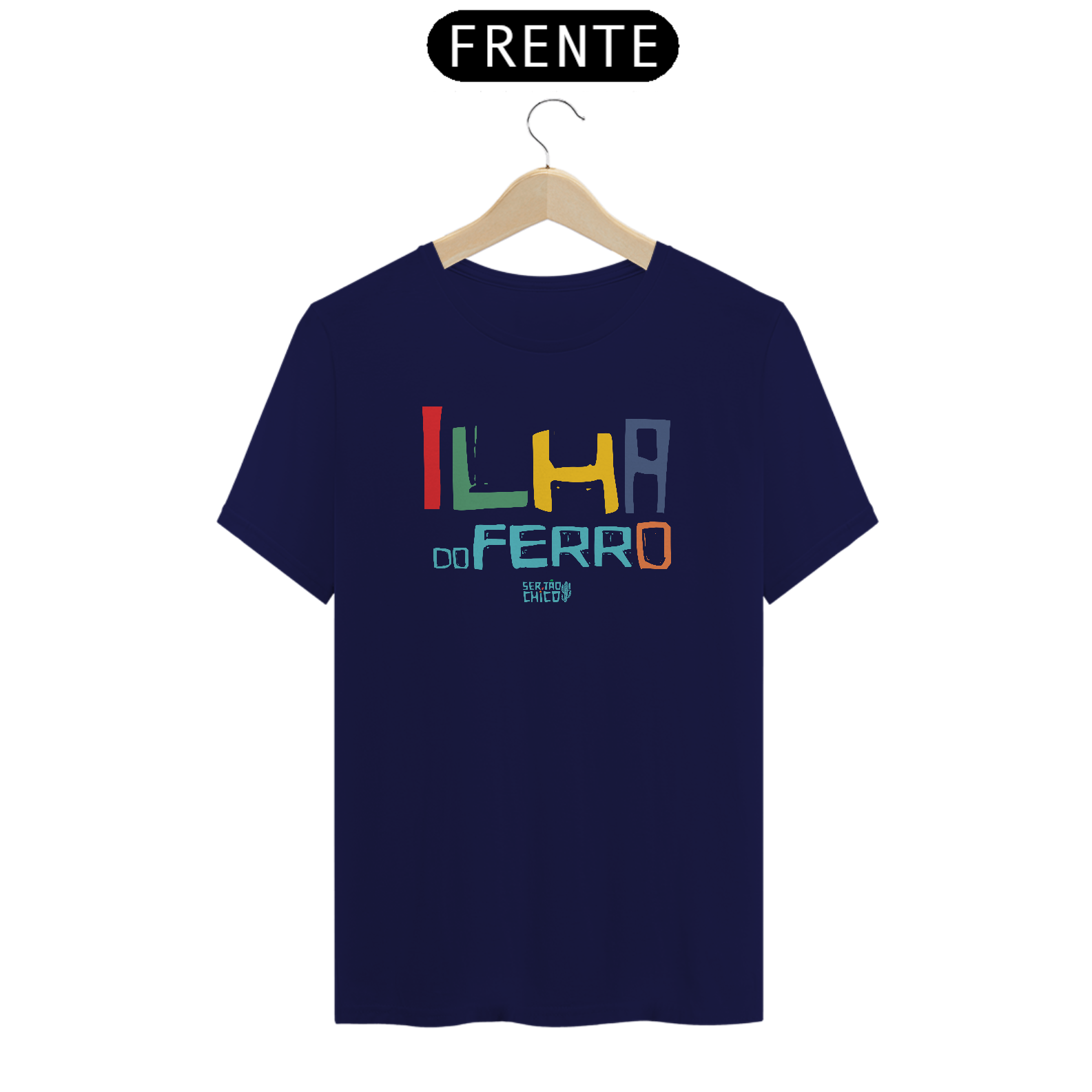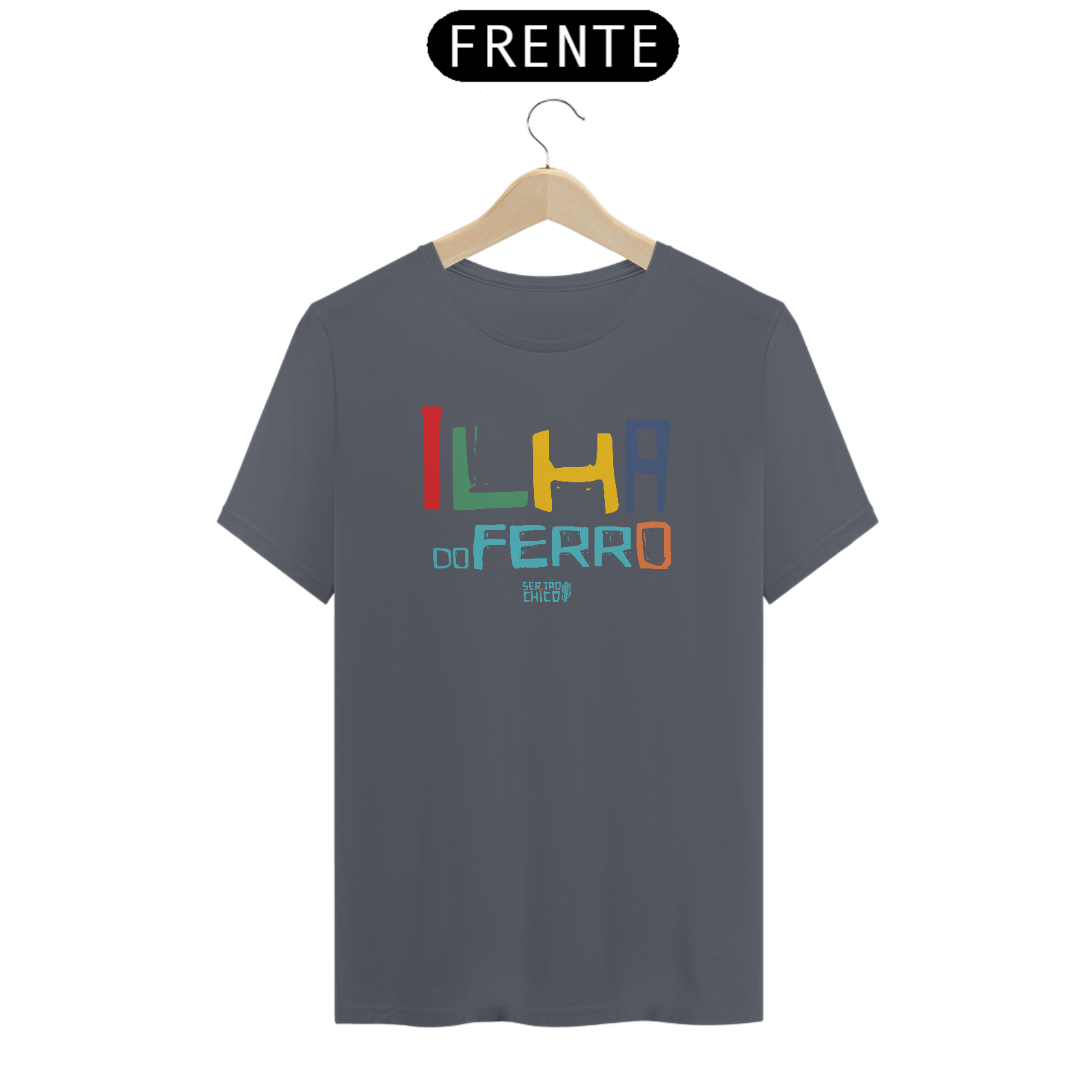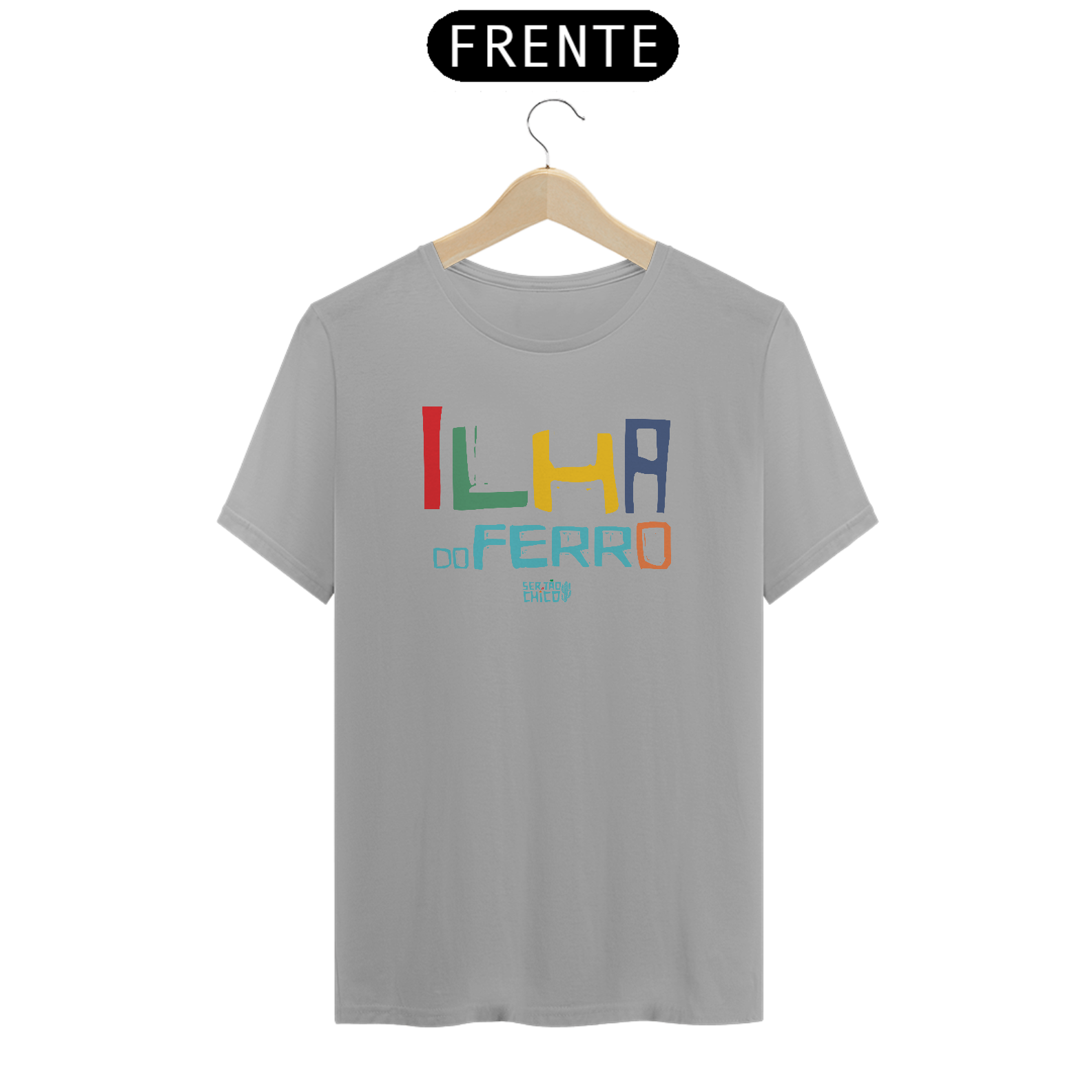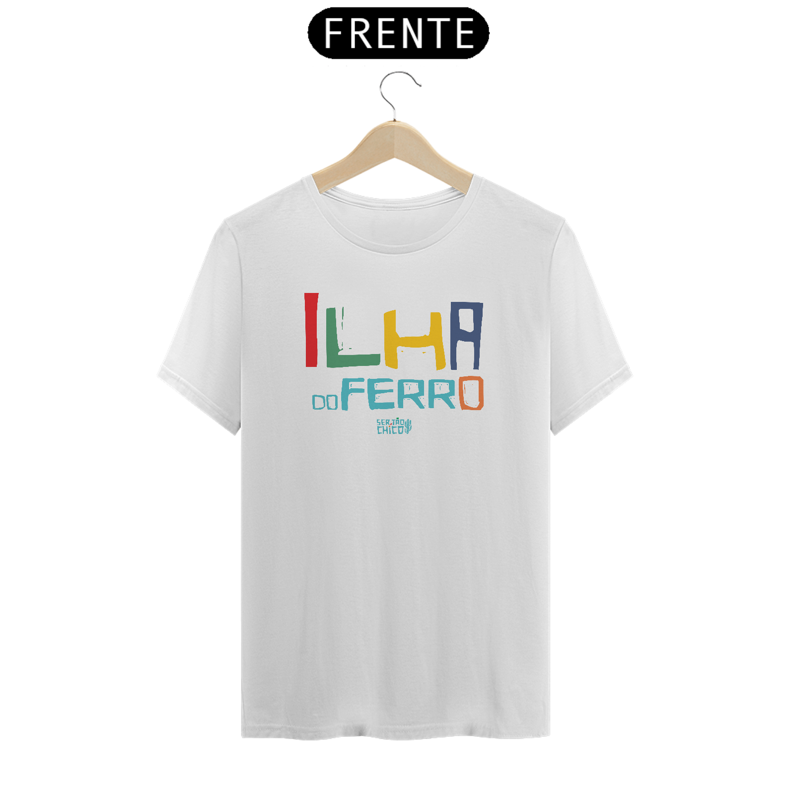 Camiseta em Malha 100% algodão com estampa "ILHA DO FERRO LETRAS COLORIAS"