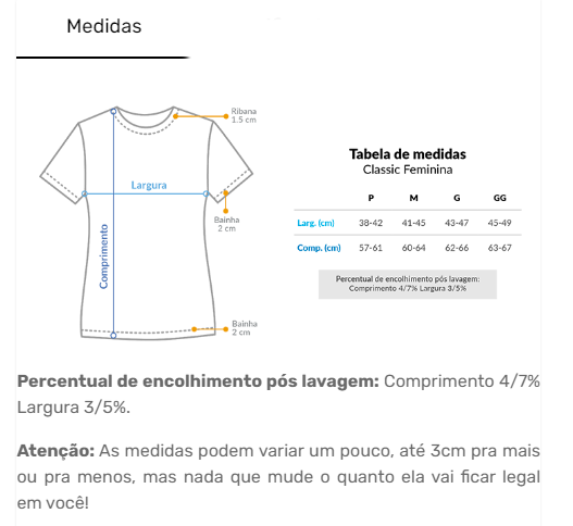 Cores do produto: Como cada tela de computador ou celular tem seu próprio jeito de mostrar cores, então a cor da sua camiseta e da estampa pode ser um pouco diferente do que você viu online.