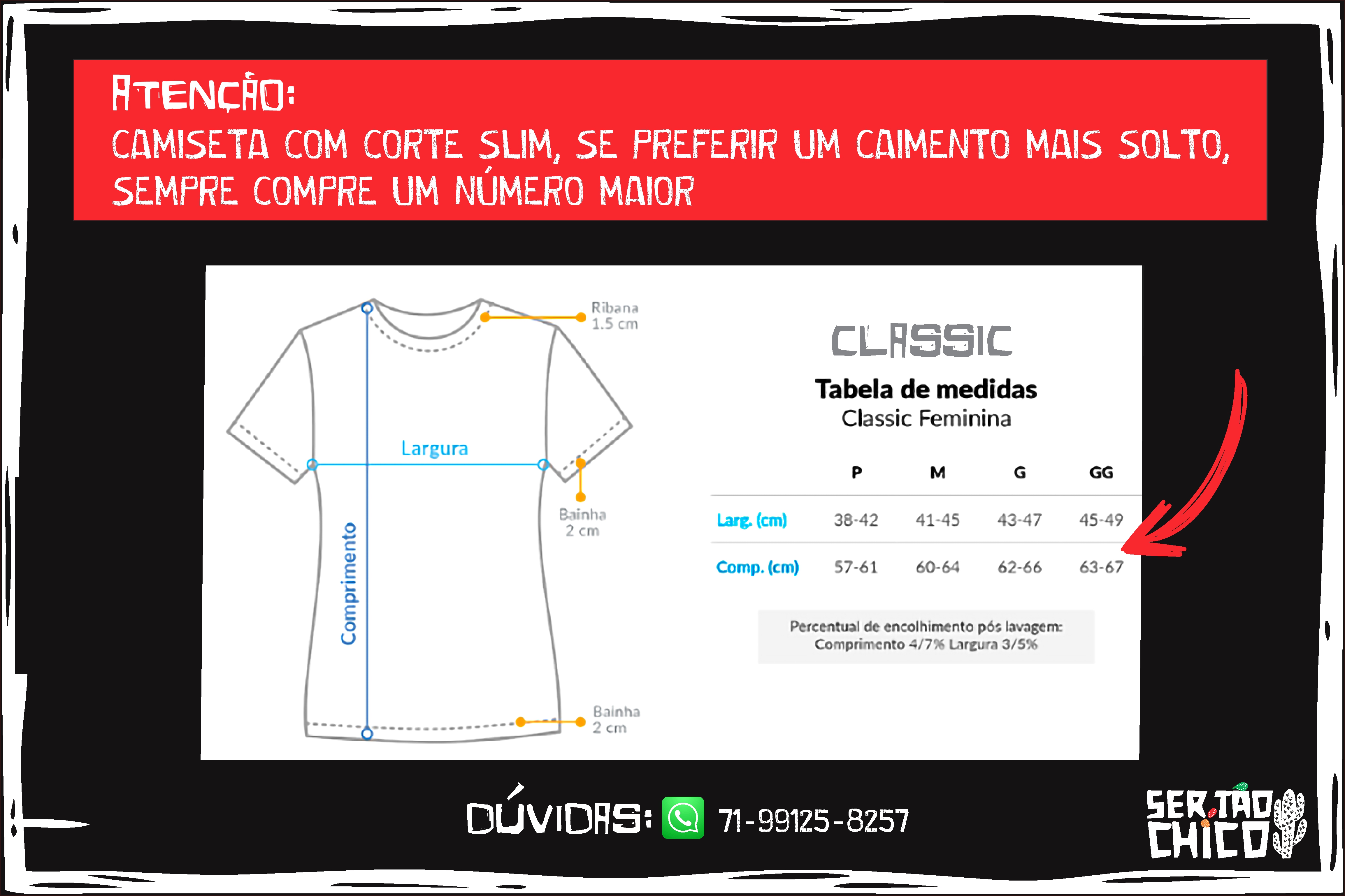 Atenção: As medidas podem variar um pouco, até 3cm pra mais ou pra menos, mas nada que mude o quanto ela vai ficar legal em você!