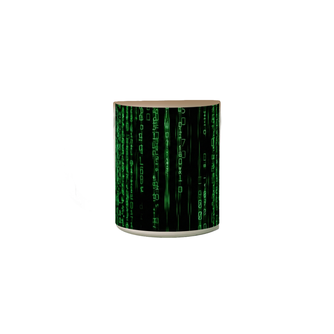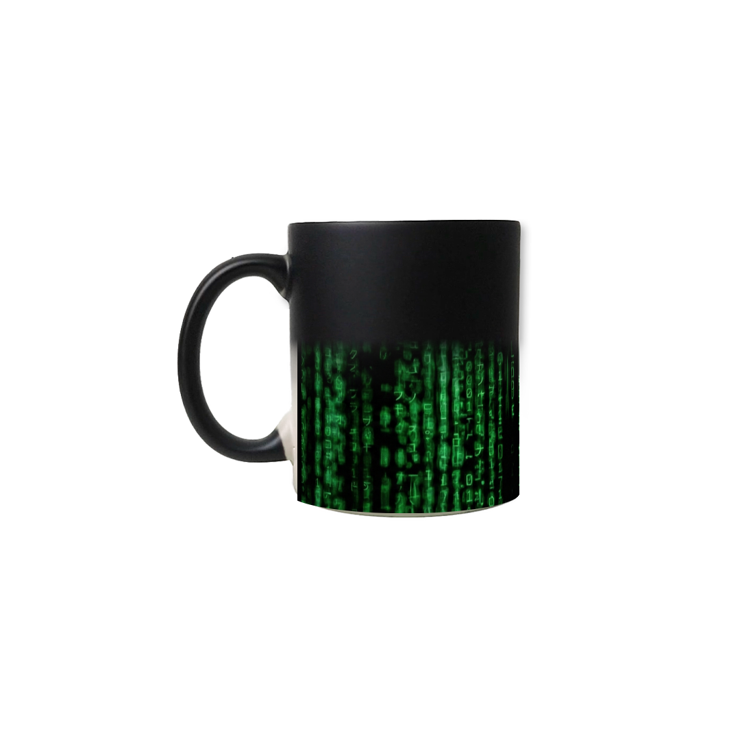 À primeira vista, uma caneca preta, sóbria e minimalista. Mas basta o contato com o calor para que o sistema seja hackeado e a verdadeira face da realidade seja revelada: o icônico código da Matrix.
