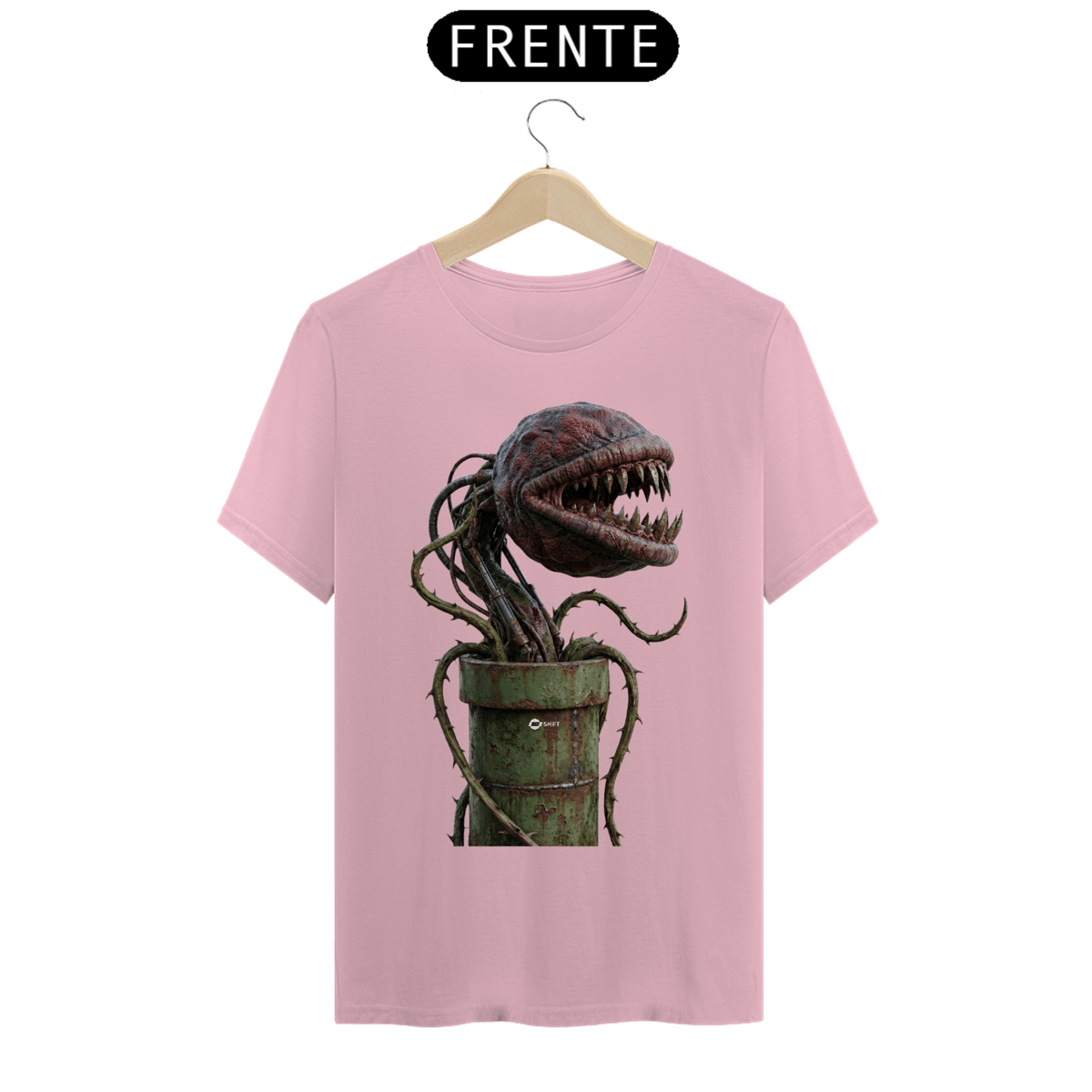 E se a fauna do Reino do Cogumelo evoluísse de forma agressiva? Esta estampa traz uma versão hiper-realista e biomecânica da clássica planta carnívora, emergindo de um cano industrial corroído. Uma peça visceral para quem gosta de subverter os clássicos da infância com um toque de terror sci-fi.