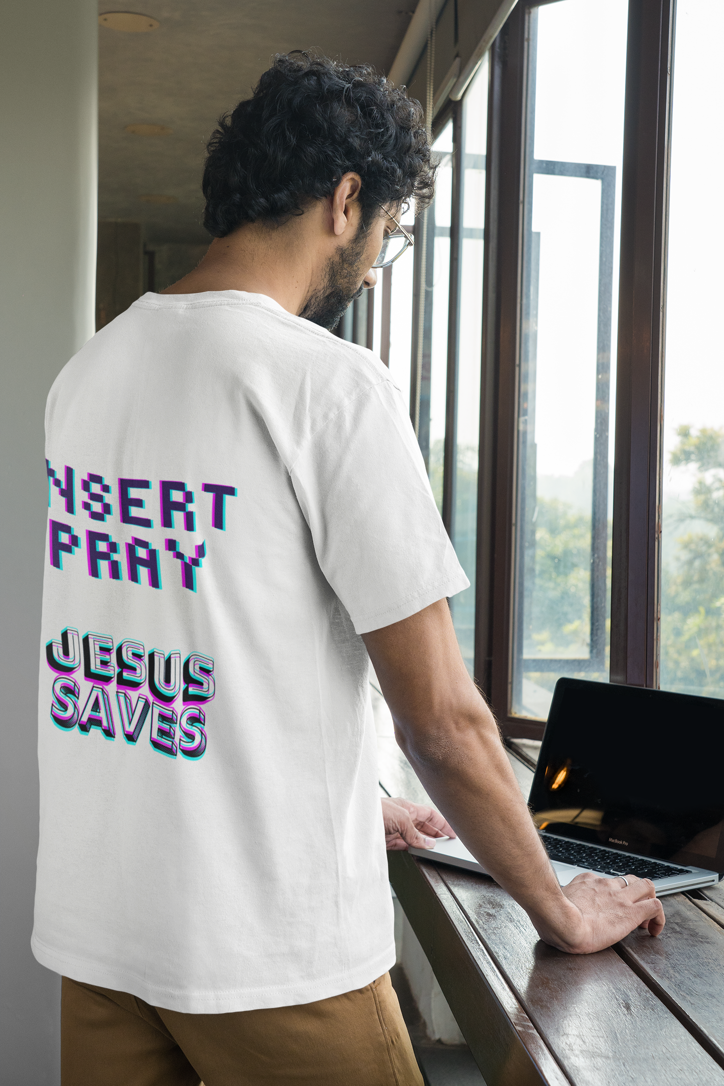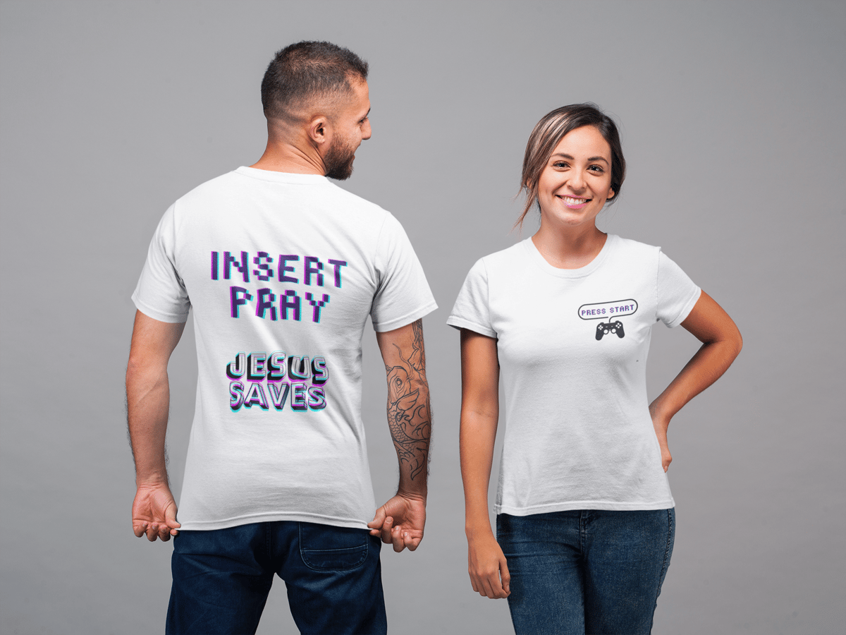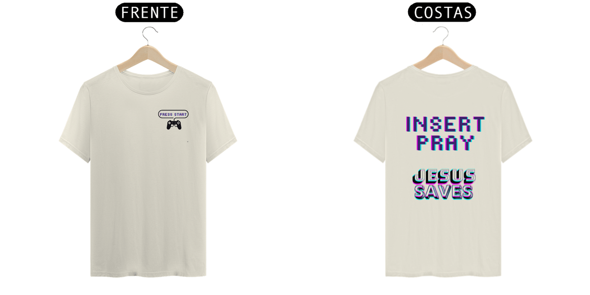 Estampa: A estampa, com um toque moderno e artístico, traz as inscrições "Insert Pray", "Jesus Saves" e "Press Start", ideal para jovens gamers, trazendo a mensagem de que Jesus está no controle das nossas vidas, e nos salva, mas lembre-se: "INSERT PRAY".