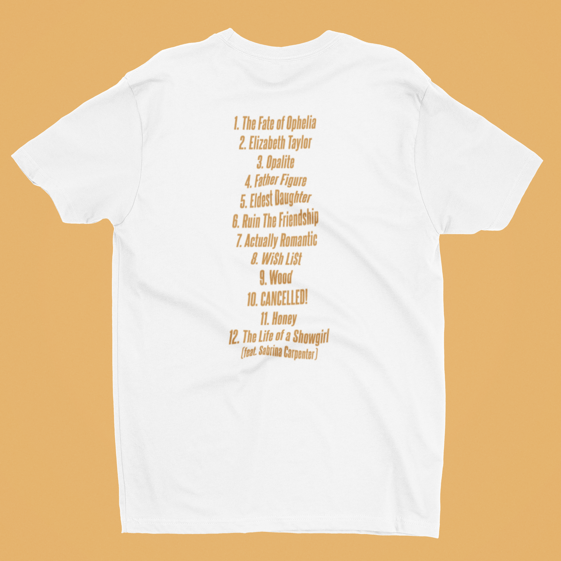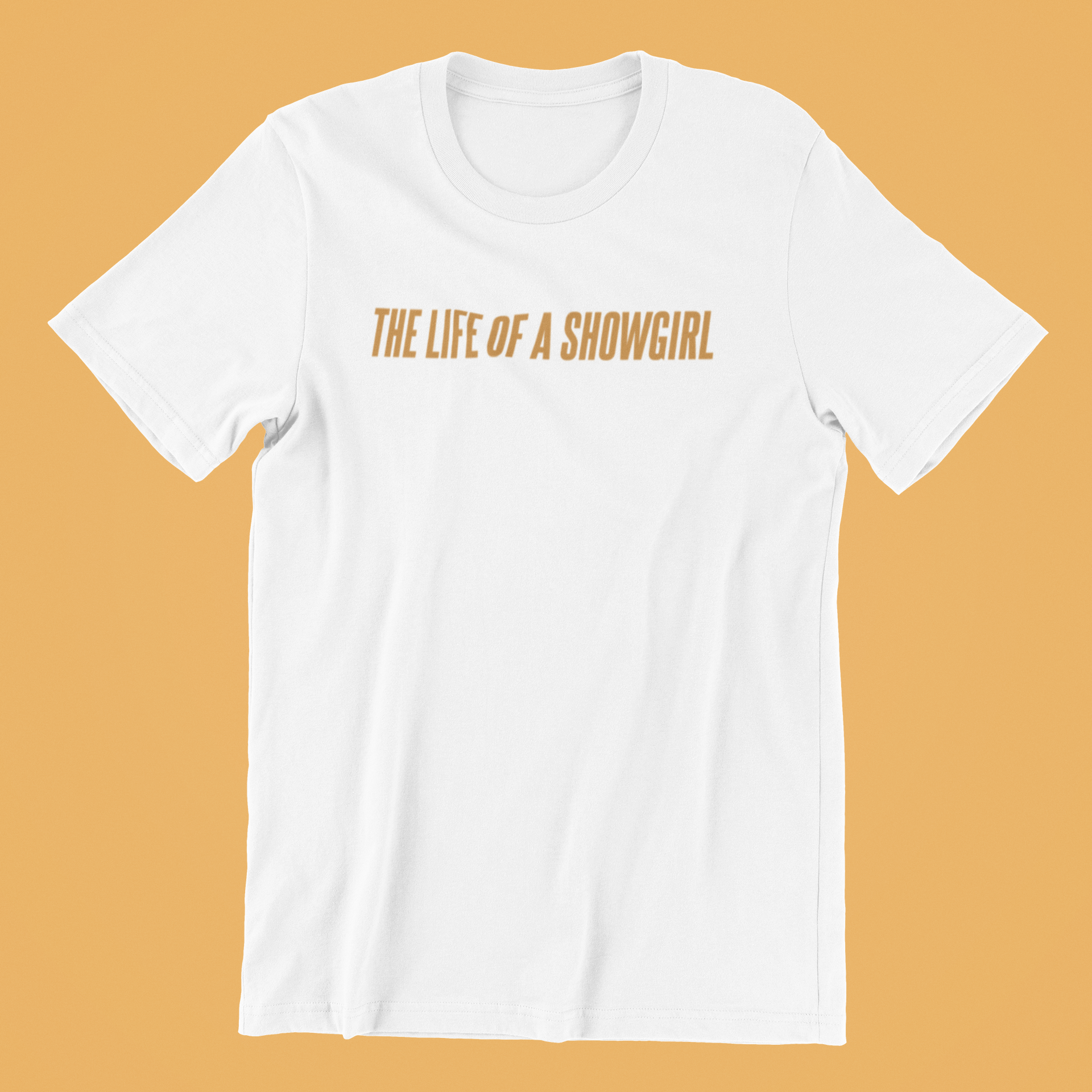 A Camiseta The Life of a Showgirl traz tipografia elegante na frente e, nas costas, uma tracklist com 12 faixas (inclui “feat. Sabrina Carpenter”). Visual clássico com letras douradas sobre base preta, ideal para montar looks casuais com jeans, saia ou jaqueta. Modelagem unissex, toque macio e impressão durável.