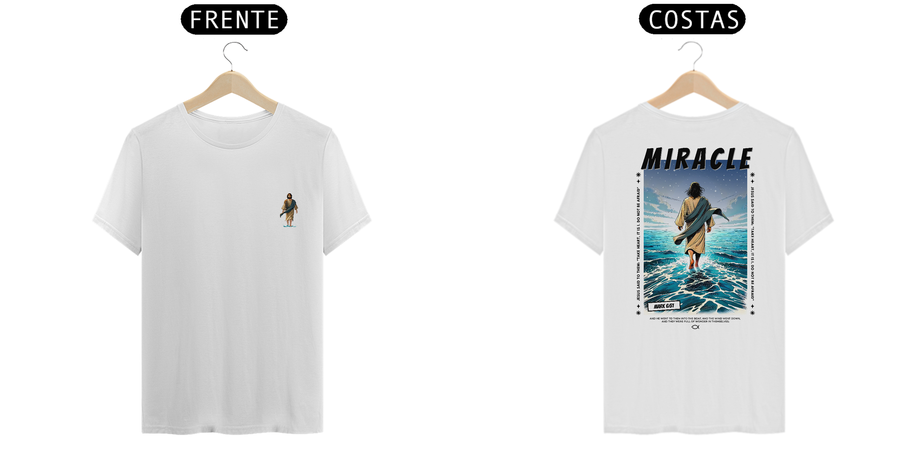 Significado da Estampa: Imagine a cena Jesus caminhando sobre as águas do Mar da Galiléia! Os discípulos estão no barco, apavorados com a tempestade. De repente, avistam Jesus, tranquilo, caminhando sobre as ondas. Pedro, com seu coração cheio de fé, pede para ir até Ele. Jesus responde: "Venha!". Pedro começa a andar, mas ao sentir o vento, duvida e começa a afundar. Jesus o segura e diz: "Homem de pouca fé, por que duvidou?". A frente dessa peça exibe Jesus caminhando, um símbolo poderoso de Sua liderança e tranquilidade em meio às tempestades da vida. Nas costas, a imagem de Jesus caminhando sobre o mar reforça a mensagem de fé e confiança inabalável. Essa estampa é um lembrete constante de que, mesmo nas dificuldades, podemos superar tudo mantendo nossos olhos fixos em Jesus. Permita que sua fé transborde e inspire aqueles ao seu redor. Você carrega a coragem de Pedro e a mão salvadora de Jesus. Mantenha-se firme, mesmo nas ondas mais turbulentas! Vista sua fé e inspire! ☀️✝️