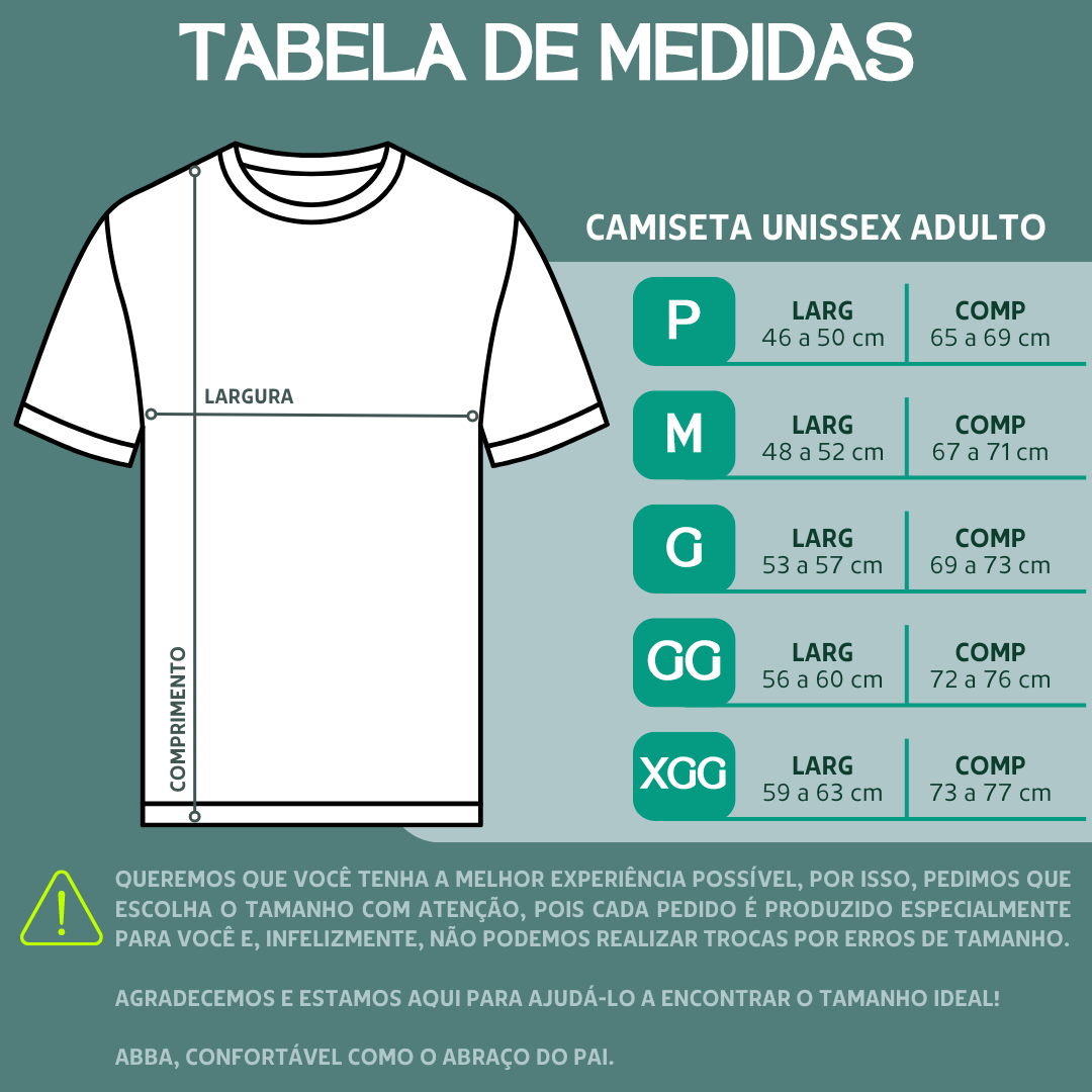 Cores do produto: Como cada tela de computador ou celular tem seu próprio jeito de mostrar cores, então a cor da sua camiseta e da estampa pode ser um pouco diferente do que você viu online.
