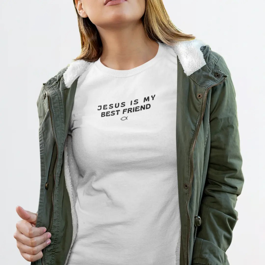 Estampada na frente com a frase "Jesus is My Best Friend: Jesus é meu melhor amigo", esta camiseta é confeccionada em 100% algodão de alta qualidade. Com costura reforçada e gola em ribana, esta peça oferece um toque macio e um conforto incrível!