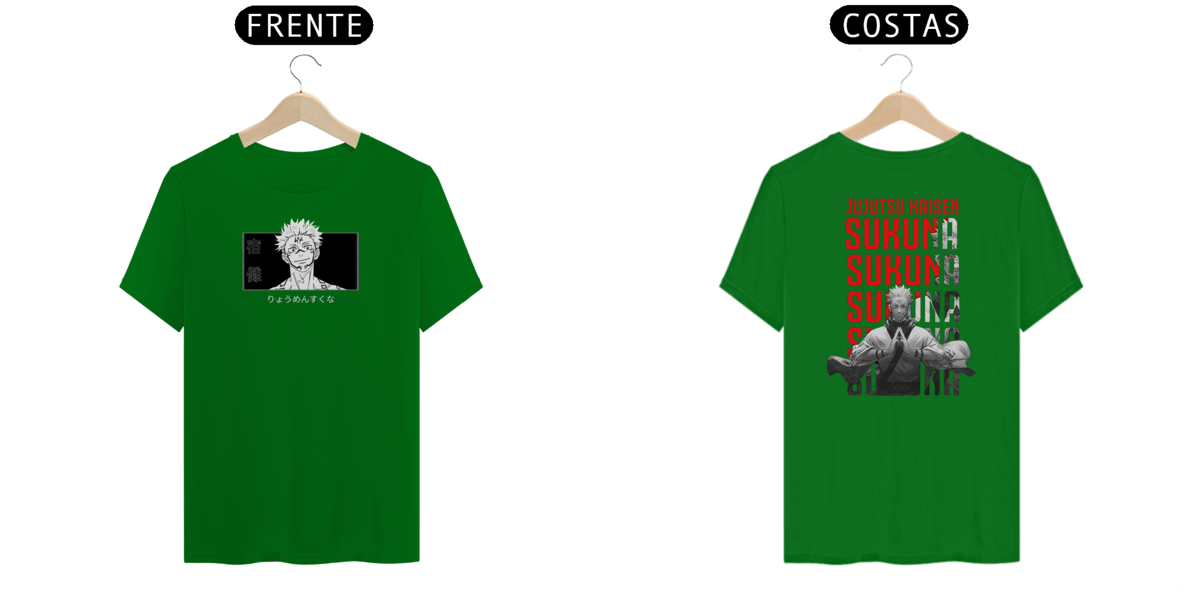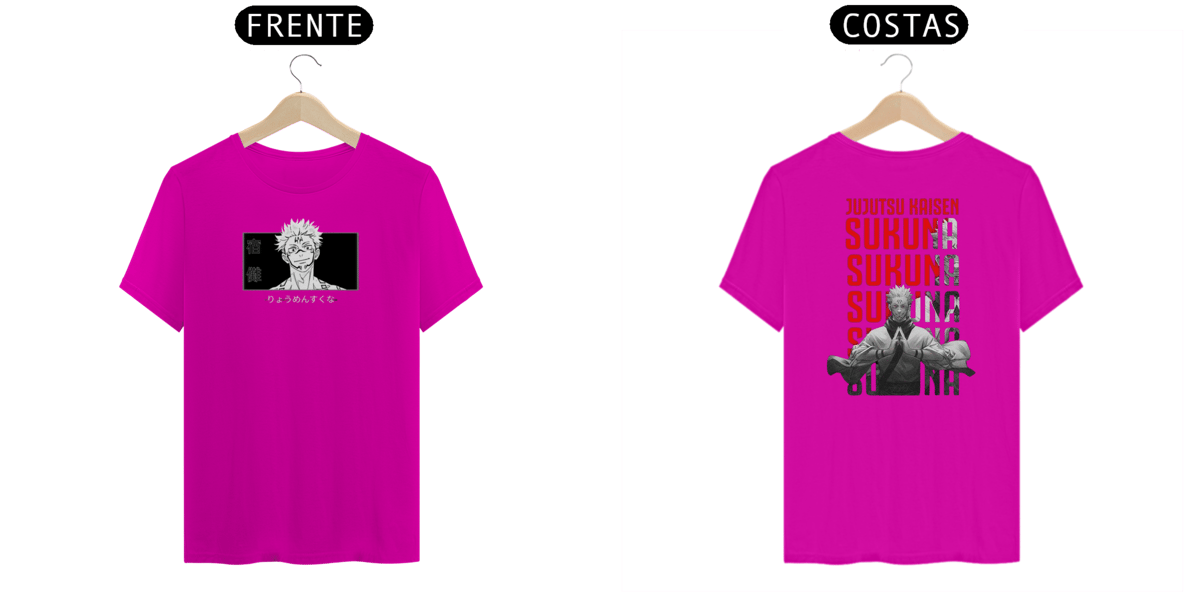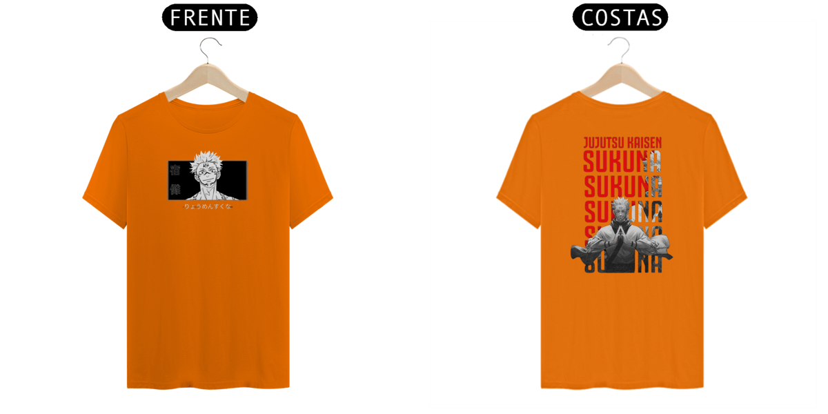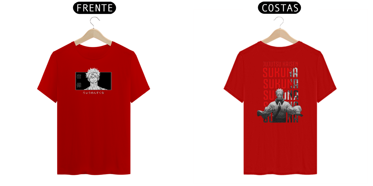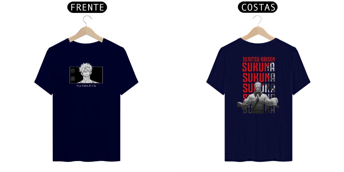 Camiseta com estampa impactante de Sukuna o mestre das Maldições, destacando seu rosto e tatuagens. Estilo urbano e ousado.