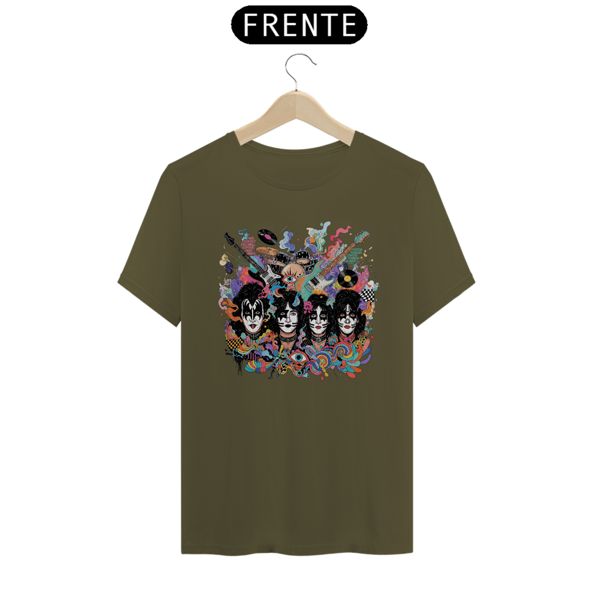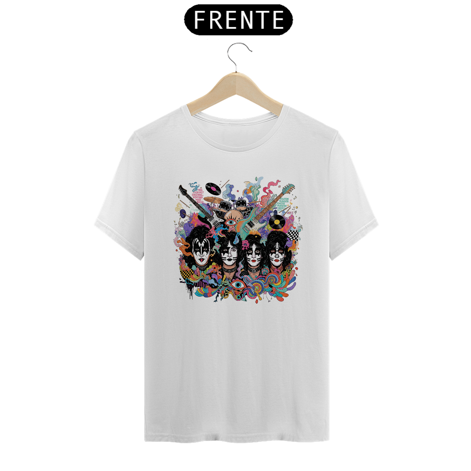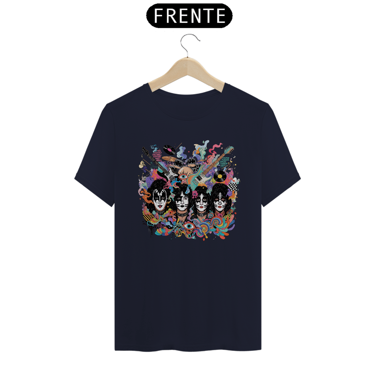Com uma estampa espetacular que reproduz as famosas maquiagens de Gene Simmons, Paul Stanley, Ace Frehley e Peter Criss, em um estilo artístico de "splash" e cores neon psicodélicas, esta camiseta é um convite para mergulhar no universo grandioso do hard rock. Elementos de instrumentos musicais ao fundo complementam o design, criando um visual que é puro rock'n'roll e arte pop.