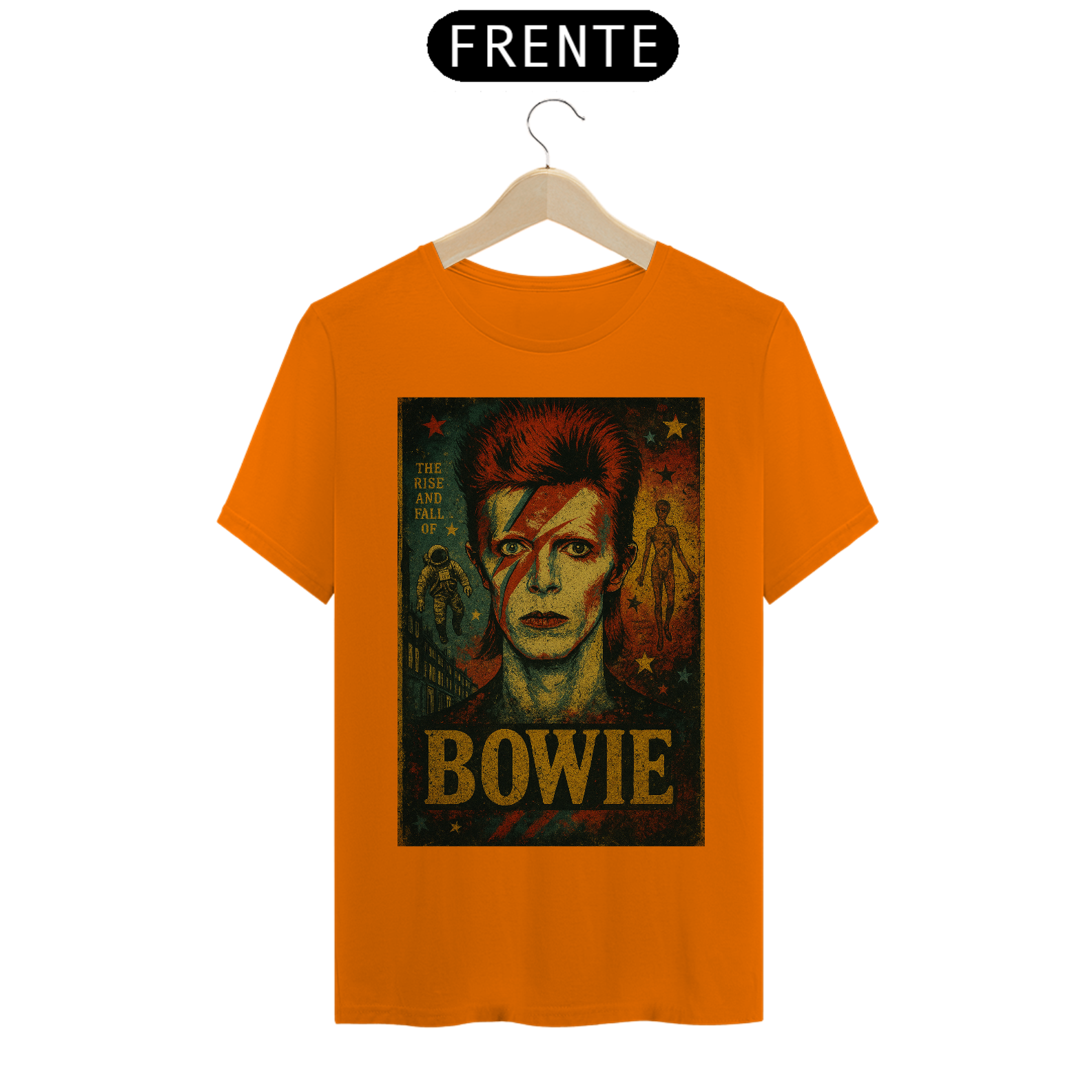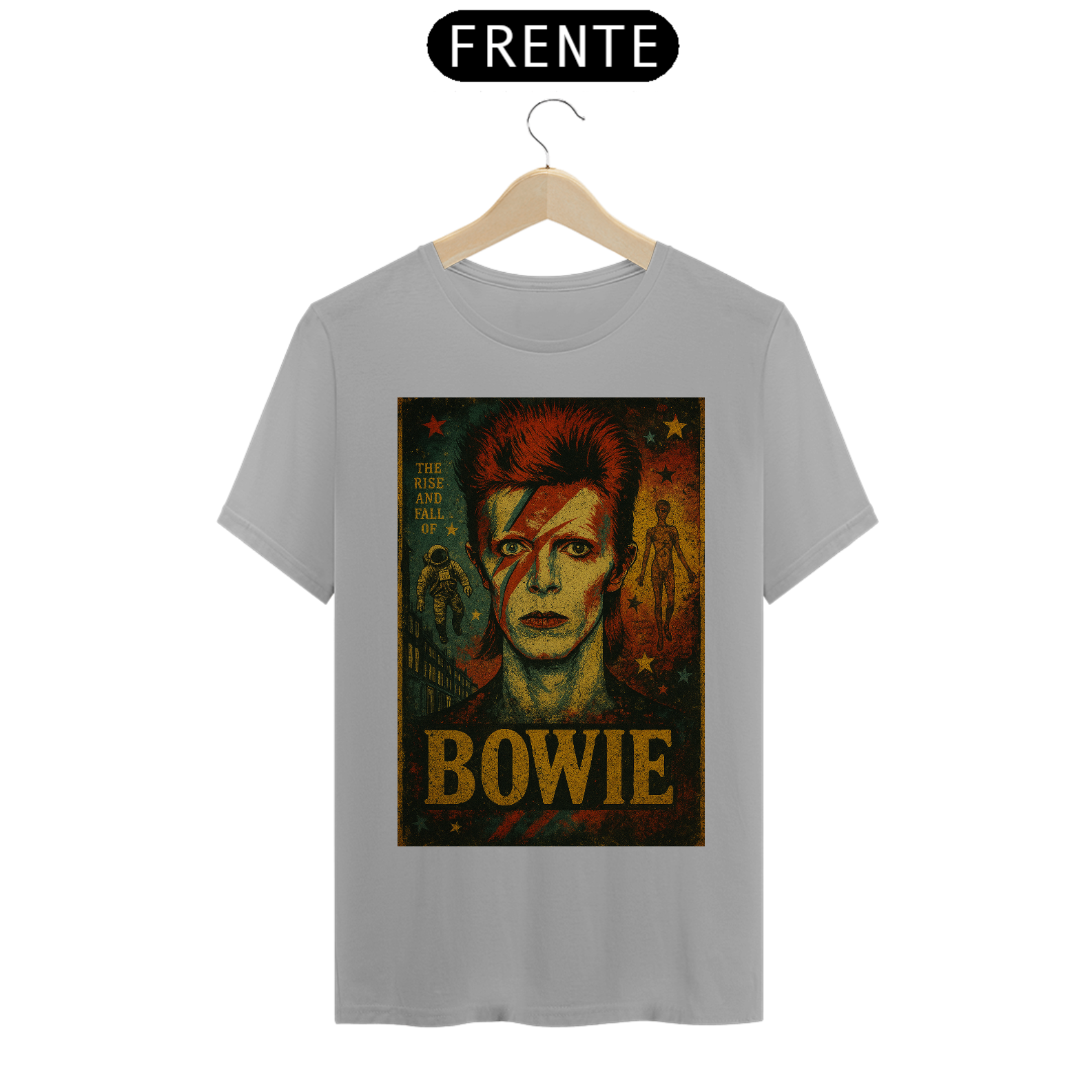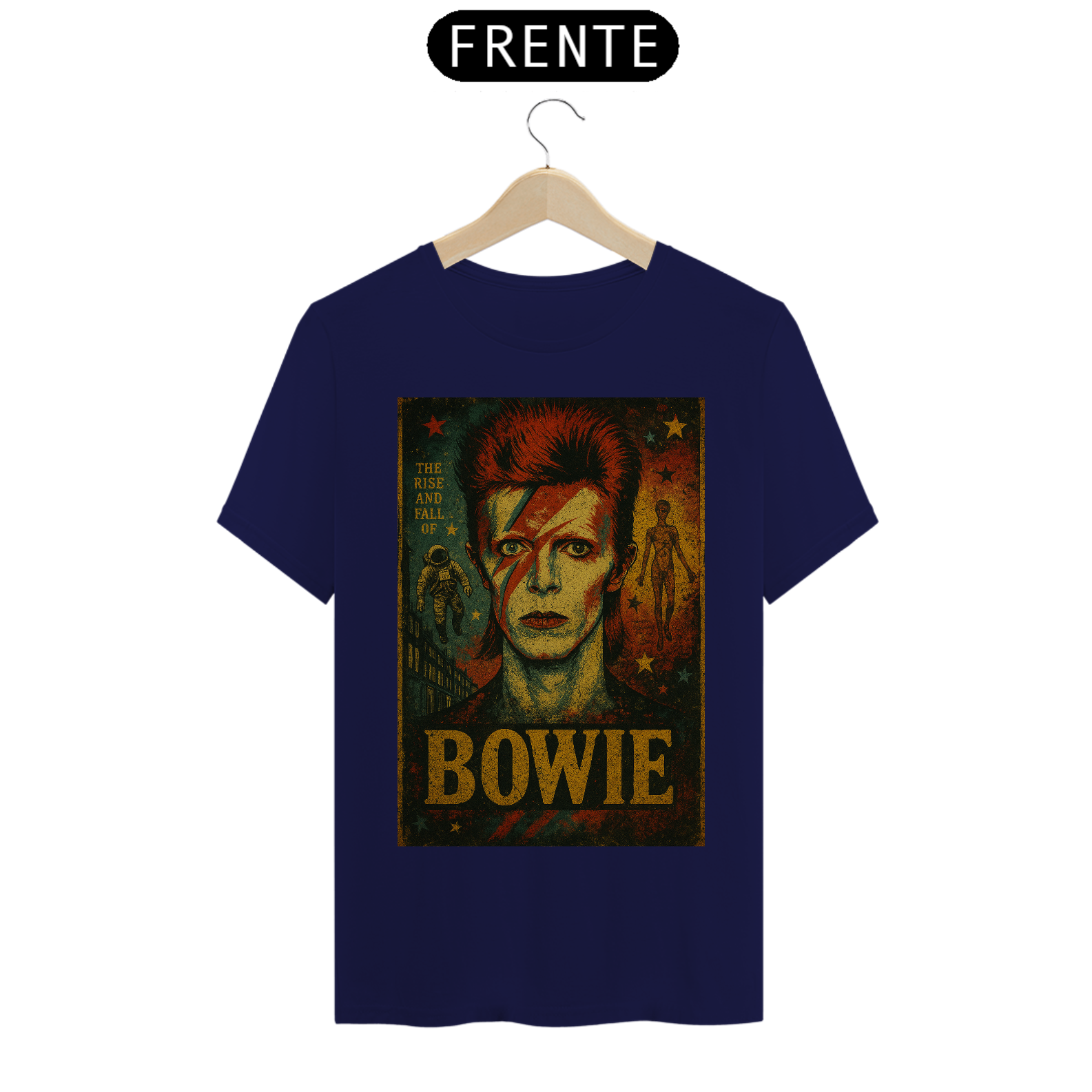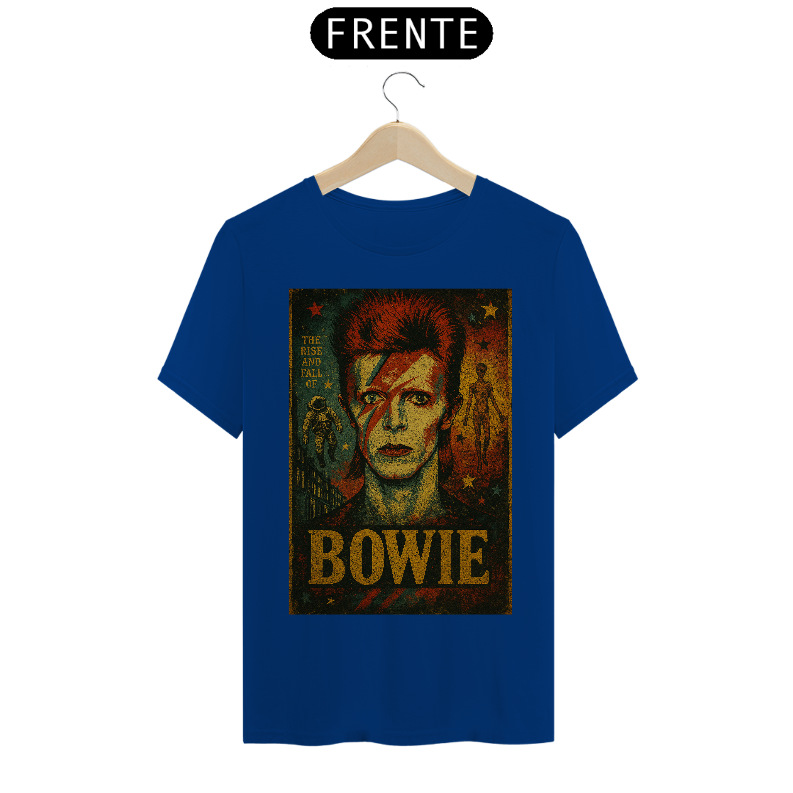 Com uma estampa estilizada que reproduz o lendário visual de Ziggy – o raio no rosto, o cabelo marcante e o olhar hipnotizante – esta camiseta é um convite para mergulhar na era glam rock dos anos 70. Detalhes que remetem ao álbum "The Rise and Fall of Ziggy Stardust" adicionam um toque autêntico para os fãs mais dedicados. É a escolha perfeita para quem busca expressar sua paixão pelo rock, pela arte e por um dos maiores visionários da história da música.