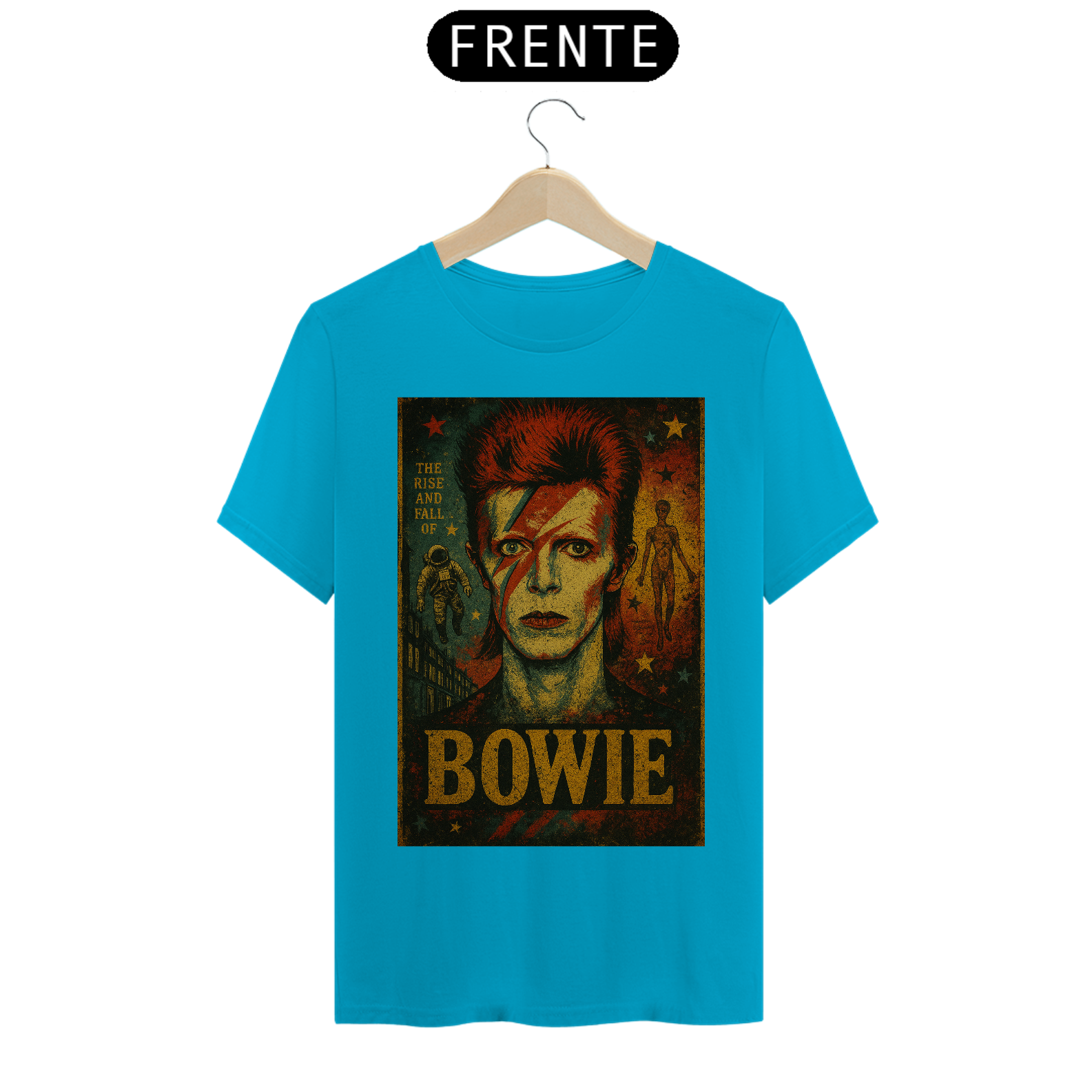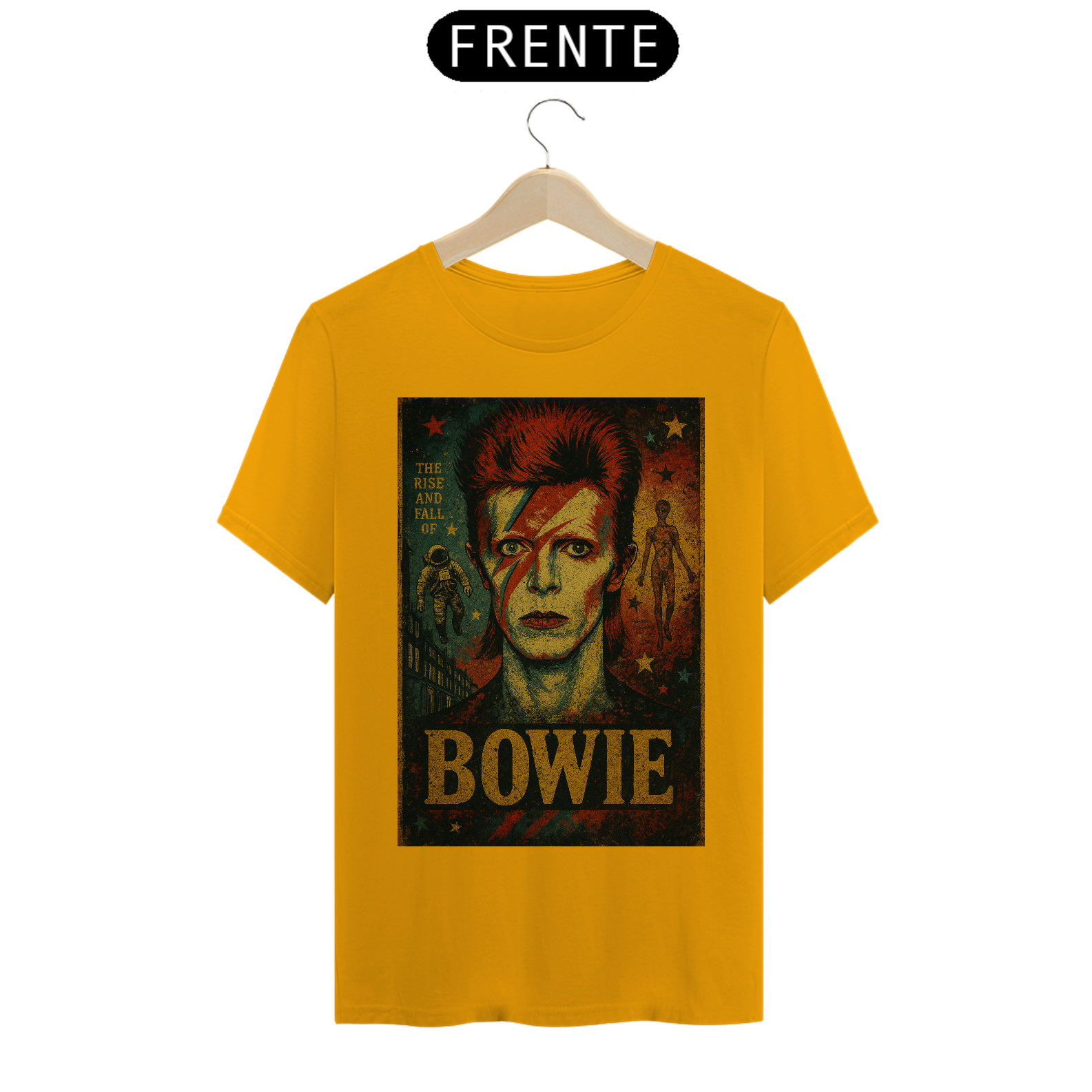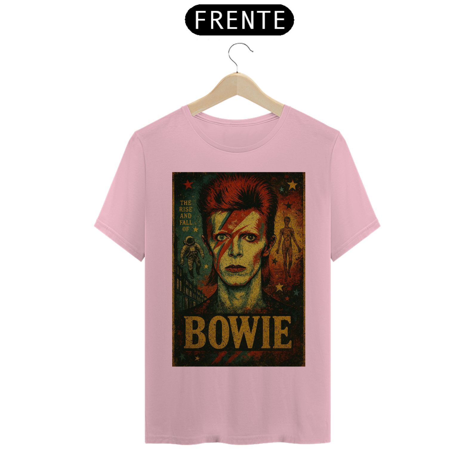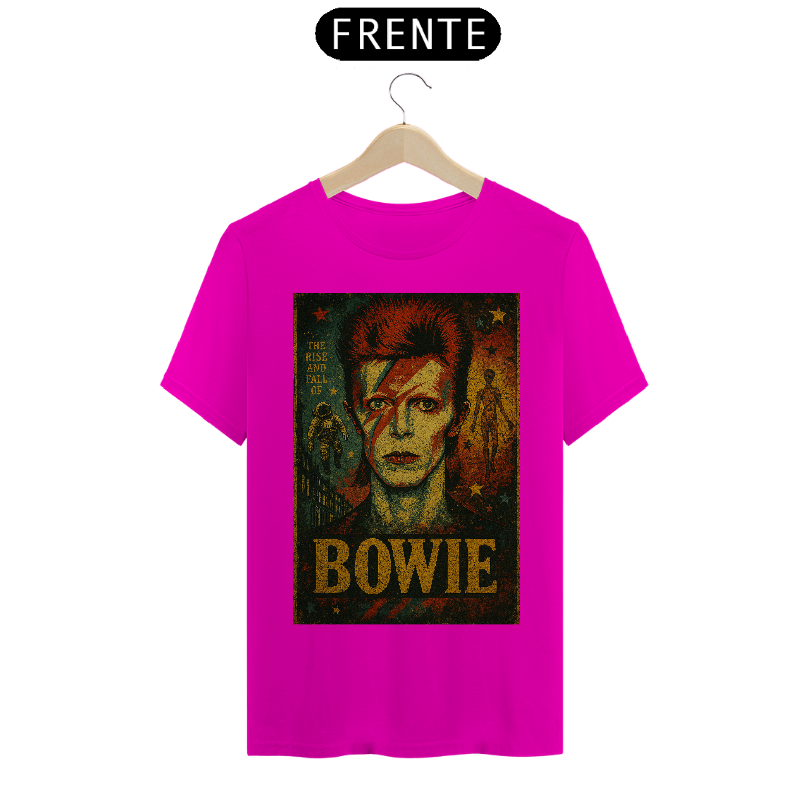 Com uma estampa estilizada que reproduz o lendário visual de Ziggy – o raio no rosto, o cabelo marcante e o olhar hipnotizante – esta camiseta é um convite para mergulhar na era glam rock dos anos 70. Detalhes que remetem ao álbum "The Rise and Fall of Ziggy Stardust" adicionam um toque autêntico para os fãs mais dedicados. É a escolha perfeita para quem busca expressar sua paixão pelo rock, pela arte e por um dos maiores visionários da história da música.