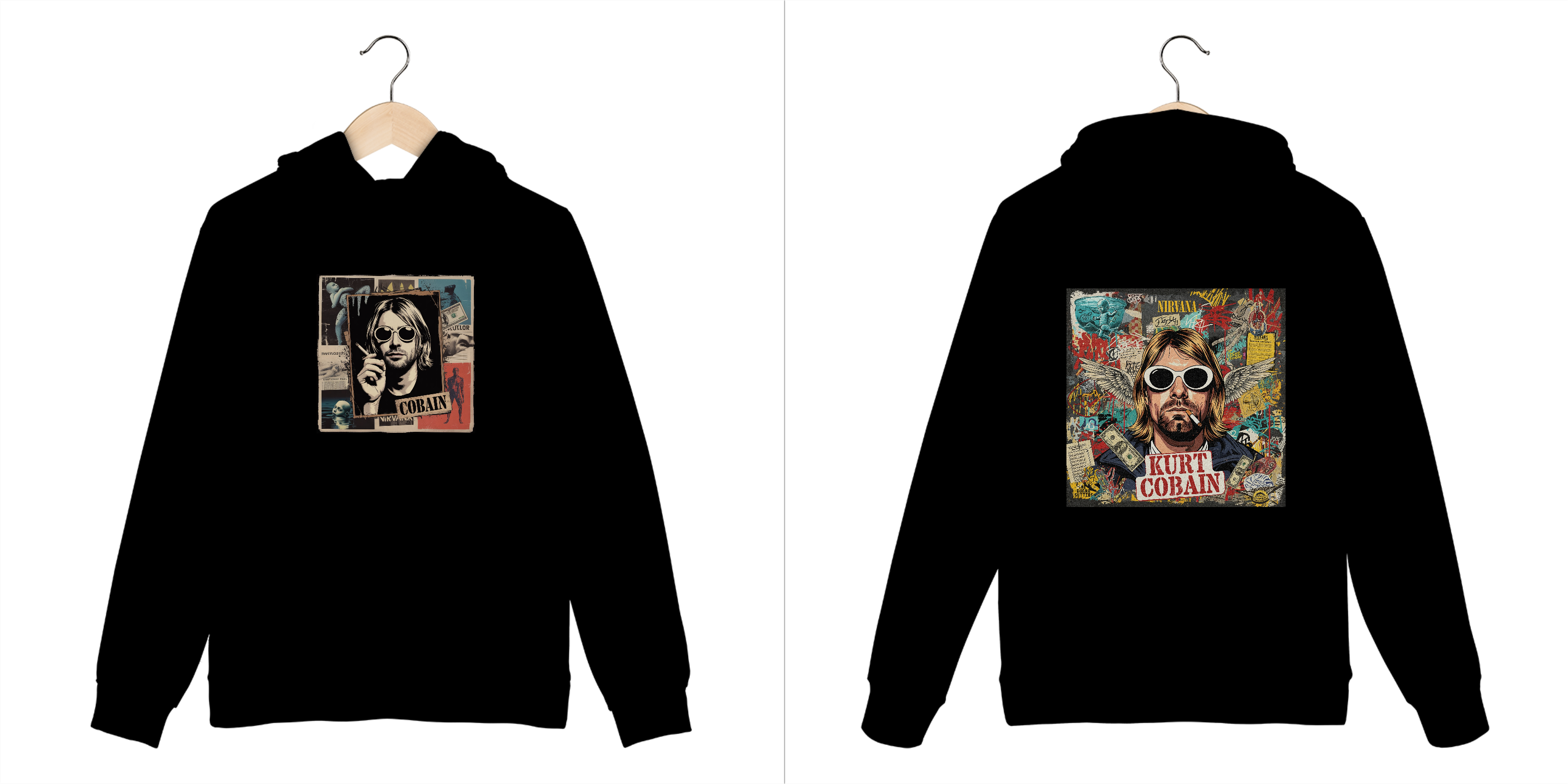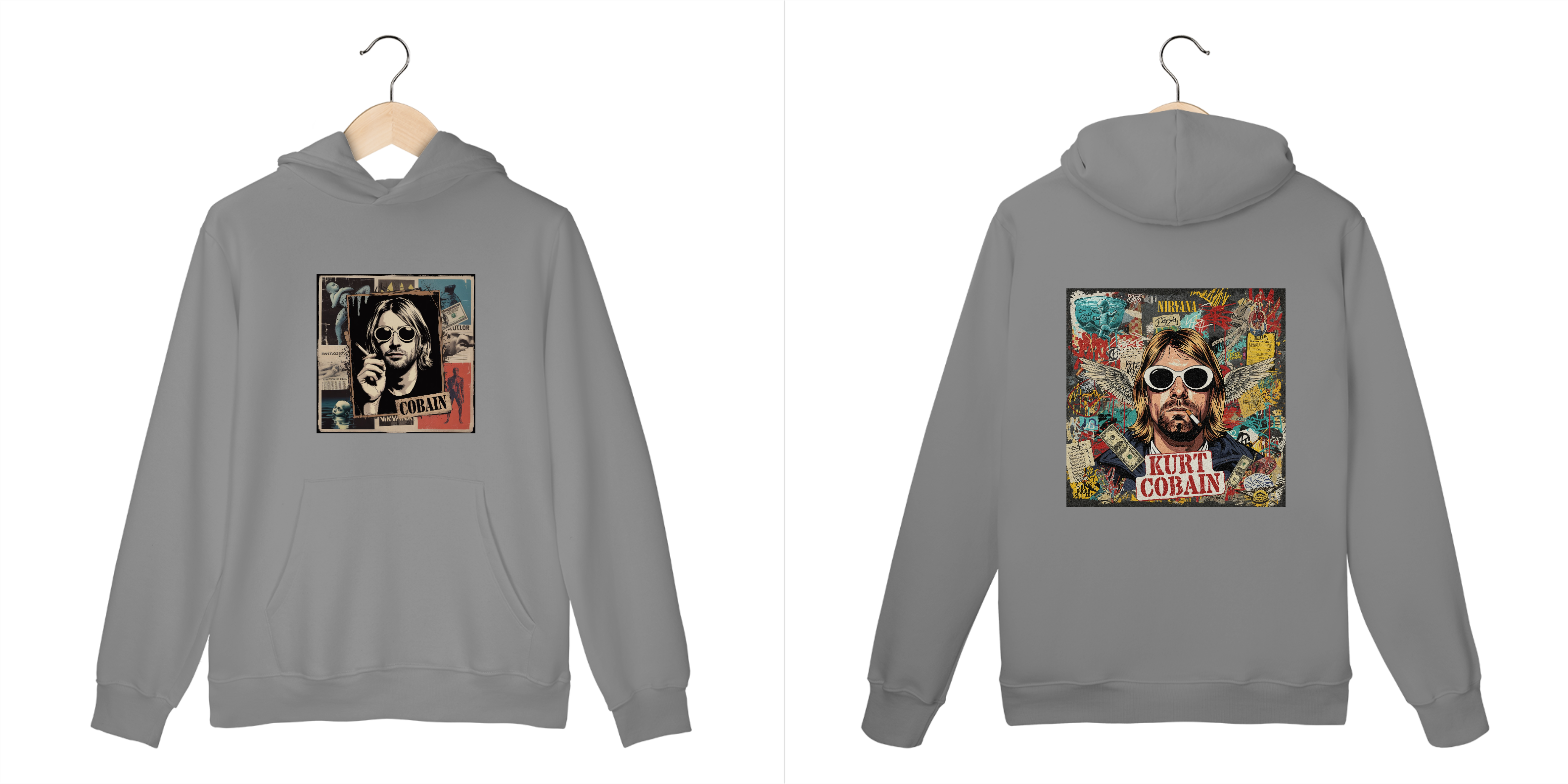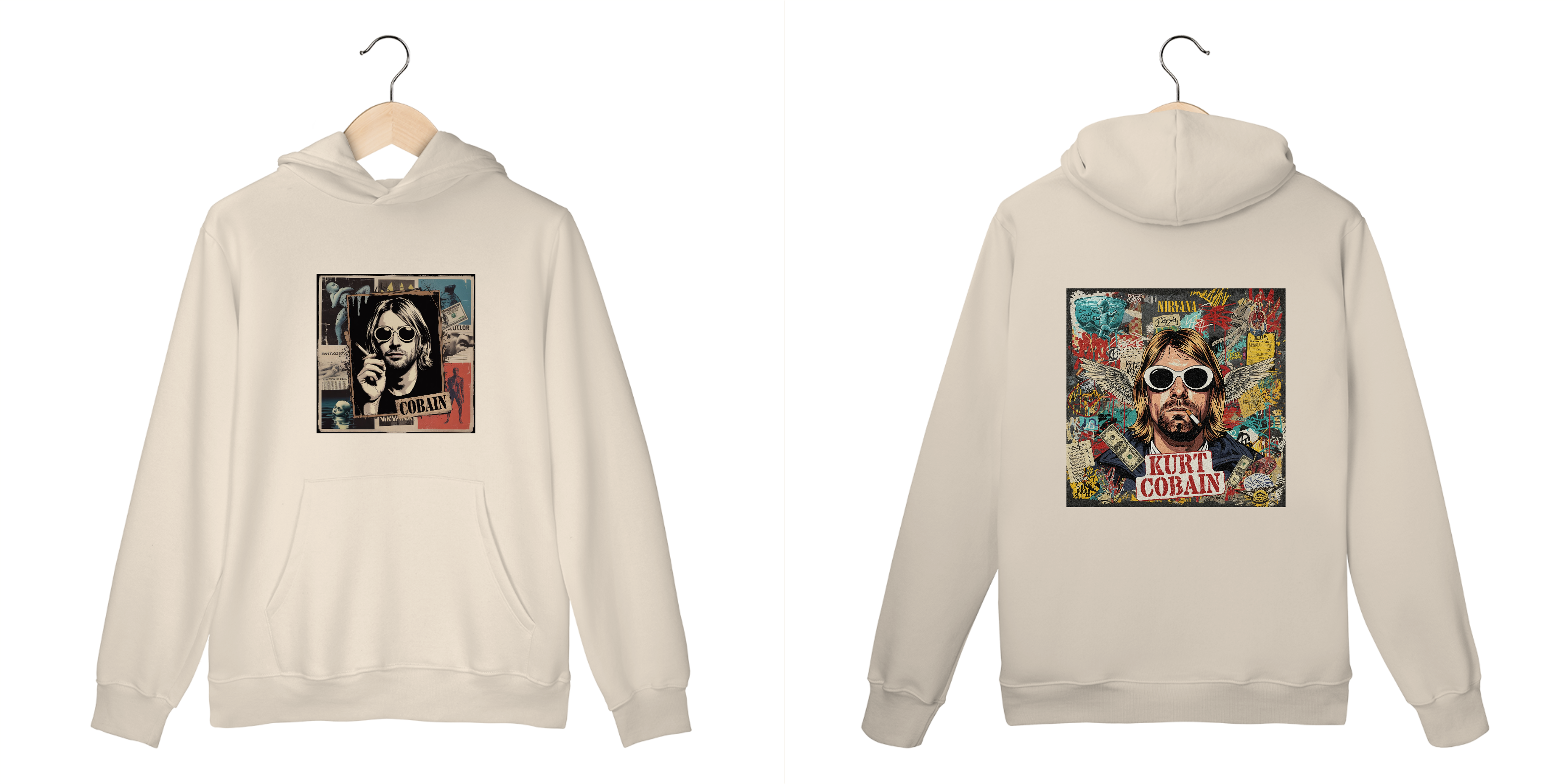 Com uma estampa de colagem única, que captura o olhar enigmático de Kurt e mescla referências da cultura grunge e punk dos anos 90, esta peça é mais do que um agasalho – é uma declaração de estilo. Os elementos de fanzine e o visual vintage trazem a nostalgia de uma era que revolucionou a música.