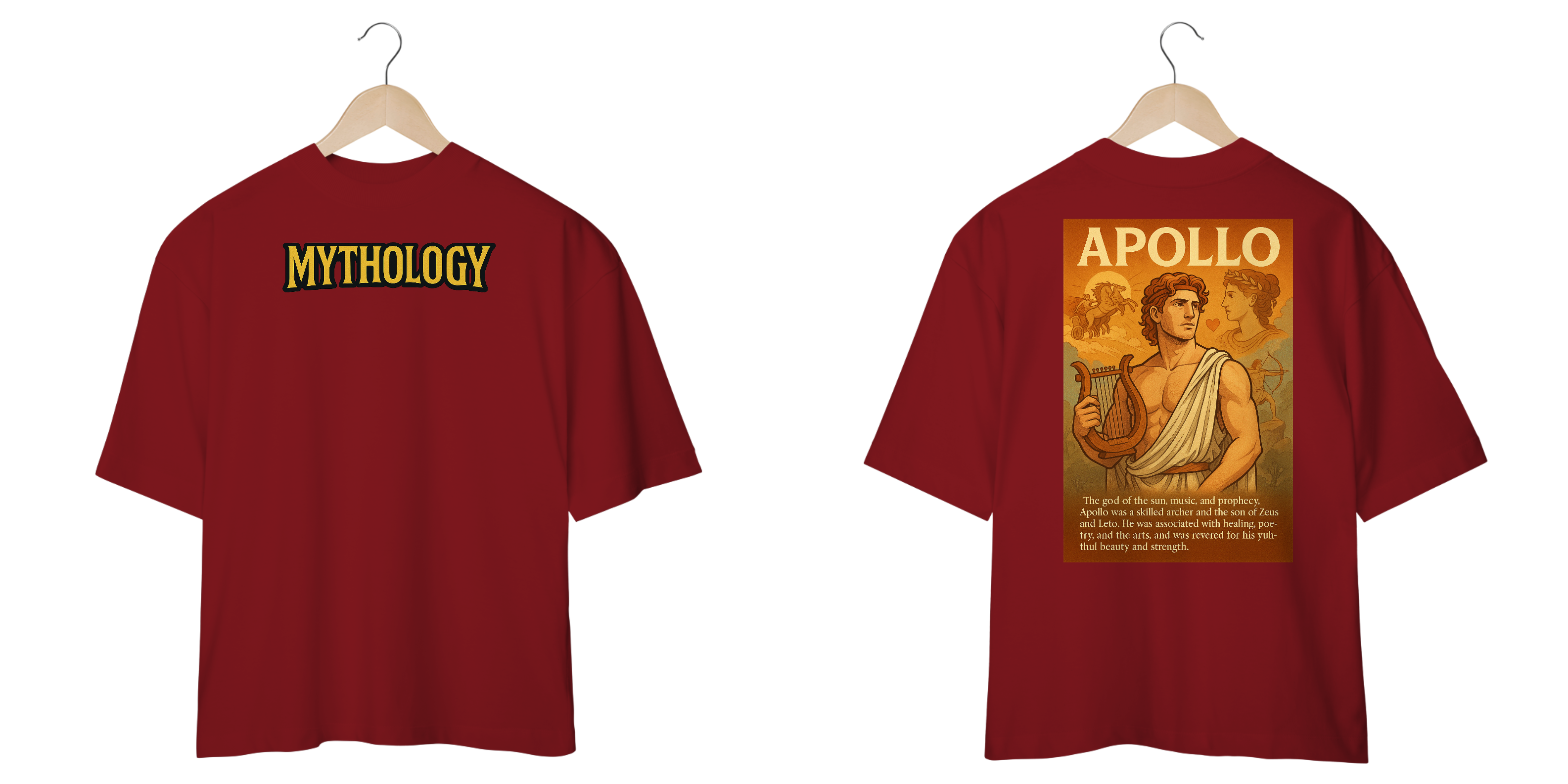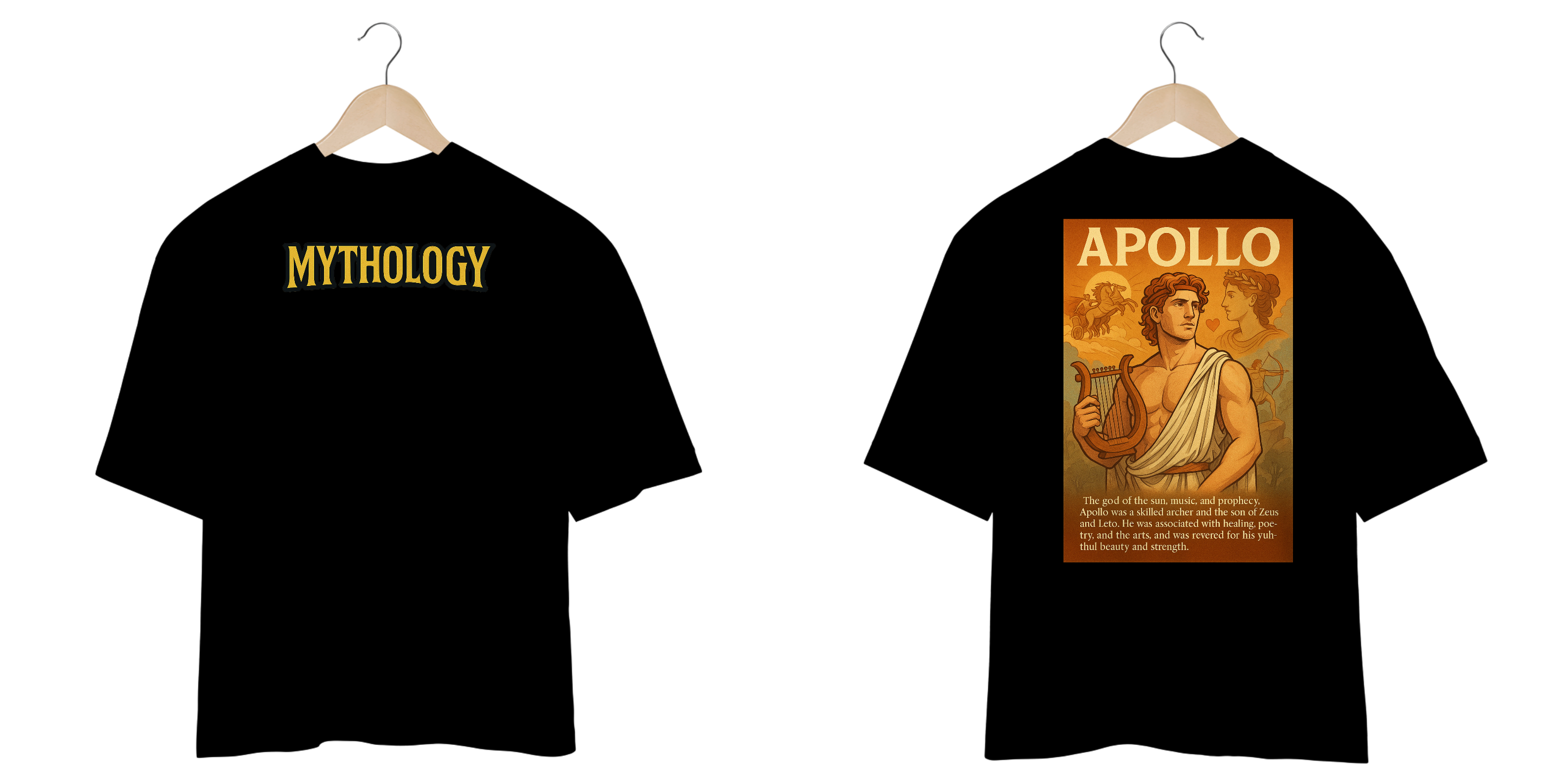 Na frente, a palavra "MYTHOLOGY" em destaque já anuncia sua paixão por histórias épicas. Nas costas, a figura radiante de Apolo irradia a essência da sabedoria e da arte em uma estampa clássica e detalhada, acompanhada de seu nome. Esta camiseta é um item obrigatório para quem admira a cultura geek, a estética artística, o estilo streetwear e todos que buscam uma peça com profundidade e um visual marcante.