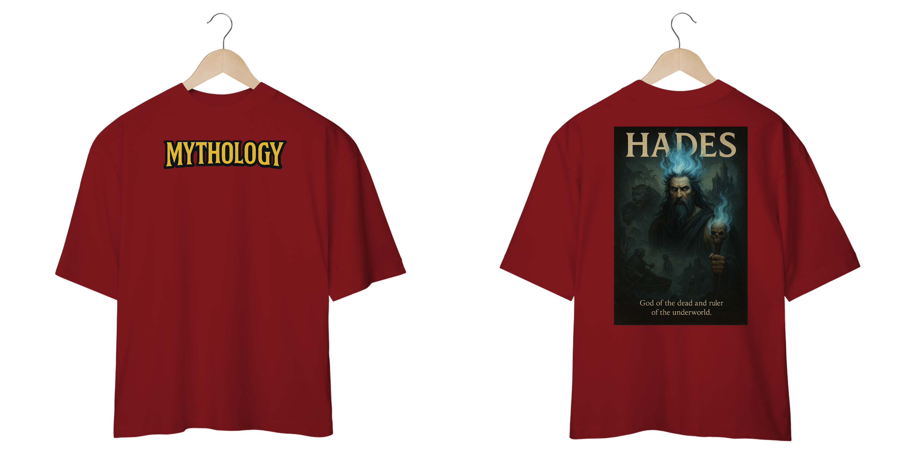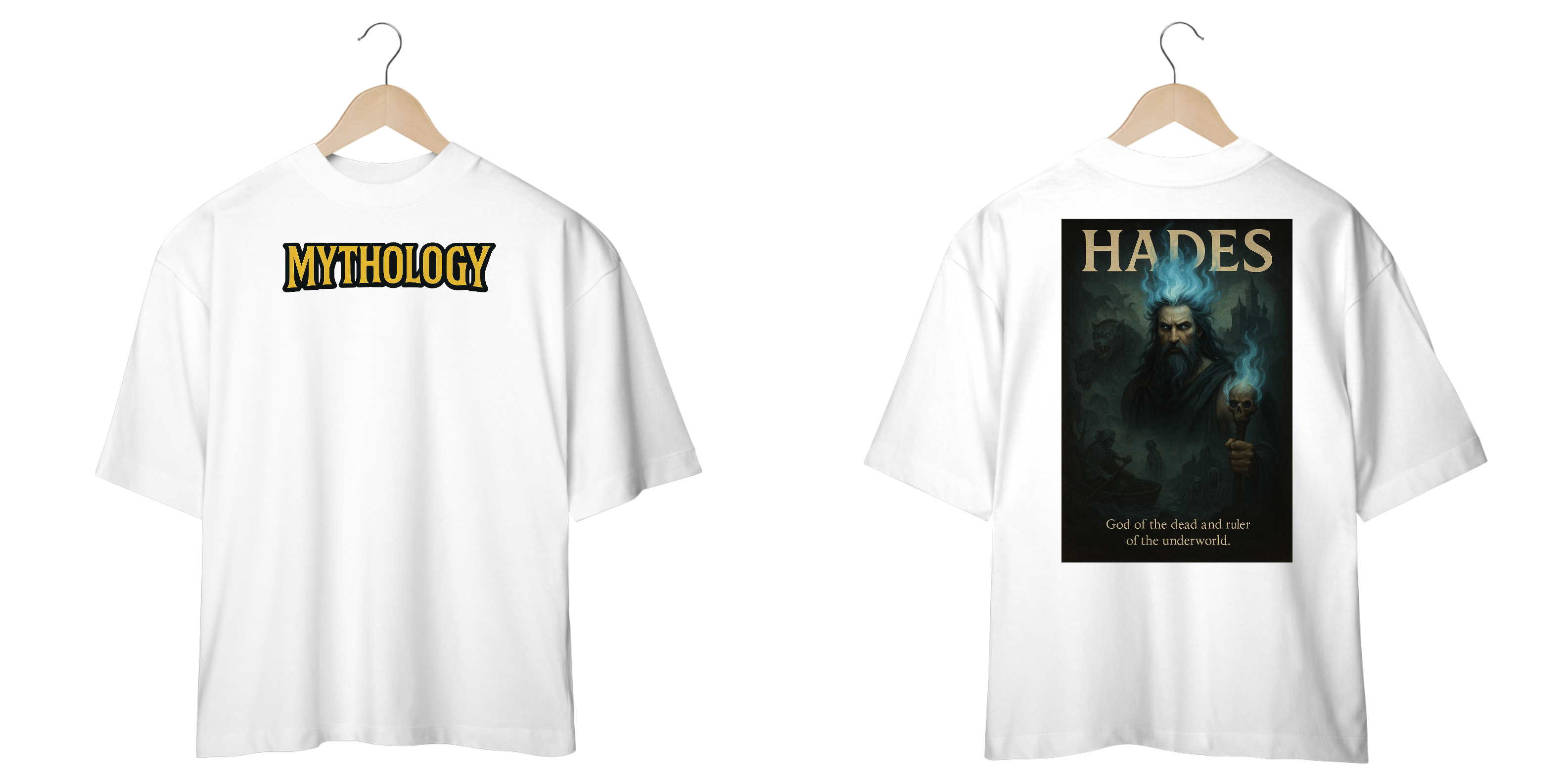 Esta peça é a combinação perfeita entre o conforto inigualável do caimento over size e um design que exala poder e misticismo. Na frente, a palavra "MYTHOLOGY" em destaque já anuncia sua paixão pelos contos ancestrais. Nas costas, a figura imponente de Hades, o governante do submundo, emerge em uma estampa épica e sombria, complementada por seu nome, fazendo desta camiseta um verdadeiro item de culto para quem admira a cultura geek, gótica ou o estilo streetwear.