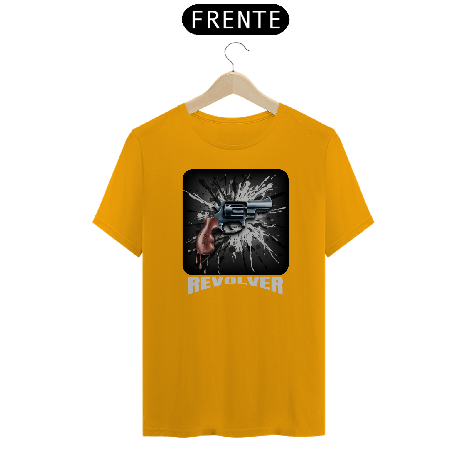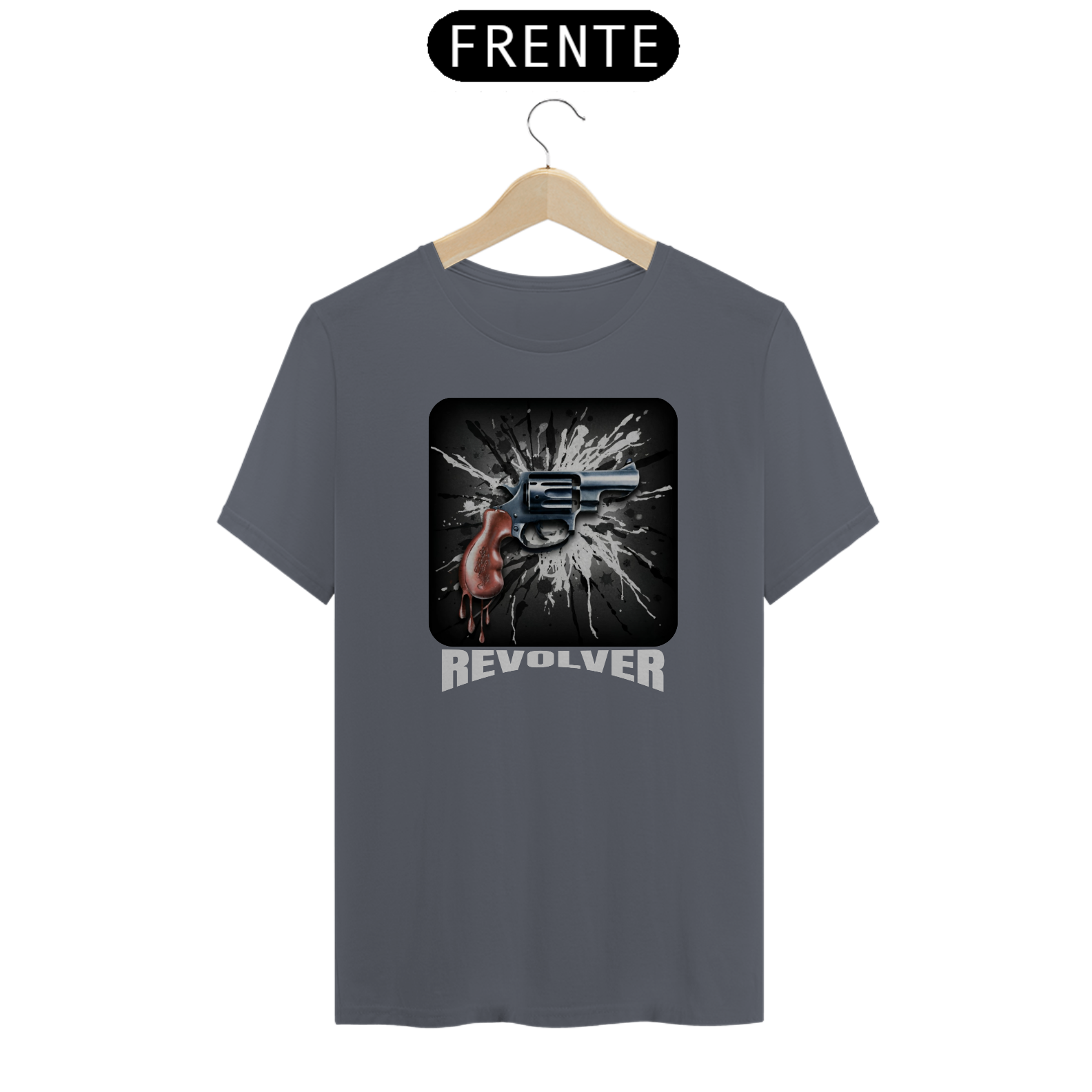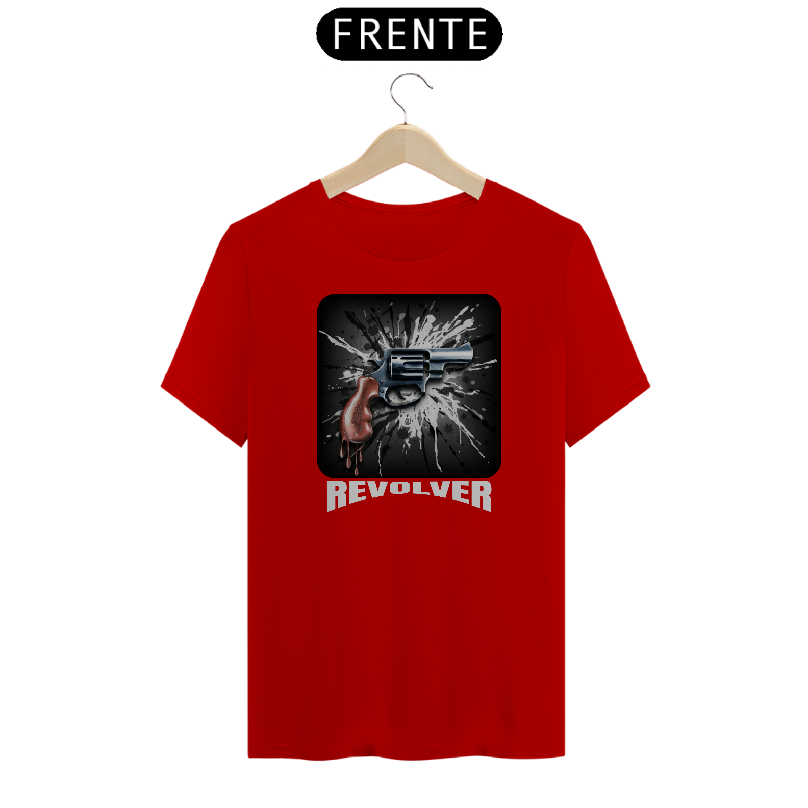 Esta estampa apresenta a imagem de um revólver, com um design estilizado em preto e branco e respingos artísticos ao fundo. O punho do revólver é destacado com detalhes em vermelho, como se estivesse pingando, criando um efeito visual impactante. Abaixo da arma, a palavra 'REVOLVER' é escrita em cinza claro, ressaltando o foco da estampa.