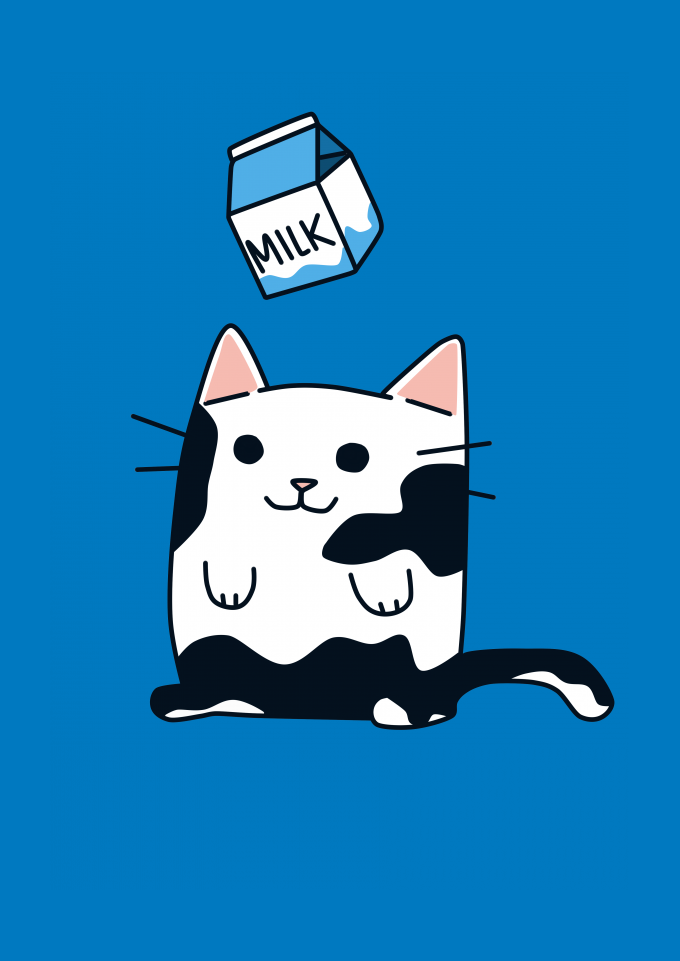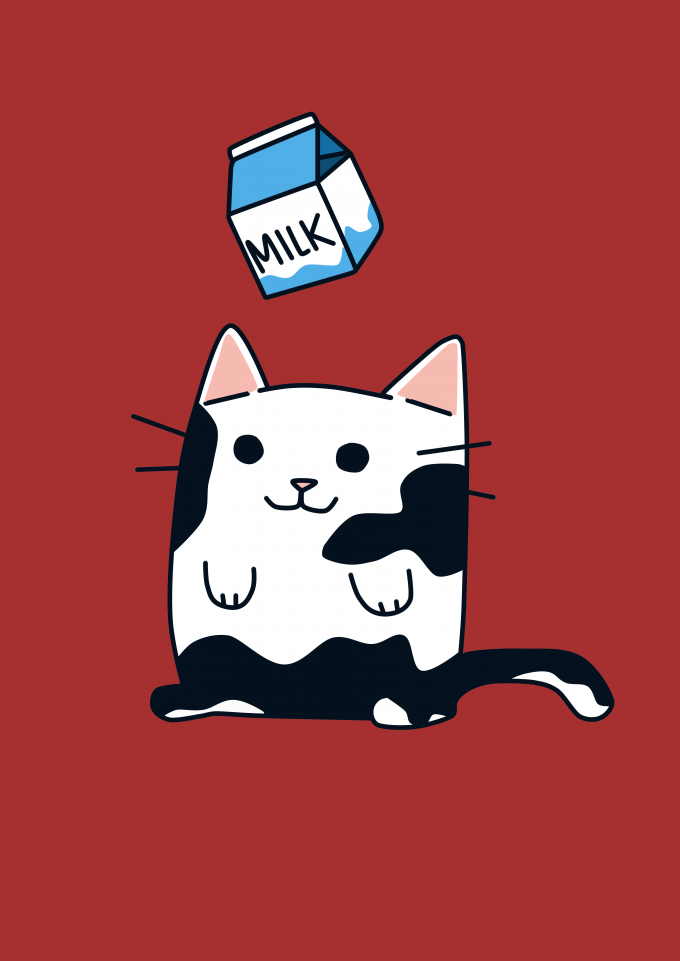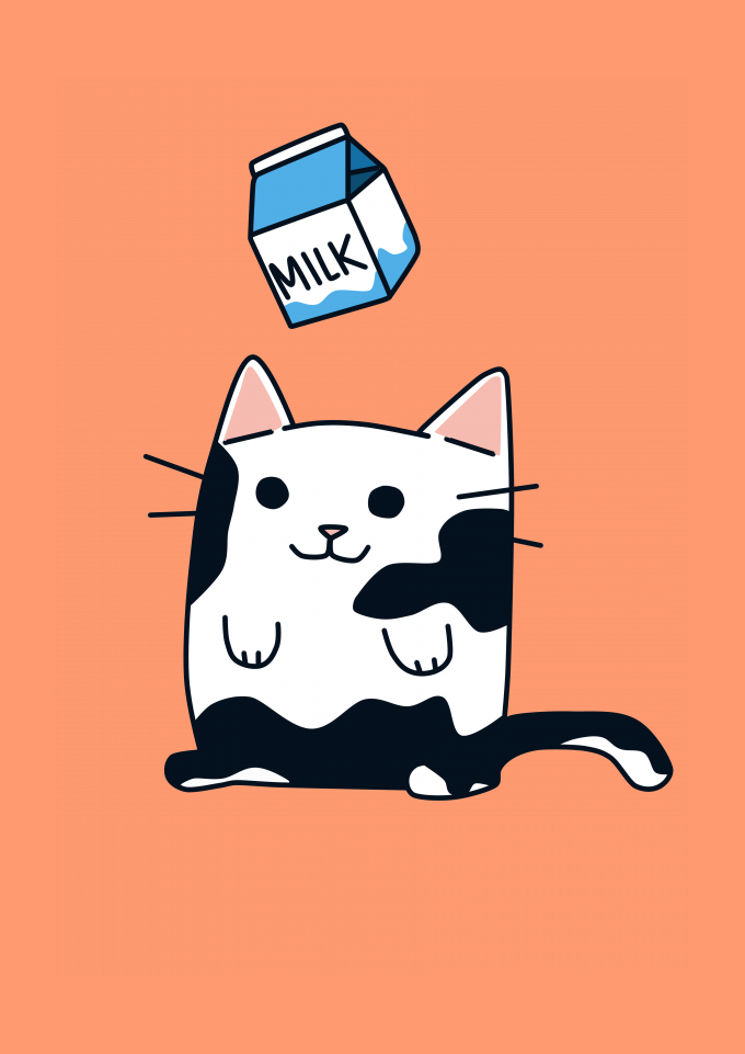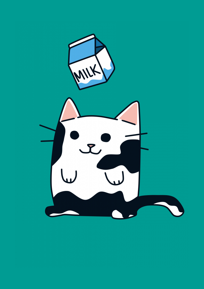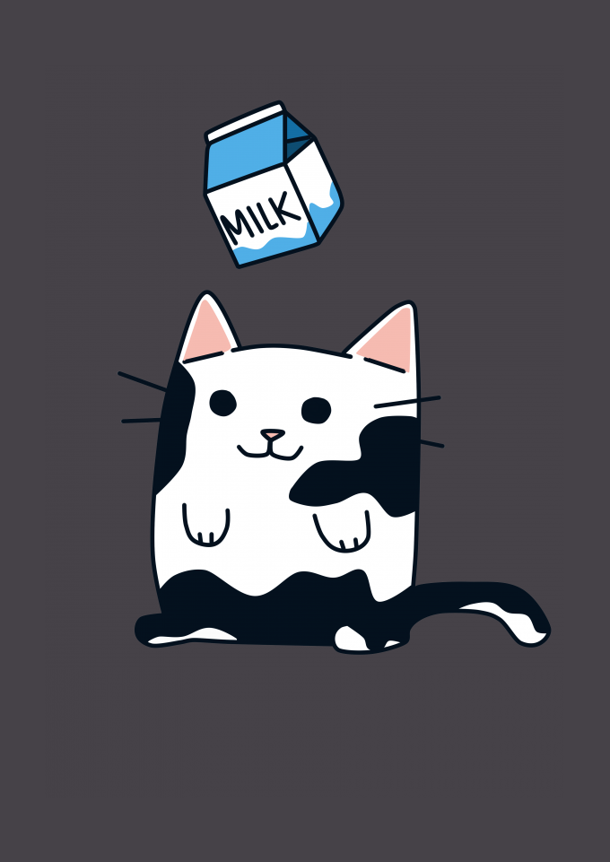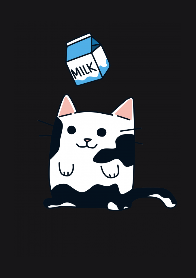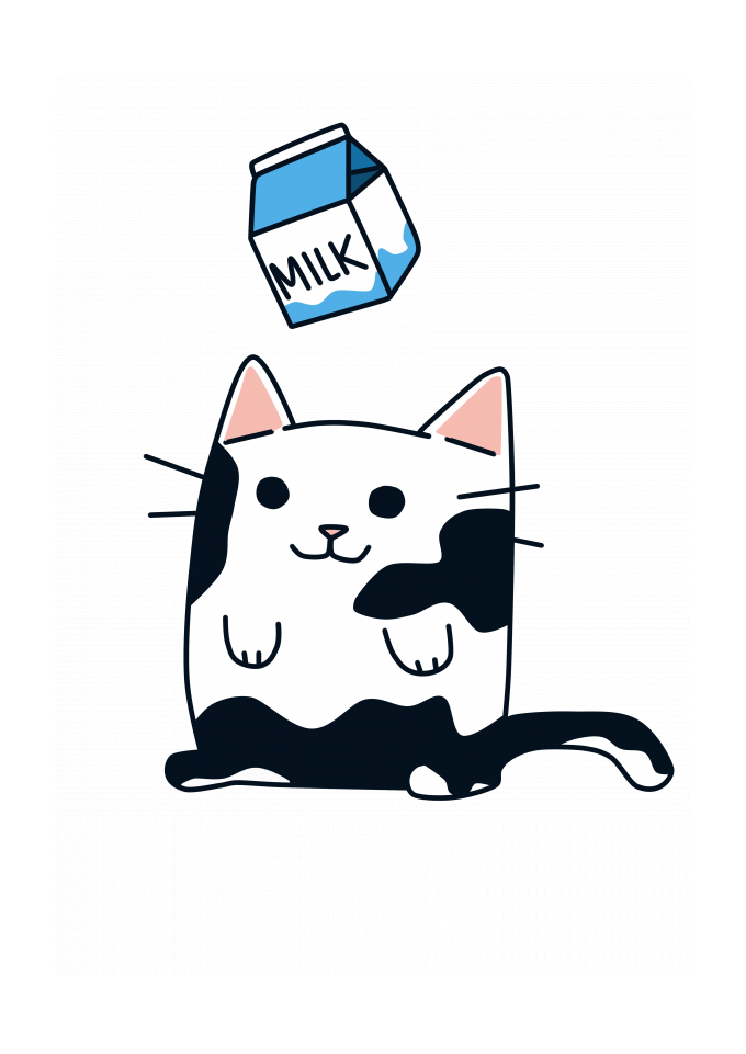 Arte criada por mim, uma gata com manchas brancas onde suas manchas ão o leite caindo sobre ela