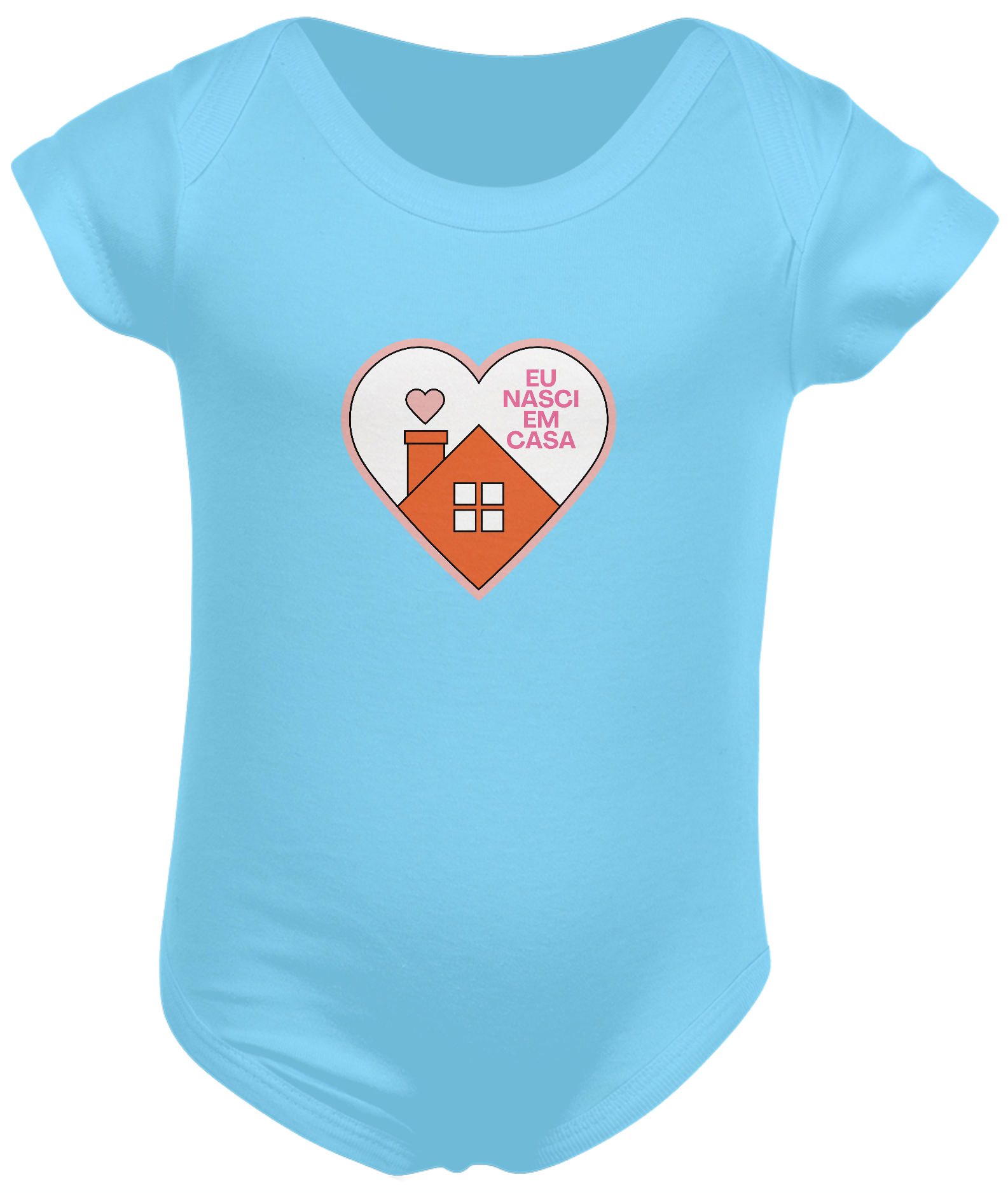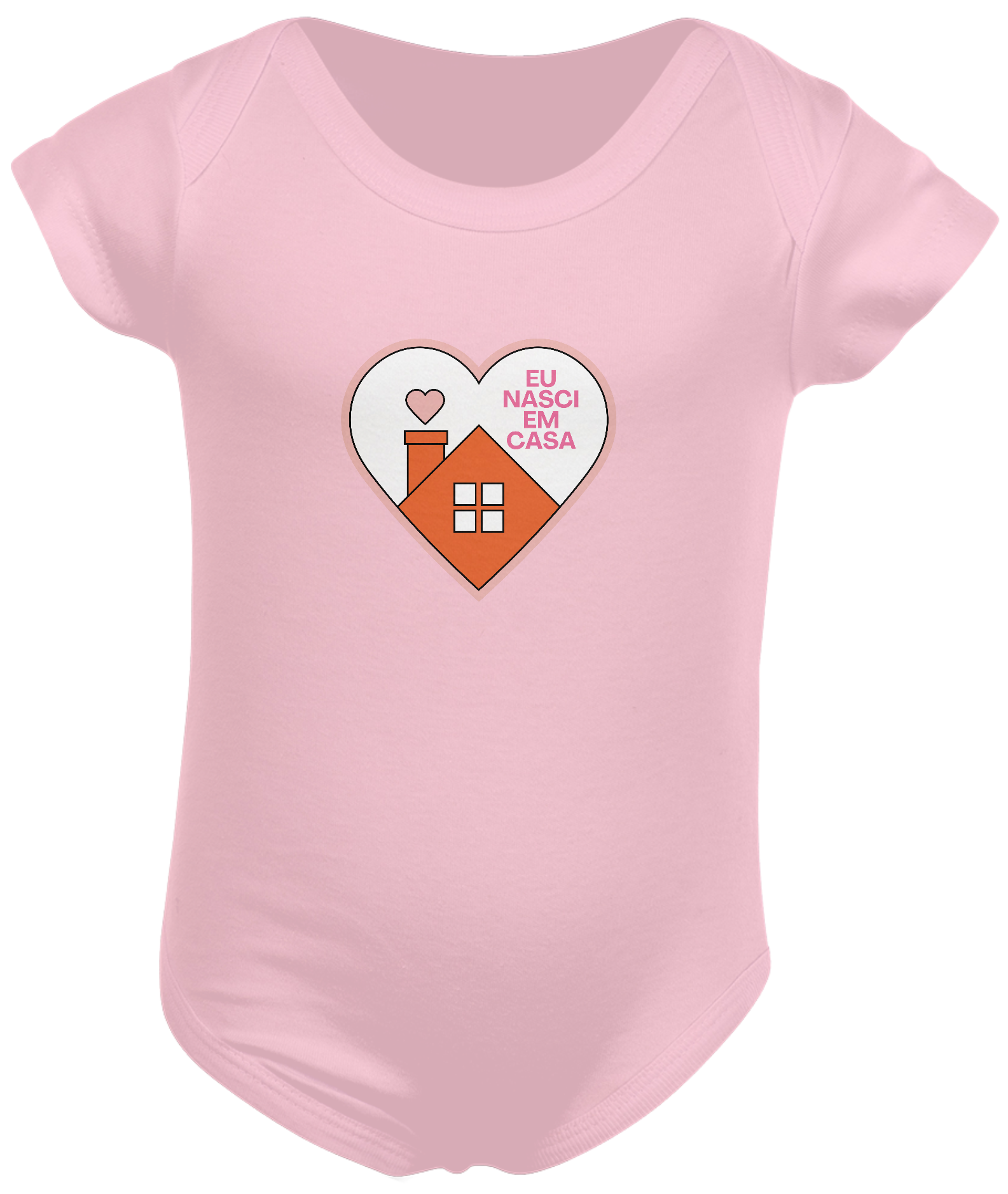 Body para bebês com estampa na frente de um coração com uma casa escrito "eu nasci em casa".