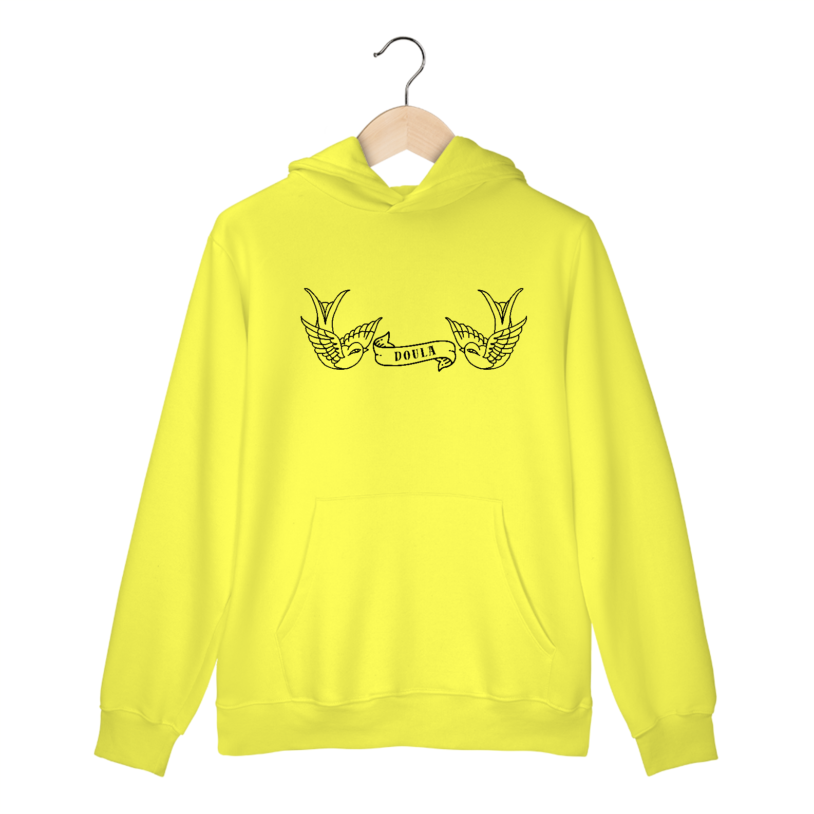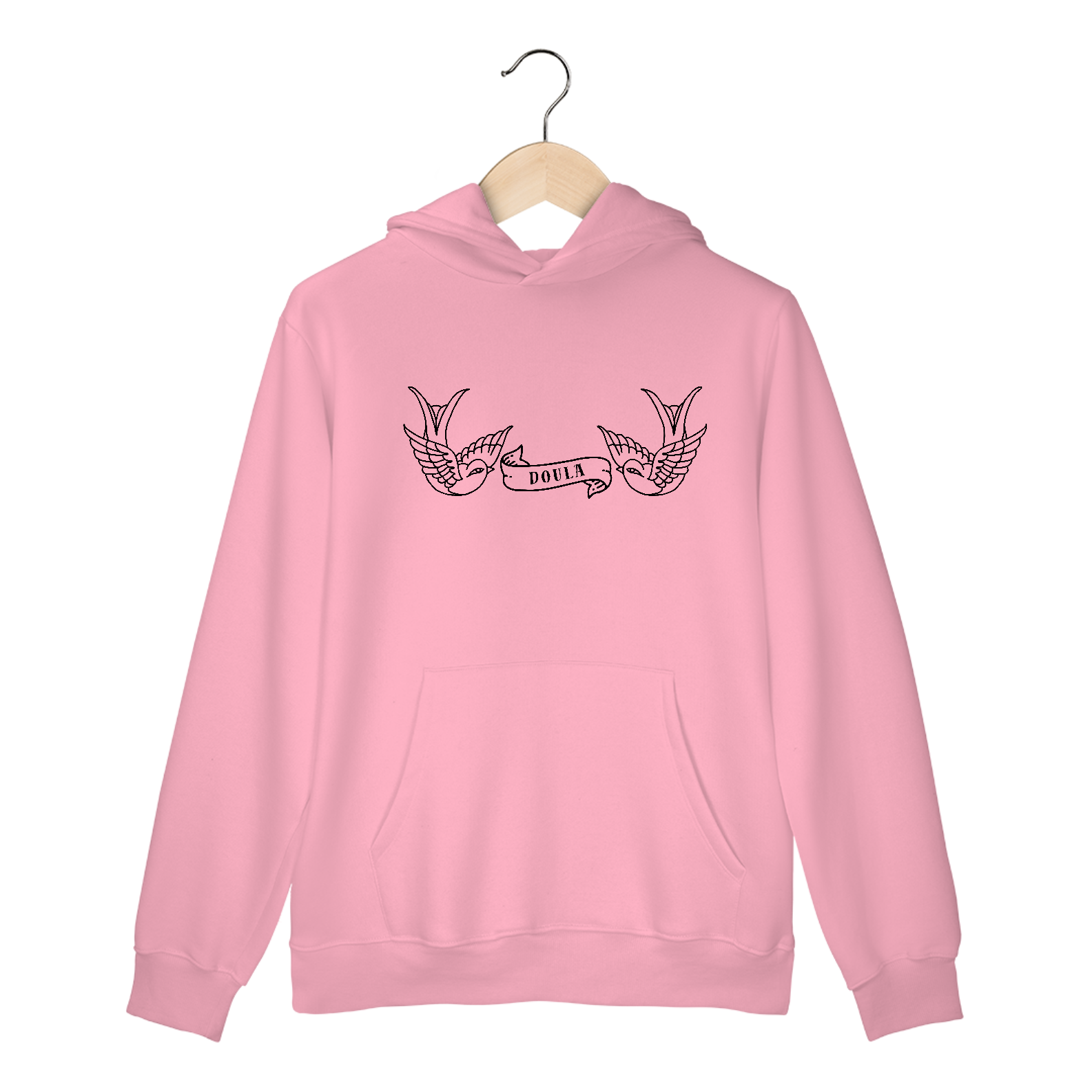 Moletom canguru com estampa na frente de pássaros e uma faixa escrito "doula".