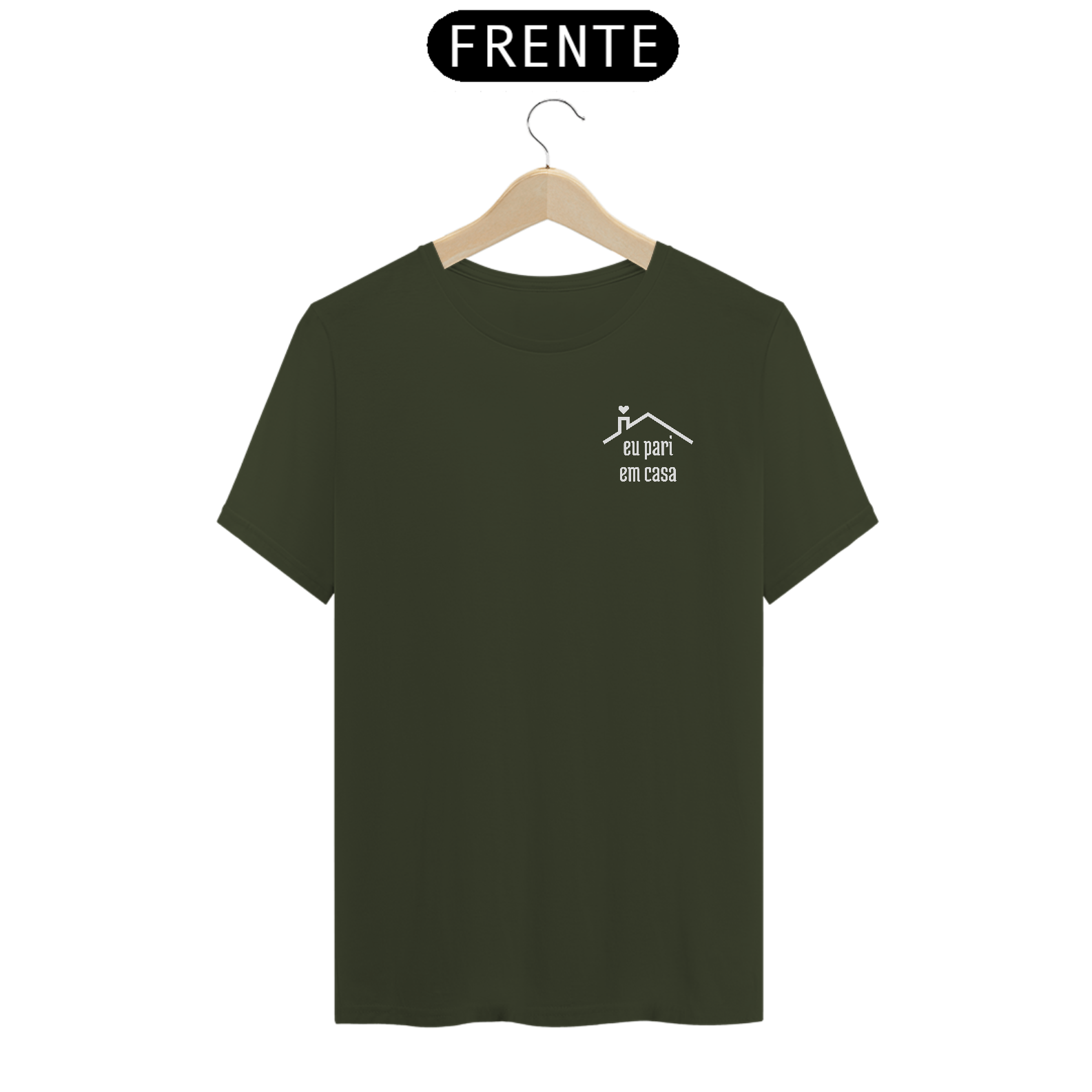 T-shirt com estampa na frente pequena de um telhado escrito "eu pari em casa".