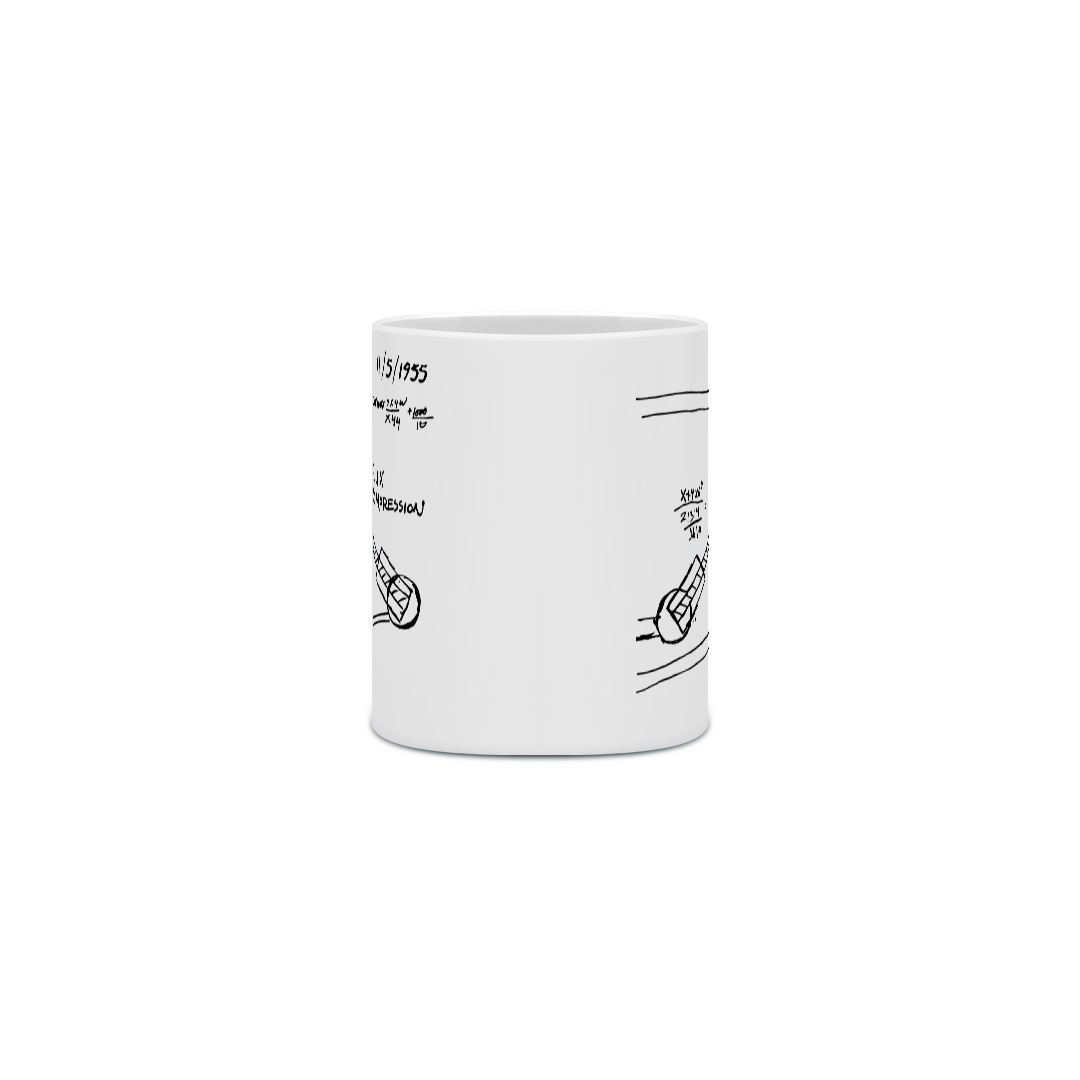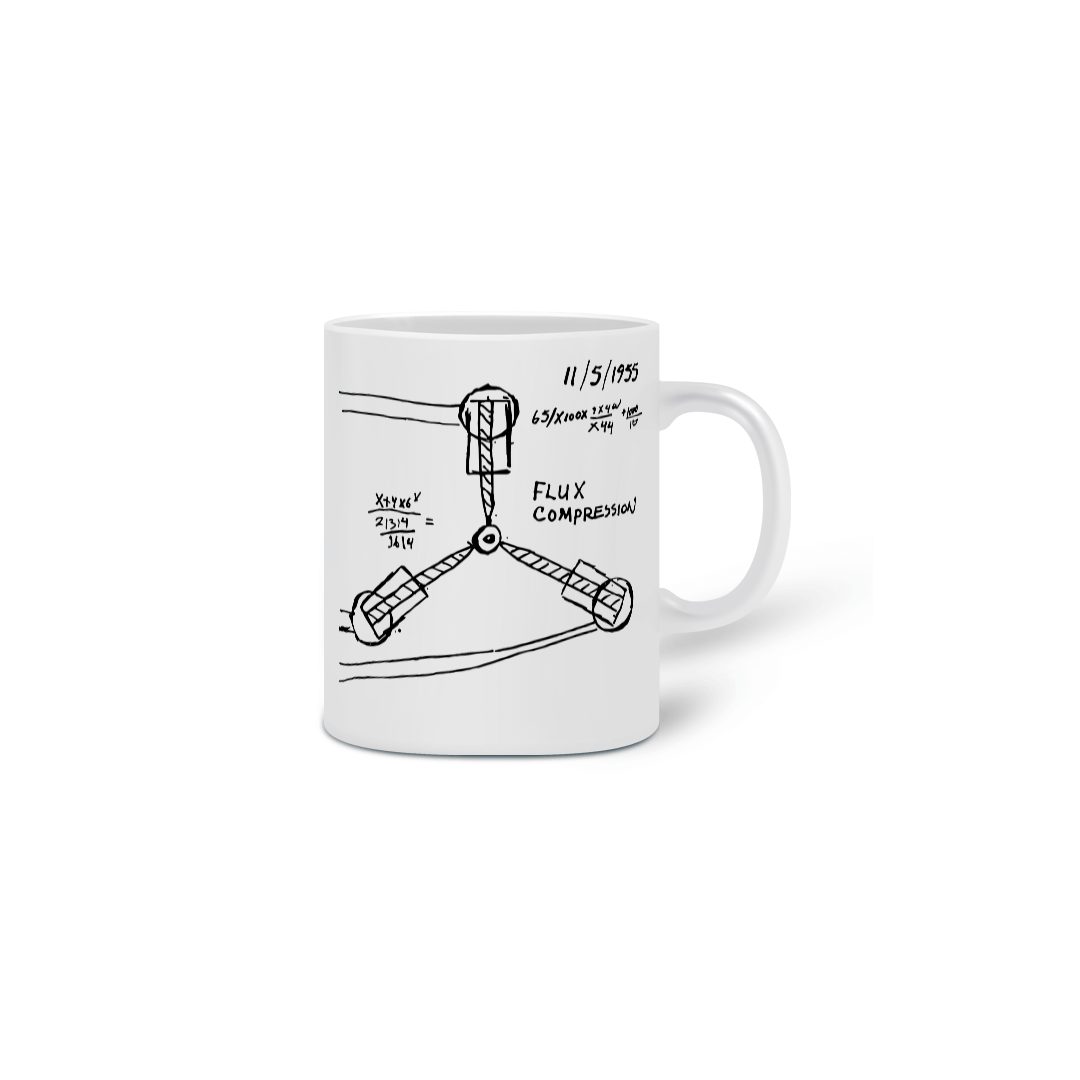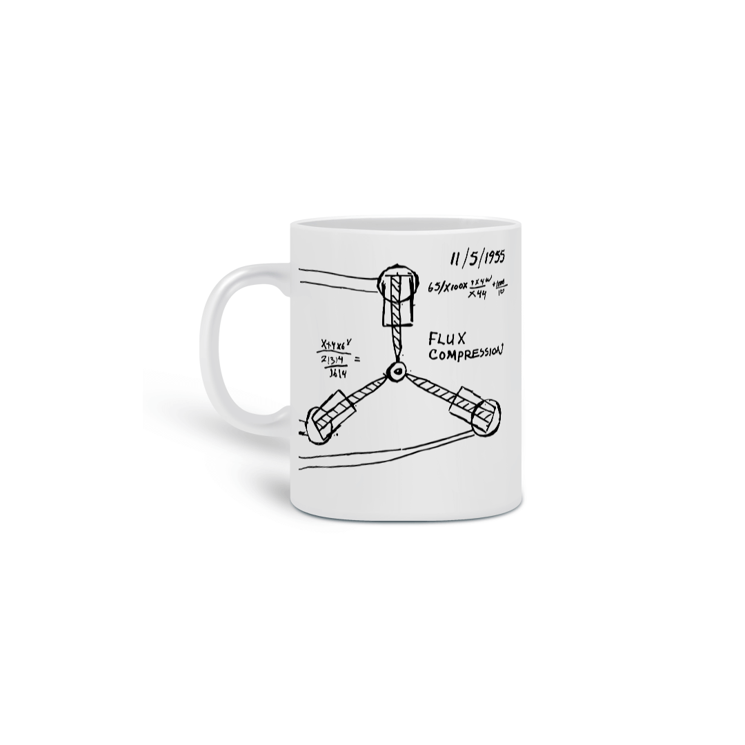 Caneca inspirada no “Capacitor de Fluxo” do filme “De Volta para o Futuro” (Back to the Future). O Doc Brown teve a ideia do capacitor de fluxo em 5 de novembro de 1955, depois de escorregar e bater a cabeça enquanto estava em seu banheiro para pendurar um relógio. Ele desenhou uma forma de Y invertida com fios e declarou “compressão de fluxo”, além de realizar alguns cálculos leves no papel. Em 1985, Doc havia conseguido transformar sua ideia em realidade. O projeto final do capacitor de fluxo resolveu o problema com o acúmulo de energia de fluxo, permitindo a viagem no tempo para o futuro e para o passado.