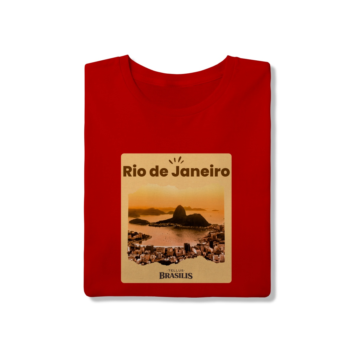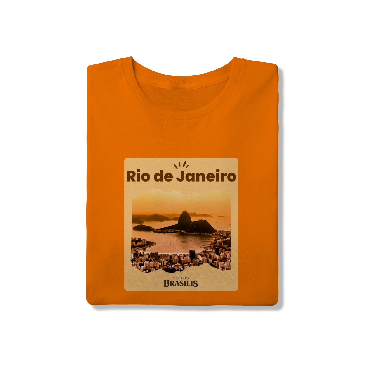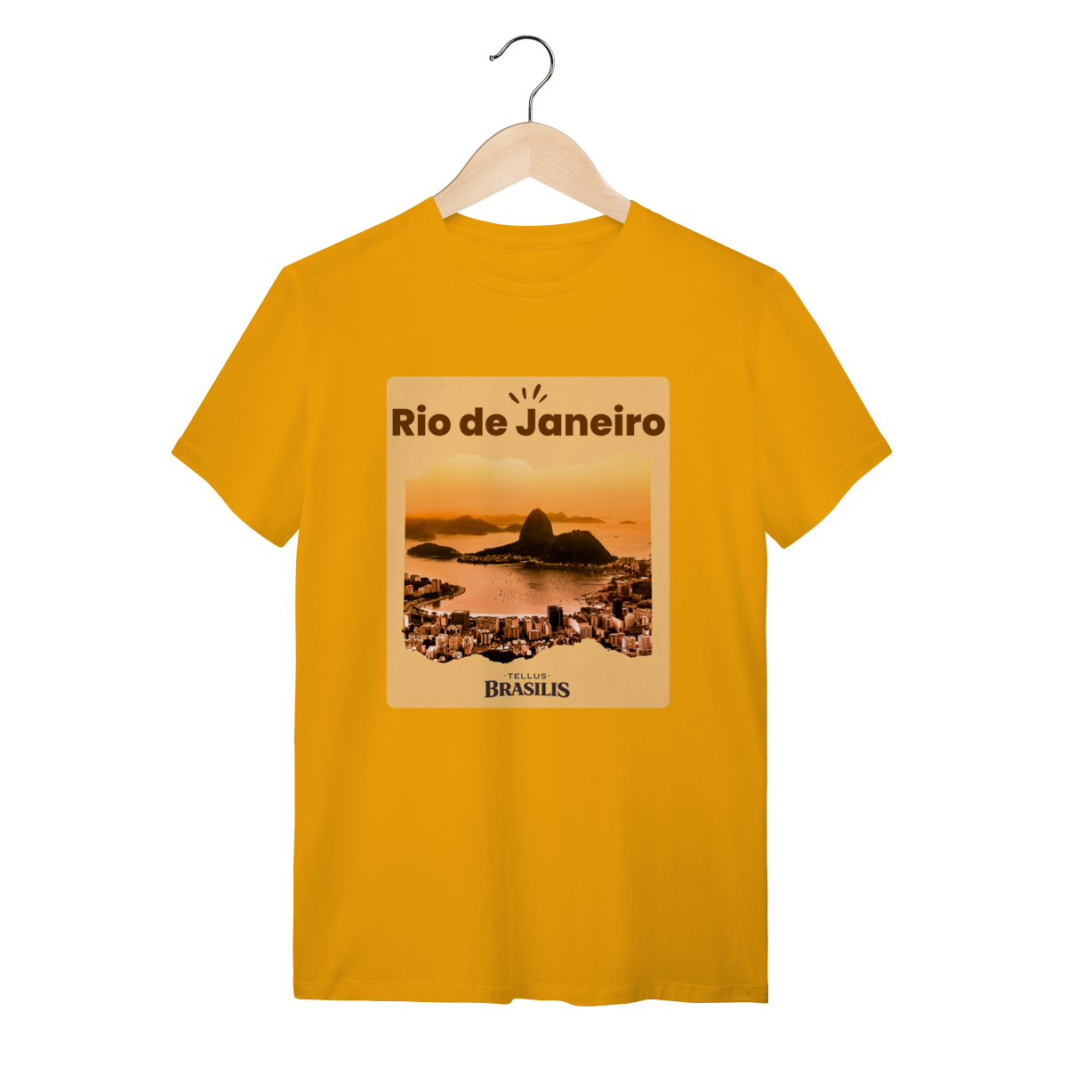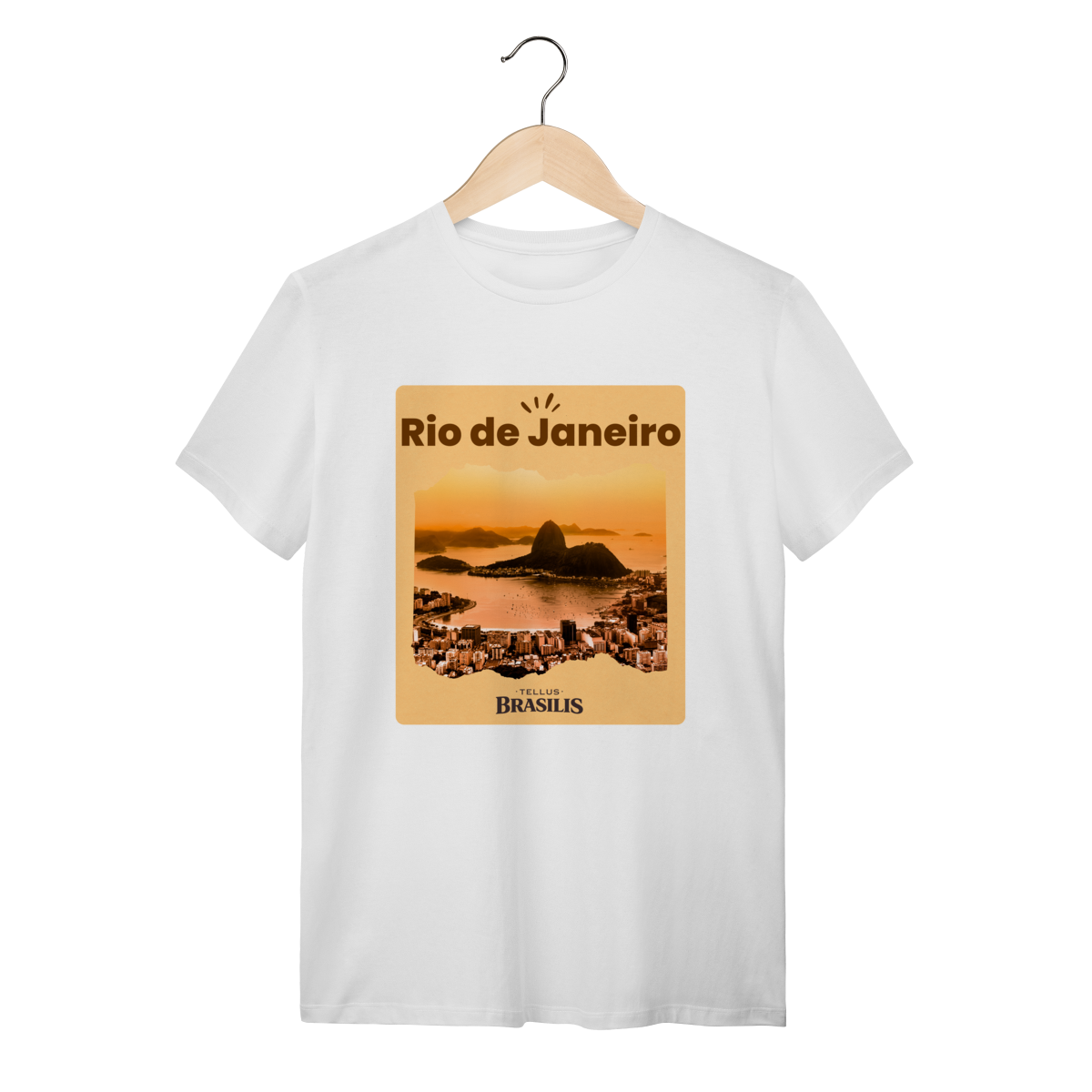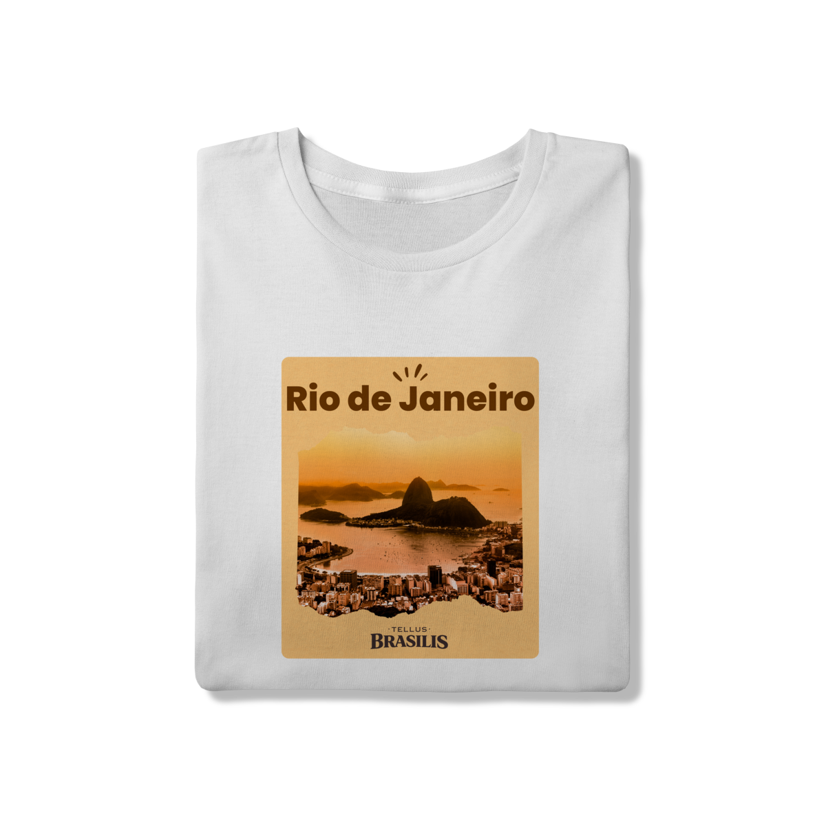 Esta camiseta retrata o Rio de Janeiro em um de seus cenários mais emblemáticos: a Baía de Guanabara envolta pela luz dourada do entardecer, com o Pão de Açúcar surgindo imponente entre o mar e a cidade.