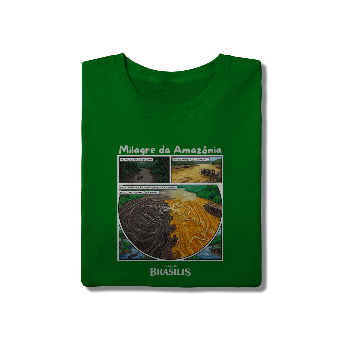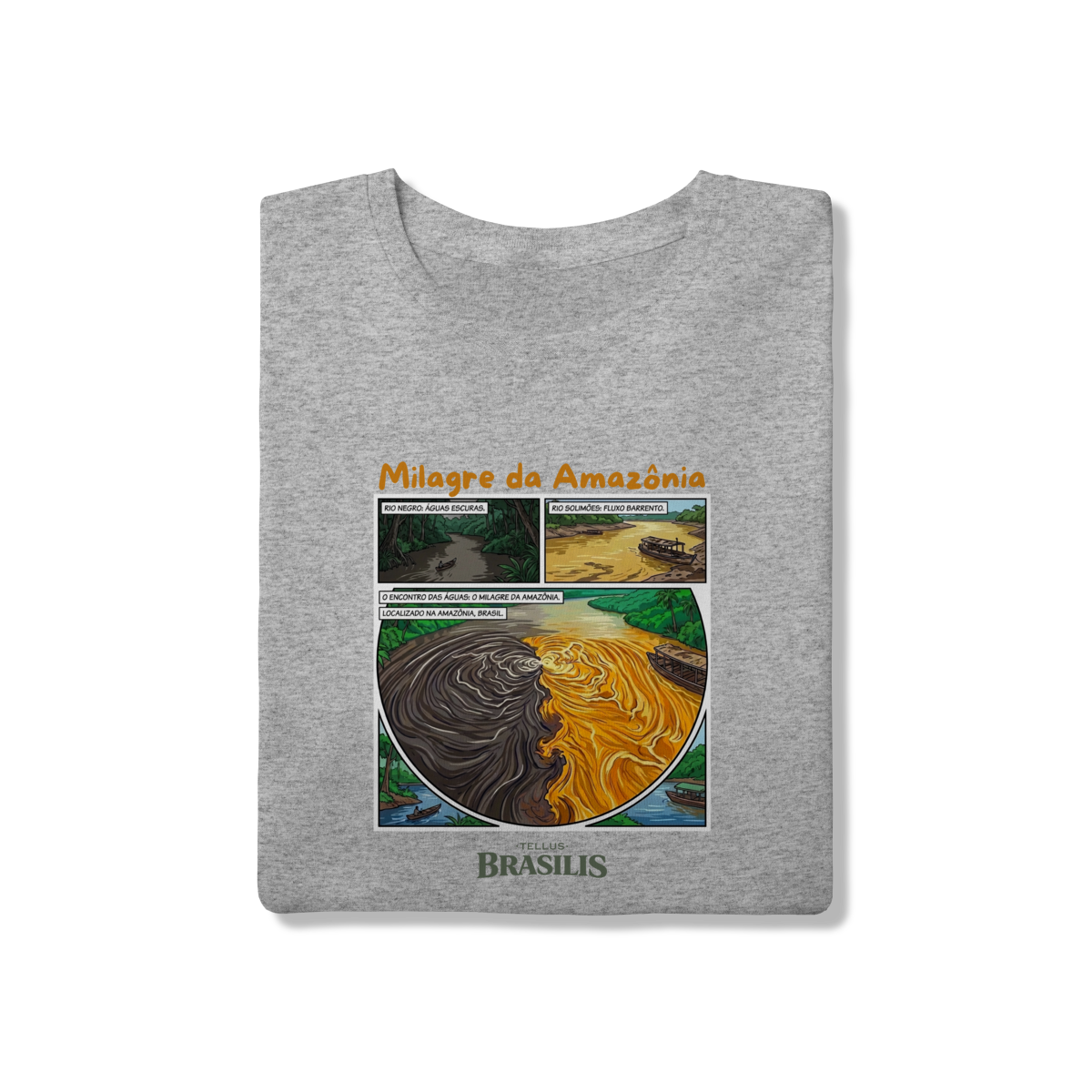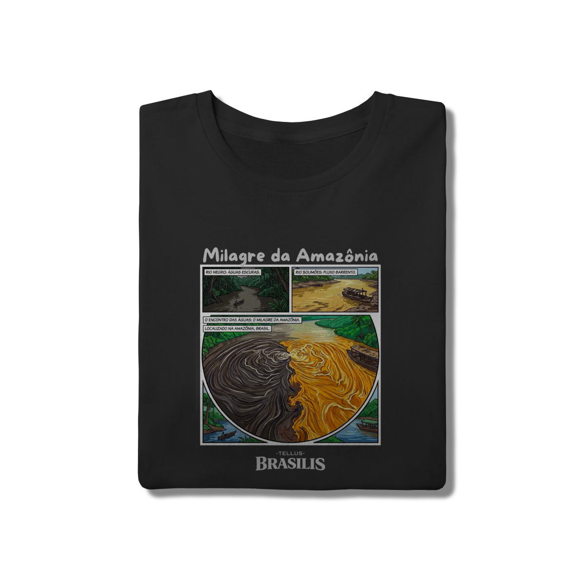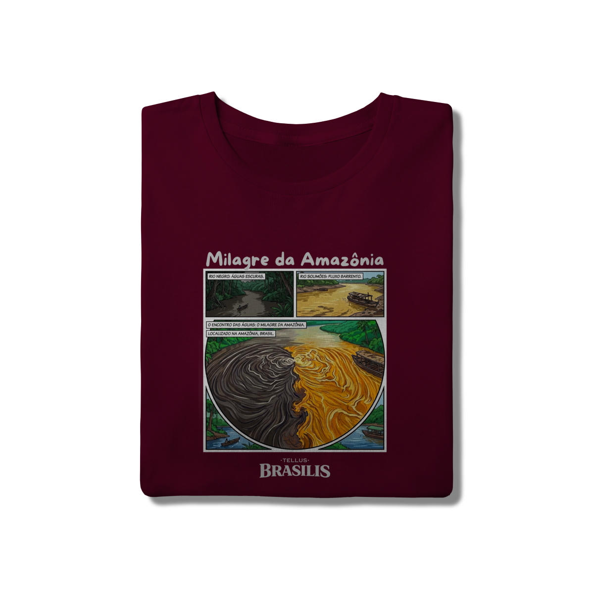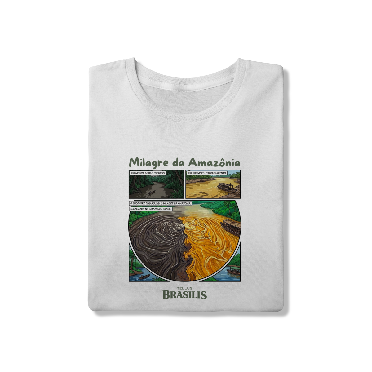 A composição reforça o caráter único do fenômeno, resultado de diferenças de temperatura, densidade e velocidade das correntes, transformando o encontro dos rios em um símbolo de equilíbrio natural e diversidade. As embarcações e a floresta ao redor situam o cenário no cotidiano amazônico, onde a vida ribeirinha convive diretamente com essa grandiosidade da natureza.