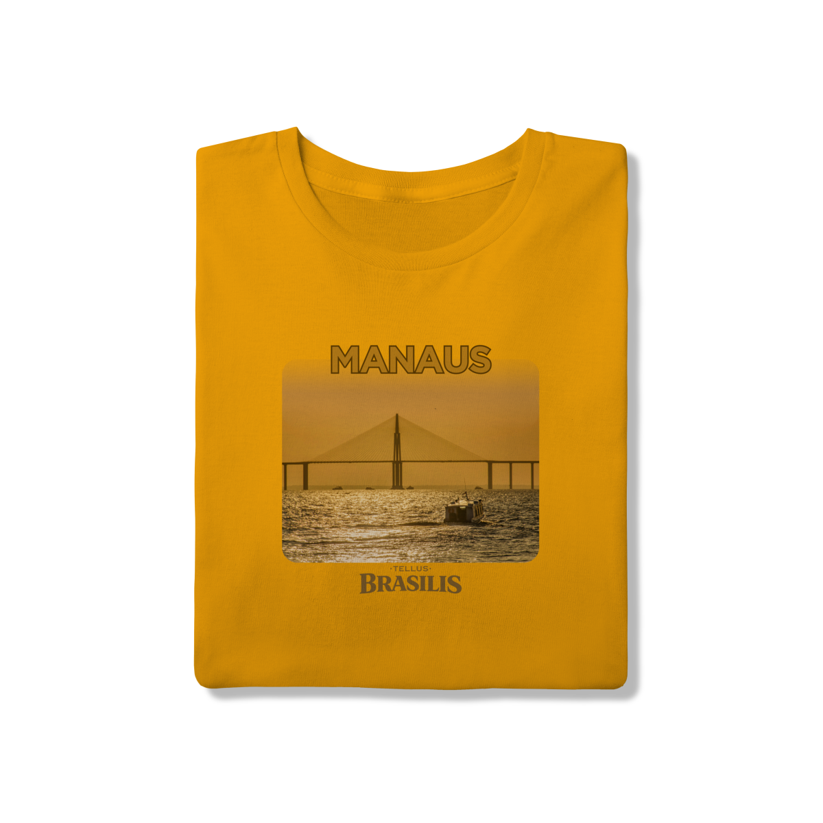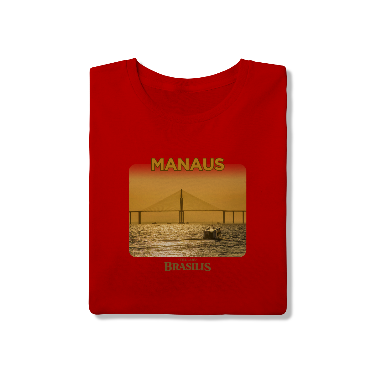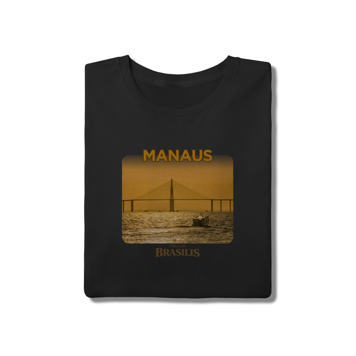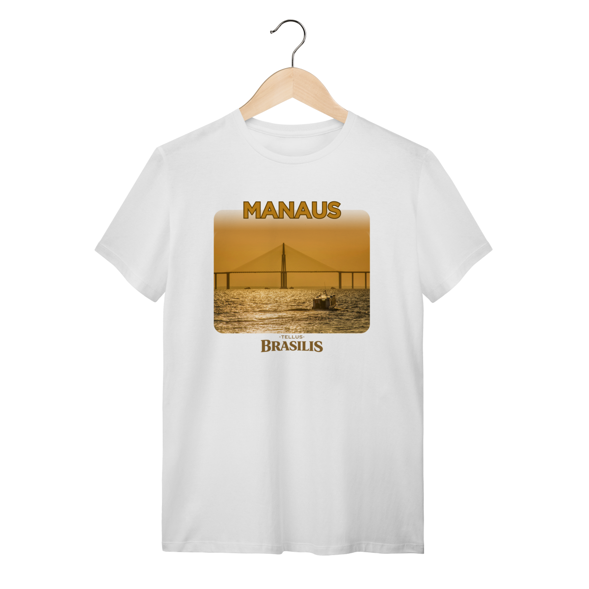 Esta camisa apresenta Manaus em um momento especial do dia: o entardecer sobre o Rio Negro. A ponte surge recortada pela luz dourada do pôr do sol, enquanto as águas refletem tons quentes que traduzem a calma e a grandiosidade da paisagem amazônica. A presença das embarcações reforça o cotidiano ribeirinho e a relação histórica da cidade com seus rios.