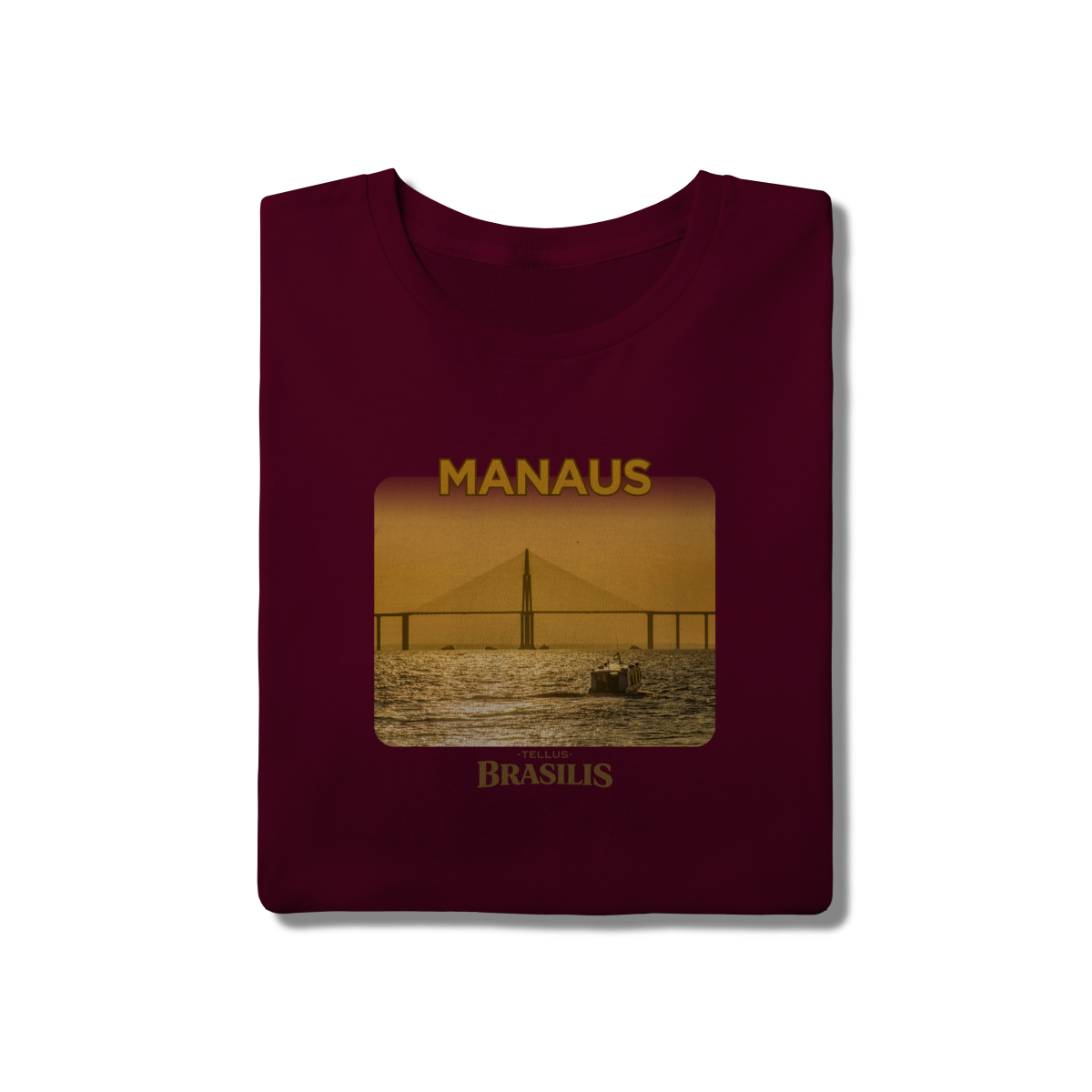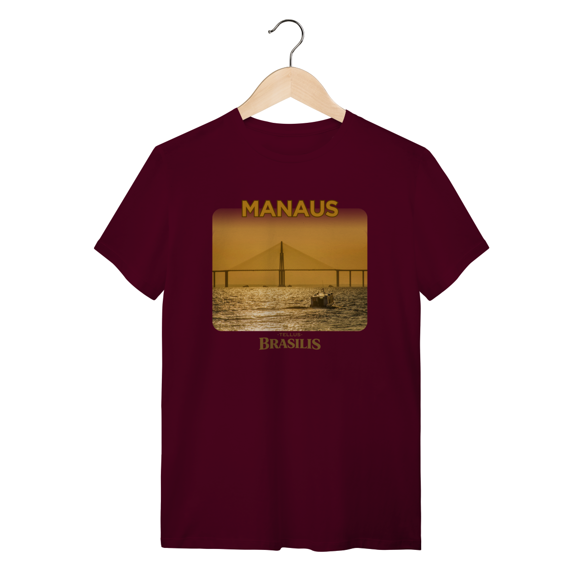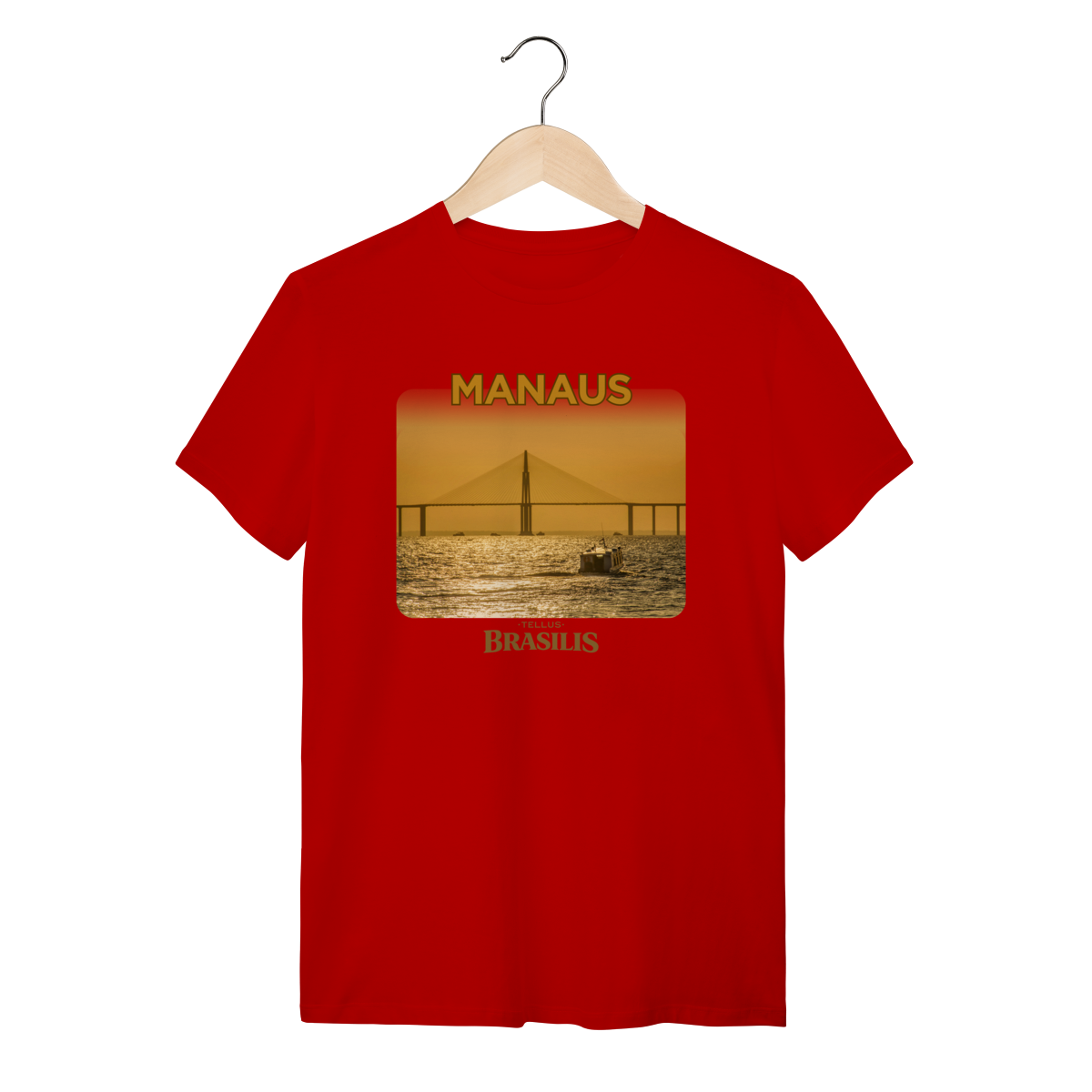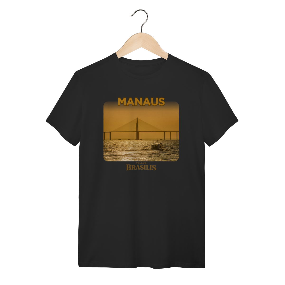 Esta camisa apresenta Manaus em um momento especial do dia: o entardecer sobre o Rio Negro. A ponte surge recortada pela luz dourada do pôr do sol, enquanto as águas refletem tons quentes que traduzem a calma e a grandiosidade da paisagem amazônica. A presença das embarcações reforça o cotidiano ribeirinho e a relação histórica da cidade com seus rios.