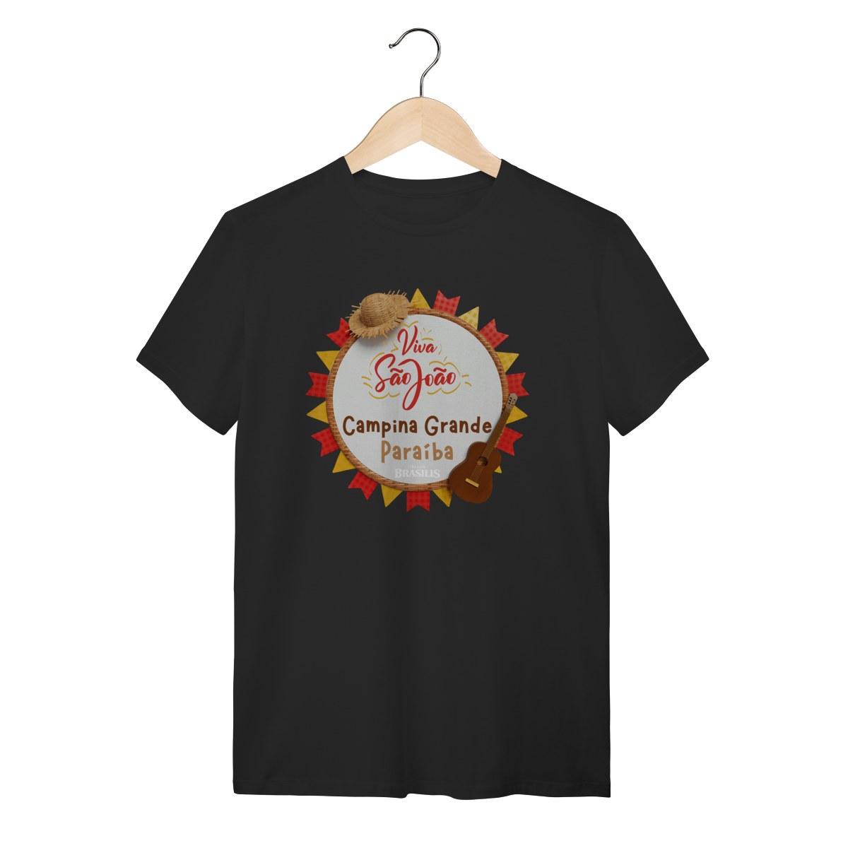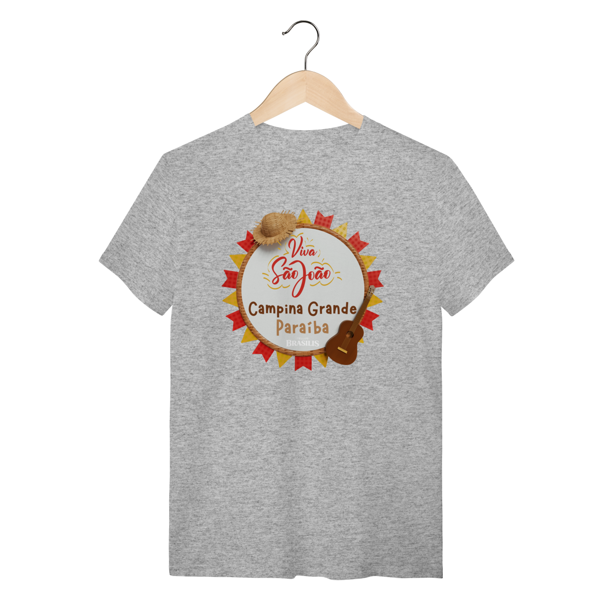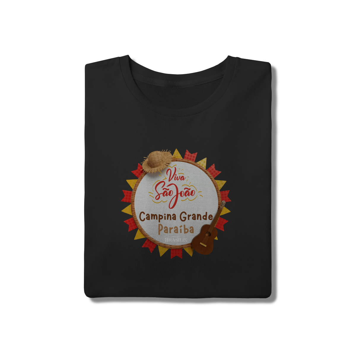 Esta camisa exalta o espírito do São João em Campina Grande, cidade que transformou a festa junina em identidade cultural. A estampa traz elementos clássicos do arraial — como o chapéu de palha, a sanfona, o violão e as bandeirolas coloridas — reunidos em uma composição alegre que traduz música, dança e tradição nordestina.