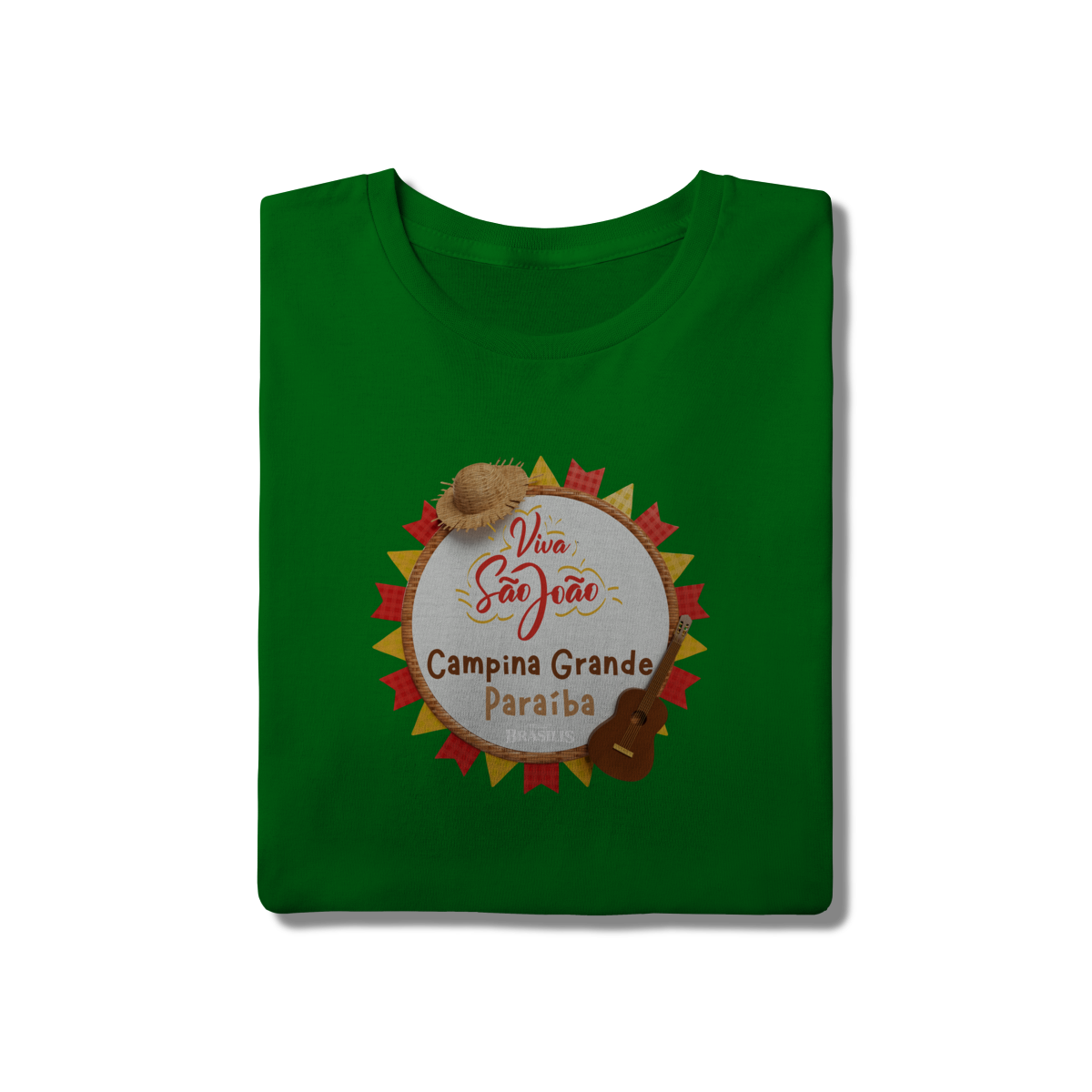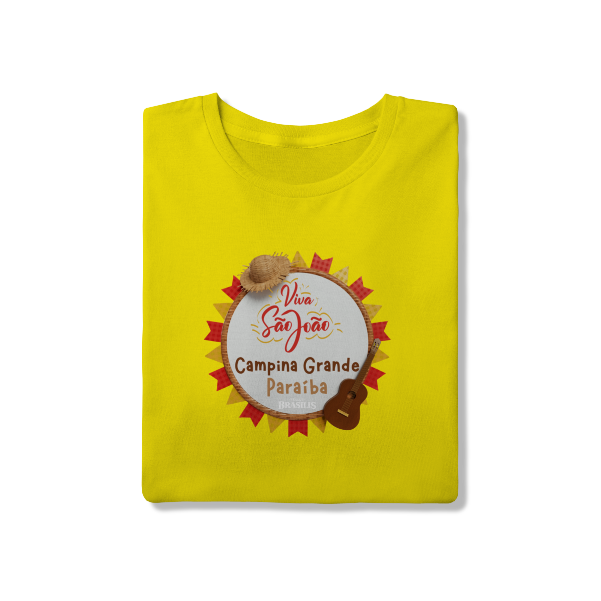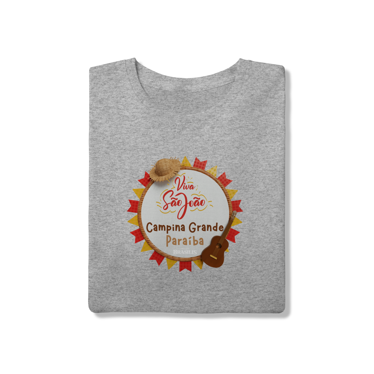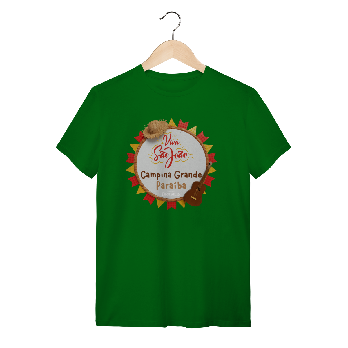 Esta camisa exalta o espírito do São João em Campina Grande, cidade que transformou a festa junina em identidade cultural. A estampa traz elementos clássicos do arraial — como o chapéu de palha, a sanfona, o violão e as bandeirolas coloridas — reunidos em uma composição alegre que traduz música, dança e tradição nordestina.