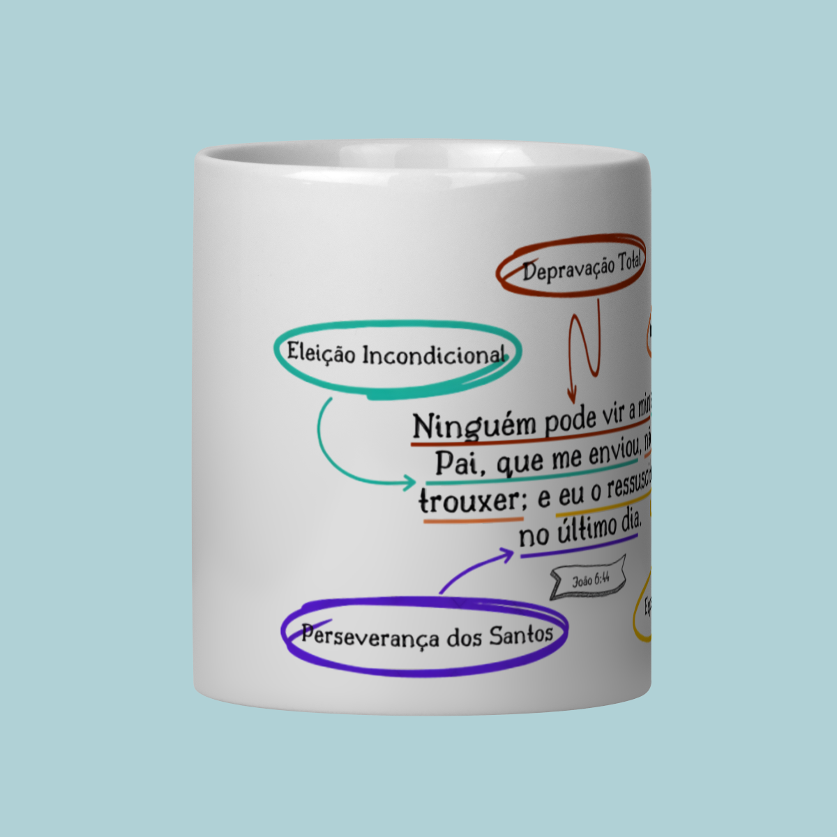 A Caneca essencial para o estudante de Teologia! Apresenta um diagrama visual divertido dos 5 Pontos do Calvinismo (TULIP), centrado na verdade de João 6:44: a soberania de Deus na salvação. Leve seus livros e sua doutrina com estilo!