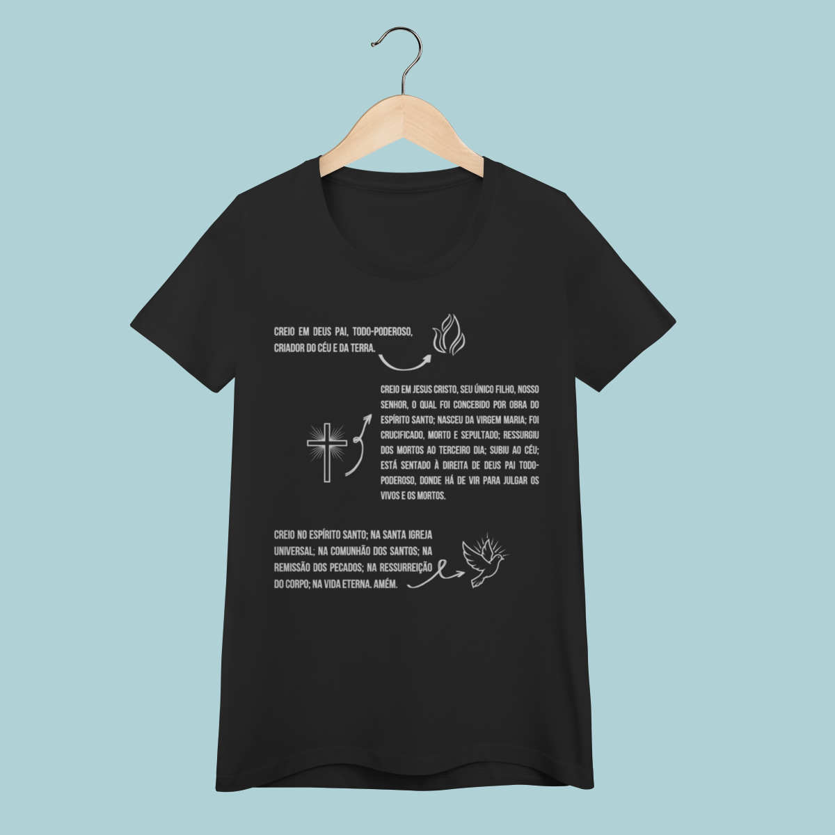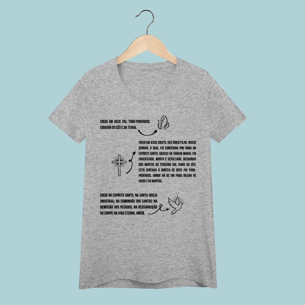 Vista as verdades eternas da fé! Esta camiseta celebra o Credo Apostólico, resumindo os pontos centrais da doutrina cristã em um design elegante e informativo. Uma peça essencial para quem valoriza a ortodoxia histórica da Igreja.