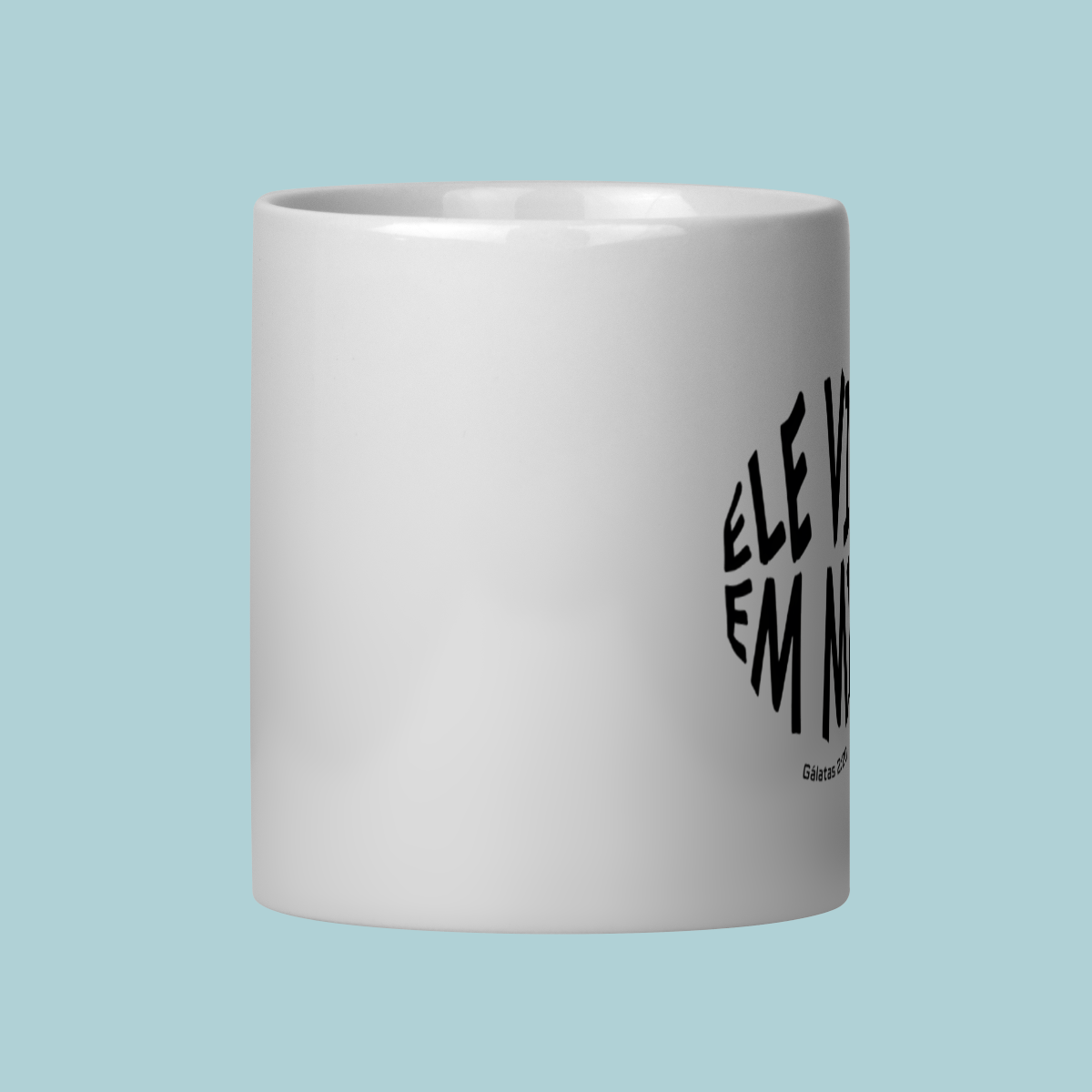 Uma declaração de fé impactante! Esta caneca celebra a verdade transformadora de Gálatas 2:20: "Não mais eu, mas Cristo vive em mim." O design circular moderno e a tipografia distorcida refletem a mudança radical que a justificação pela fé opera no crente.