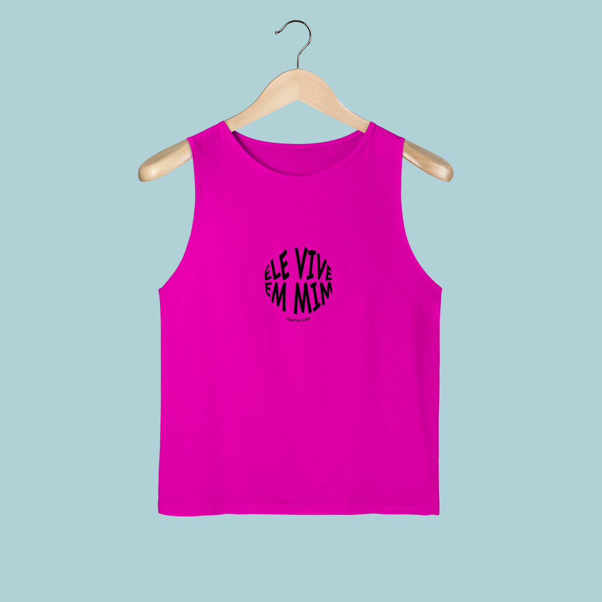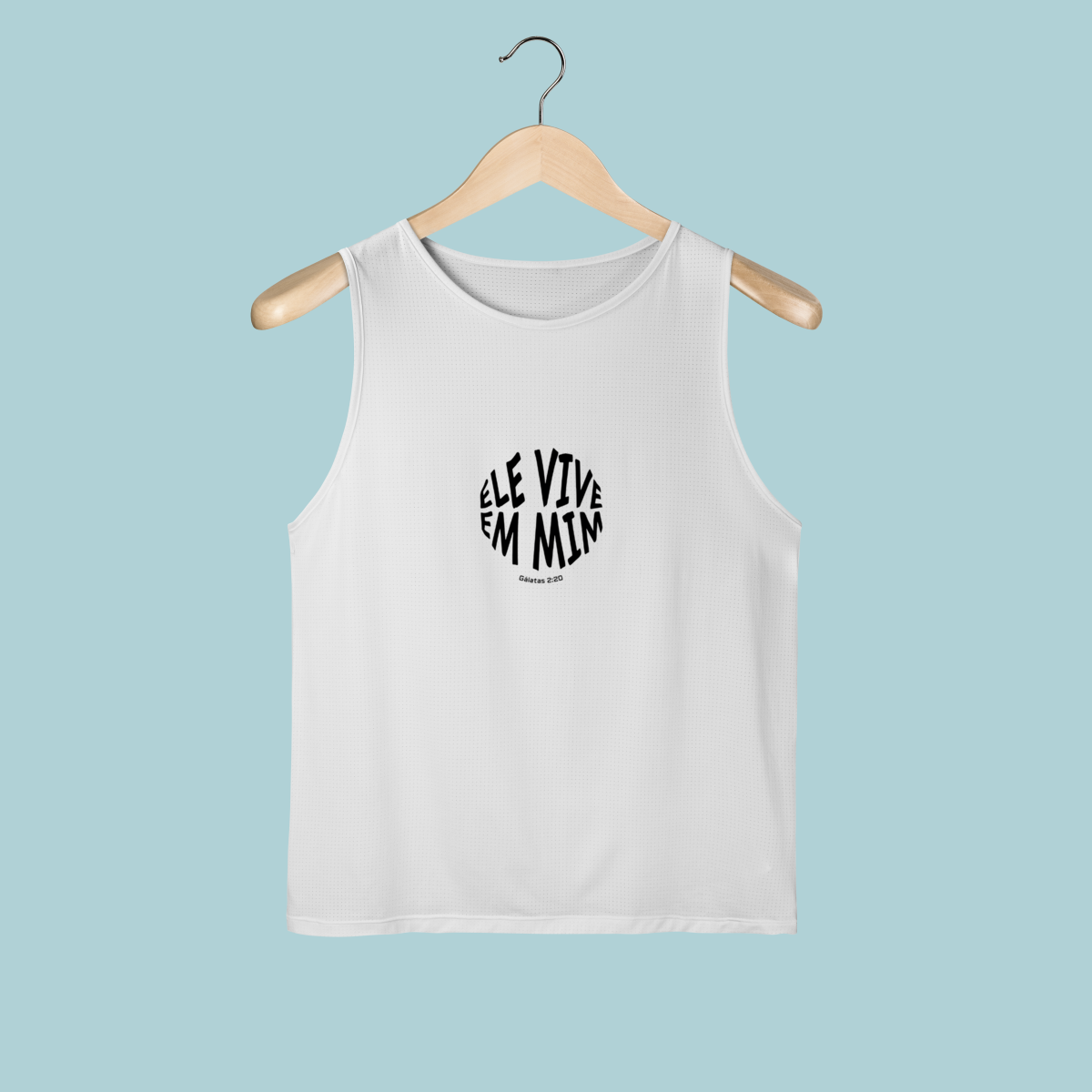 Uma declaração de fé impactante! Esta regata celebra a verdade transformadora de Gálatas 2:20: "Não mais eu, mas Cristo vive em mim." O design circular moderno e a tipografia distorcida refletem a mudança radical que a justificação pela fé opera no crente.