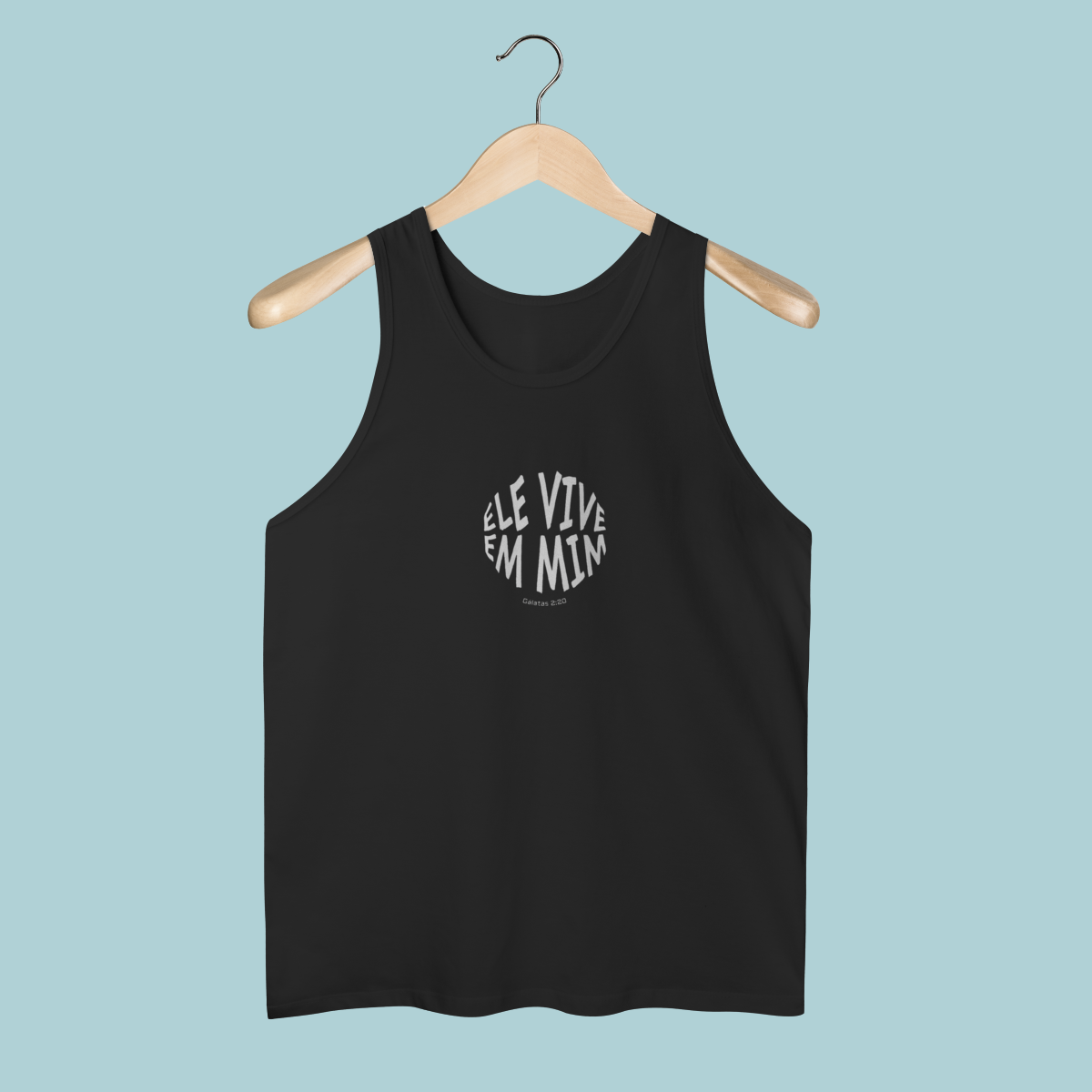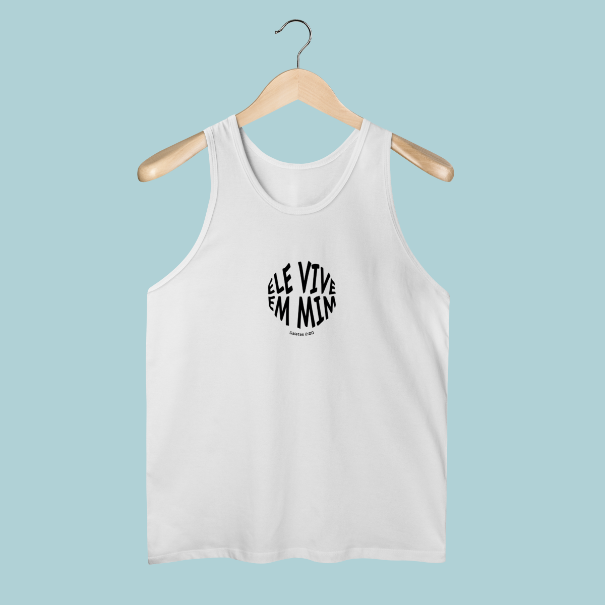 Uma declaração de fé impactante! Esta regata celebra a verdade transformadora de Gálatas 2:20: "Não mais eu, mas Cristo vive em mim." O design circular moderno e a tipografia distorcida refletem a mudança radical que a justificação pela fé opera no crente.