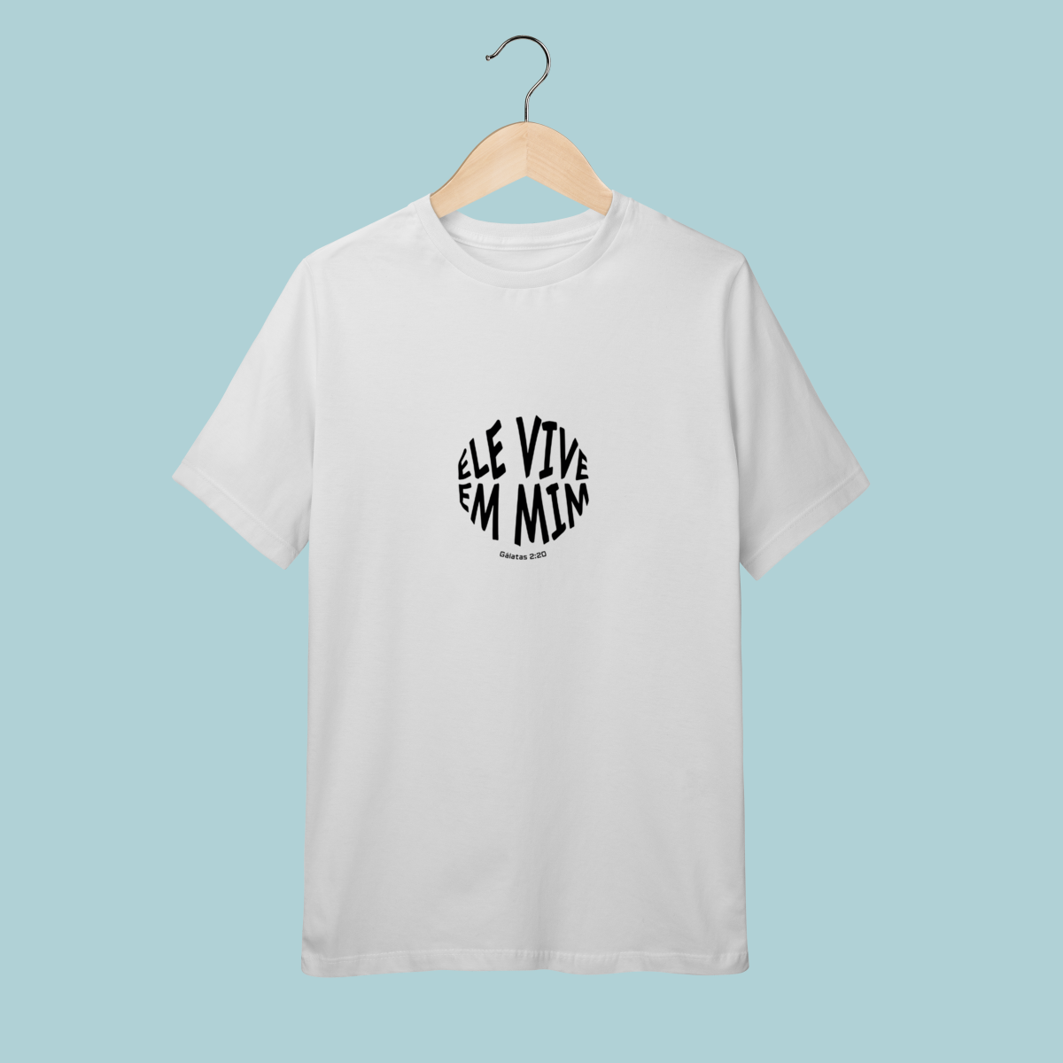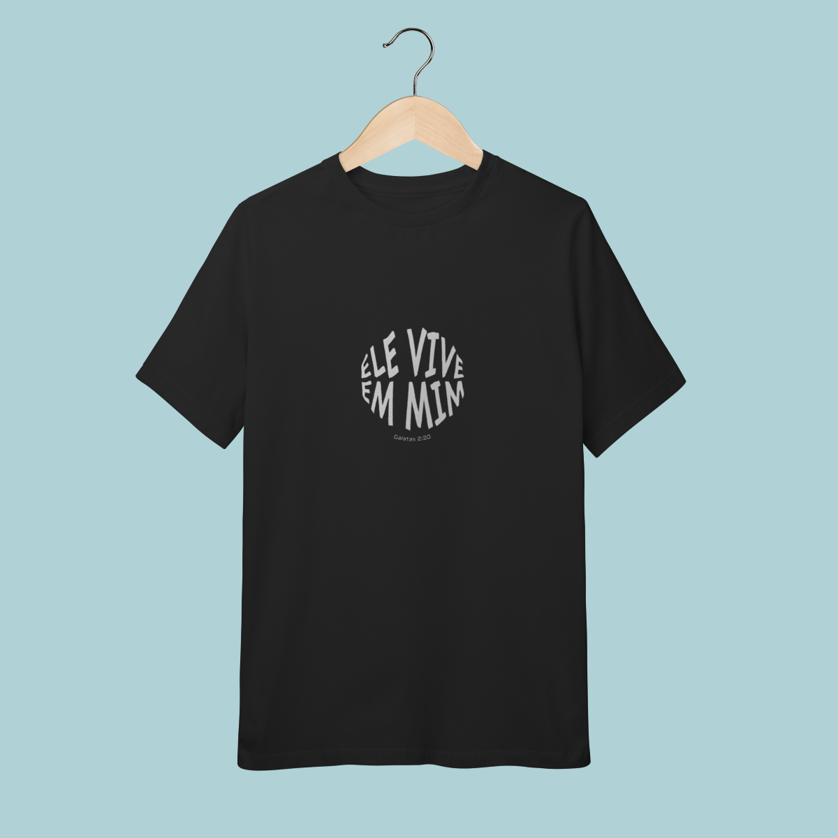 Uma declaração de fé impactante! Esta camiseta celebra a verdade transformadora de Gálatas 2:20: "Não mais eu, mas Cristo vive em mim." O design circular moderno e a tipografia distorcida refletem a mudança radical que a justificação pela fé opera no crente.