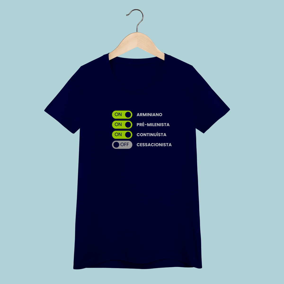 Deixe sua doutrina em evidência! Esta camiseta com design interativo de toggle switches é perfeita para pentecostais que afirmam sua fé: Arminiano ON, Pré-Milenista ON, Continuísta ON. O Cessacionismo está, claro, OFF. Vista sua posição teológica com clareza e bom humor!