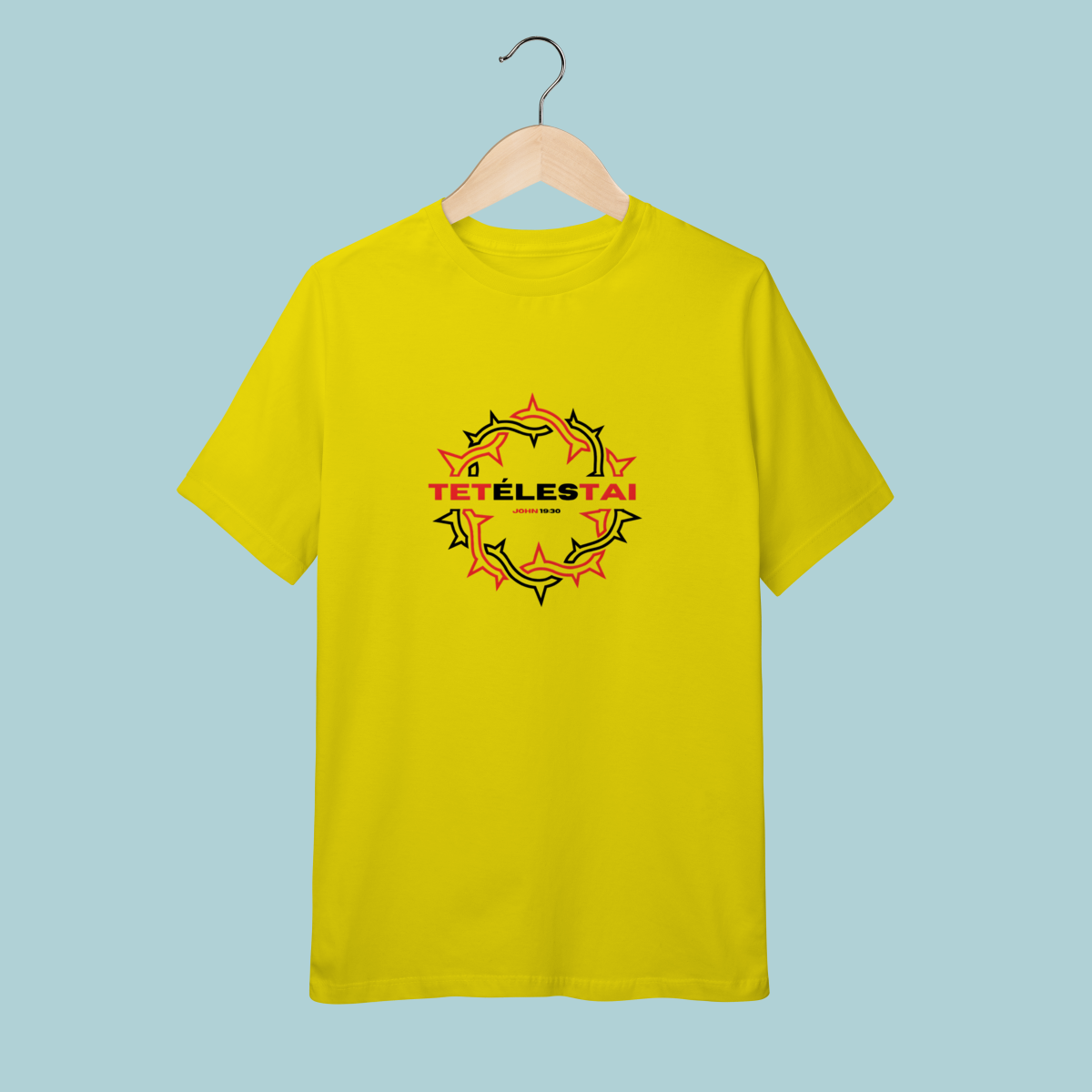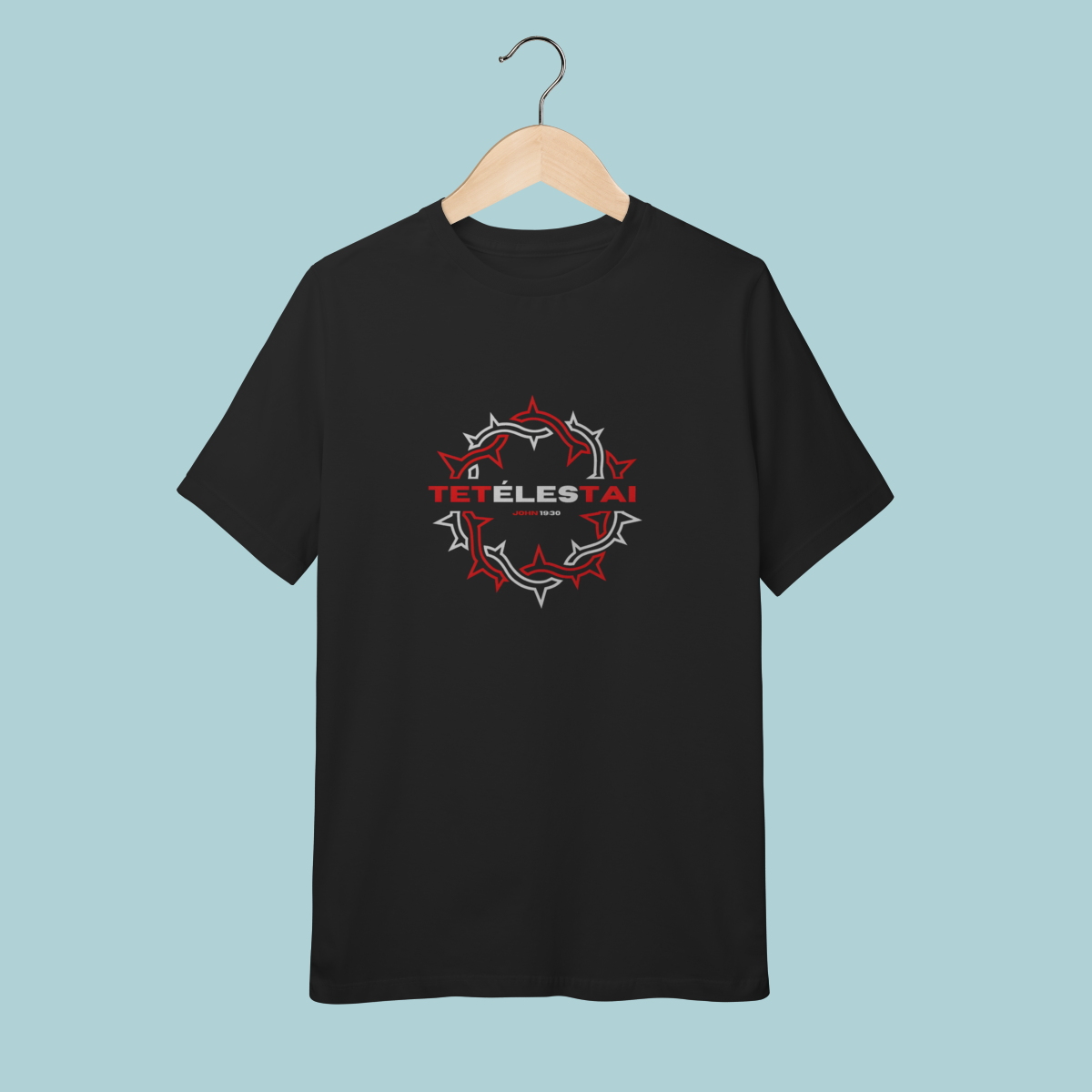 A palavra que mudou a eternidade: TETÉLESTAI. Esta camiseta celebra a verdade de João 19:30 ("Está Consumado"), a declaração da obra perfeita e suficiente de Cristo na cruz. O design com a coroa de espinhos estilizada e o corte oversized trazem conforto e profundidade teológica.