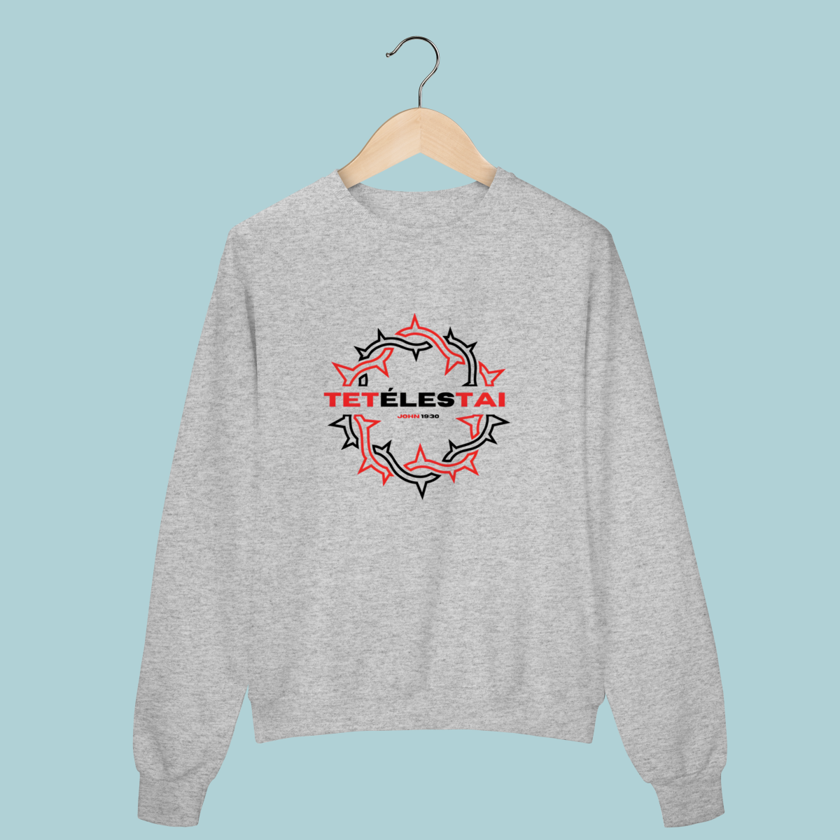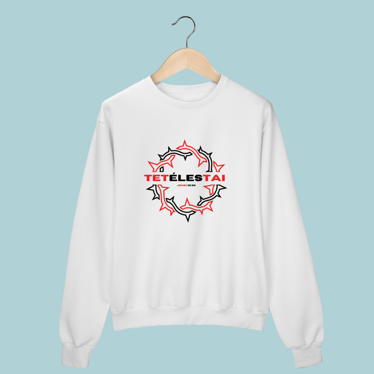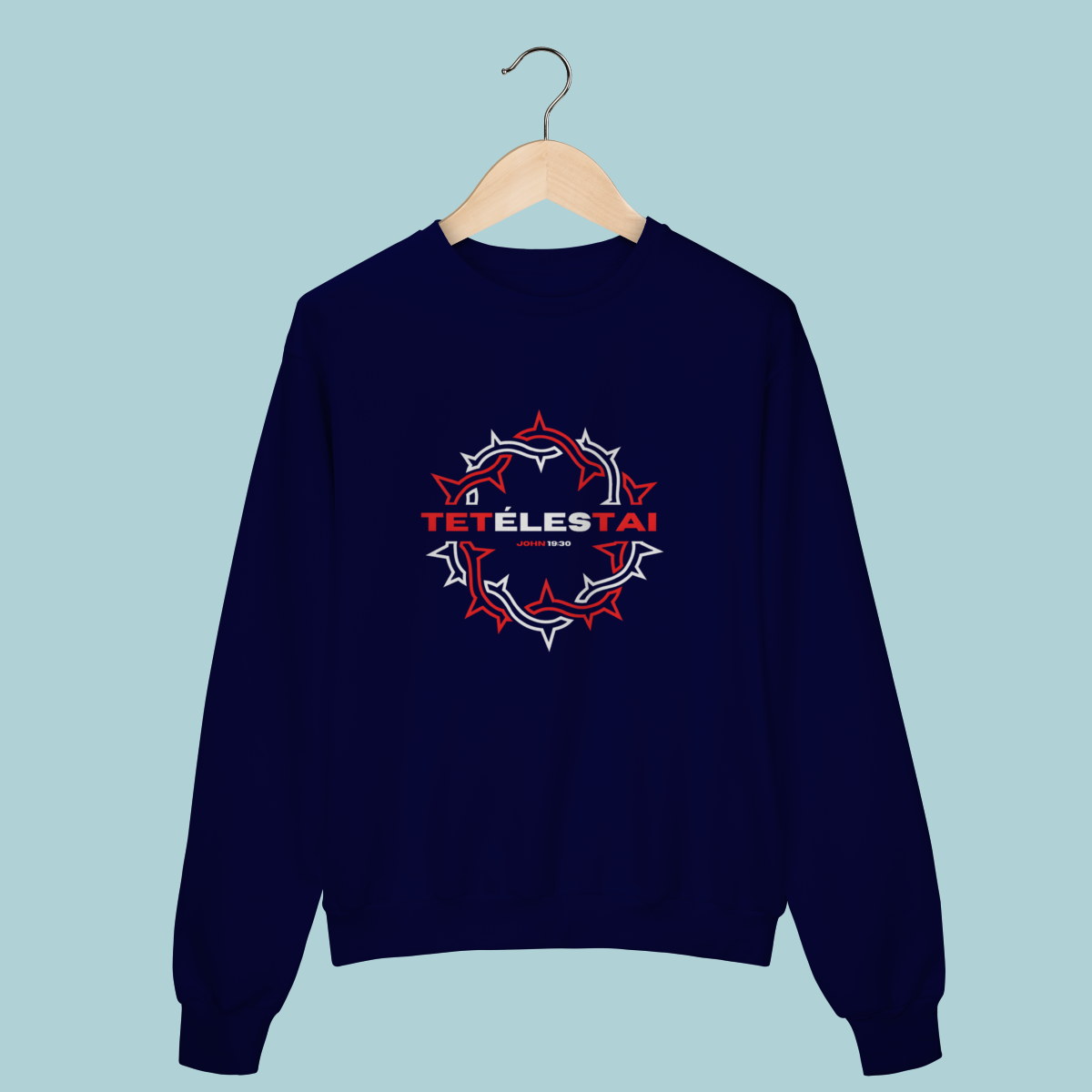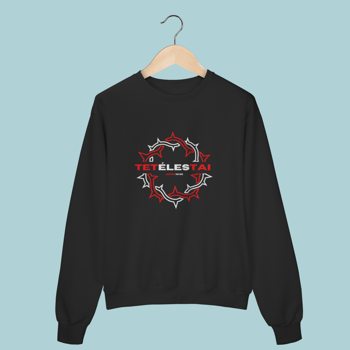 A palavra que mudou a eternidade: TETÉLESTAI. Este Moletom celebra a verdade de João 19:30 ("Está Consumado"), a declaração da obra perfeita e suficiente de Cristo na cruz. O design com a coroa de espinhos estilizada e o corte oversized trazem conforto e profundidade teológica.