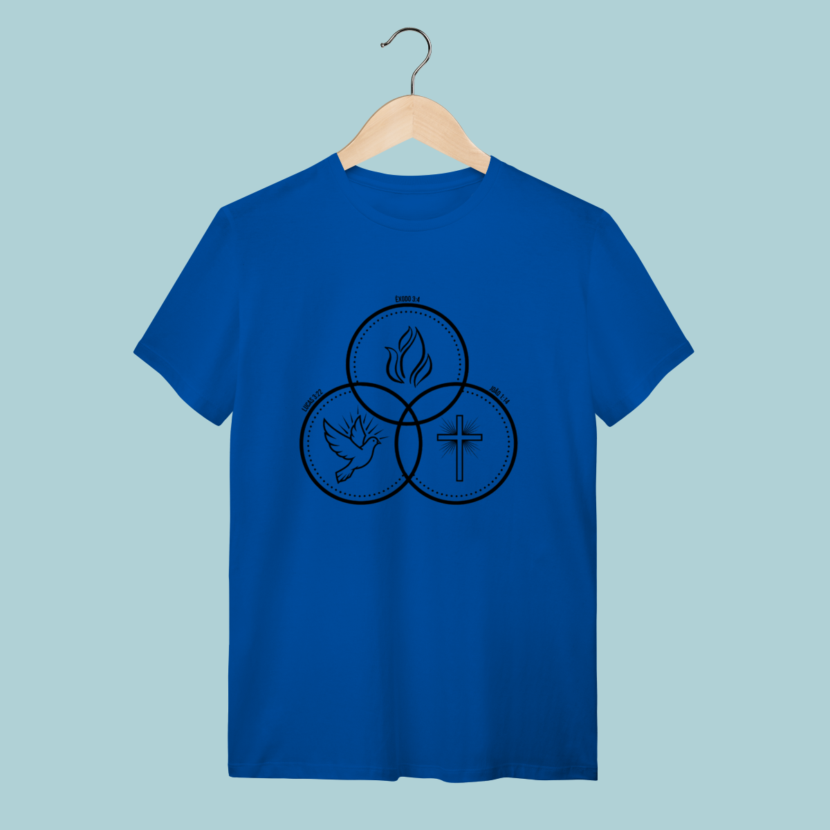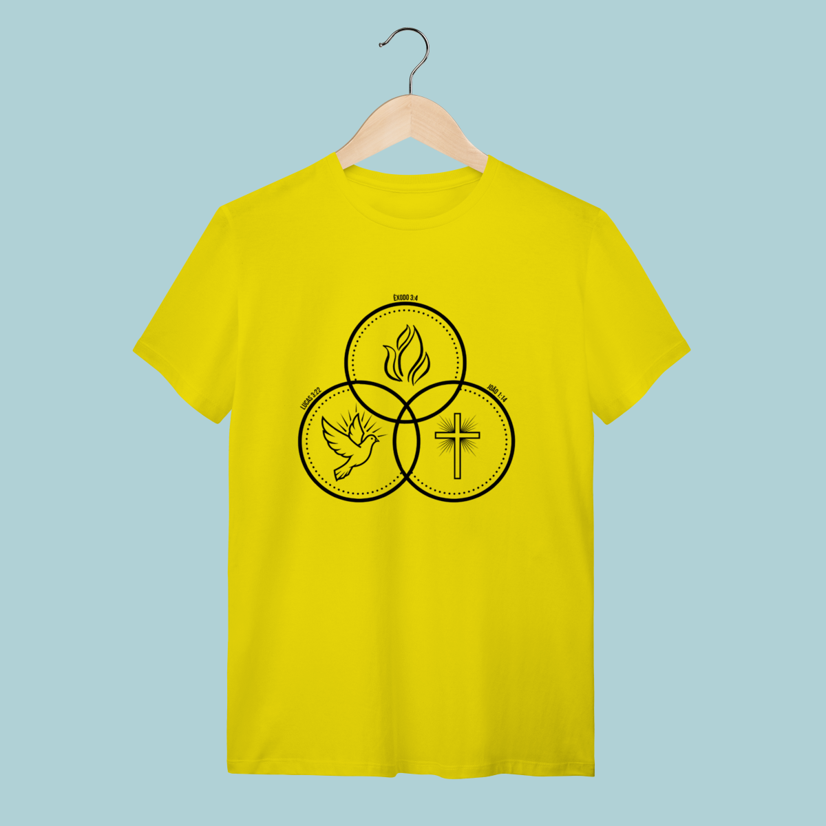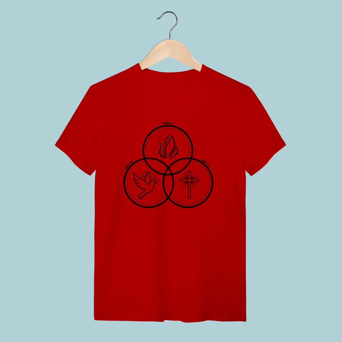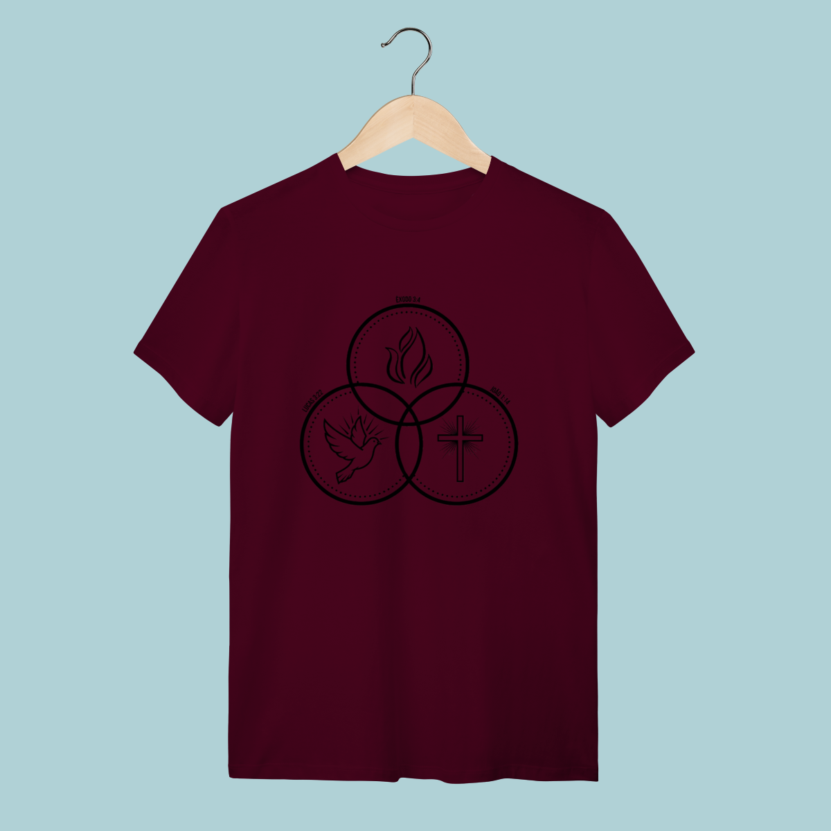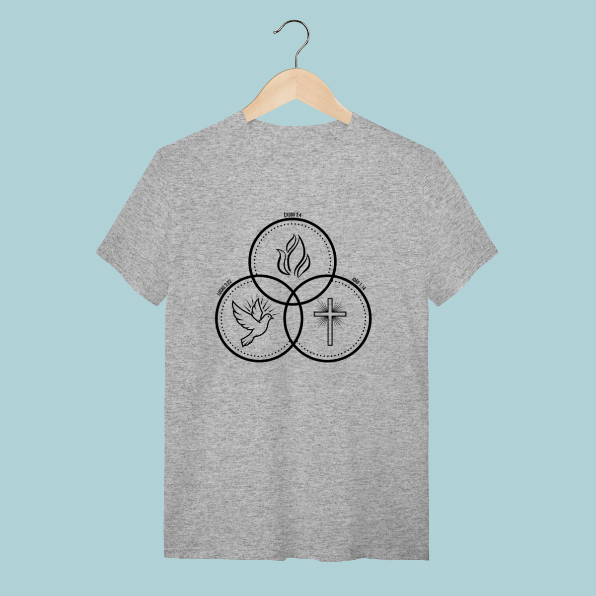 Camiseta com design que ilustra a co-igualdade do Espírito Santo (Pomba), do Filho (Cruz) e do Pai (Fogo/Glória). Doutrina fundamental com estilo minimalista.