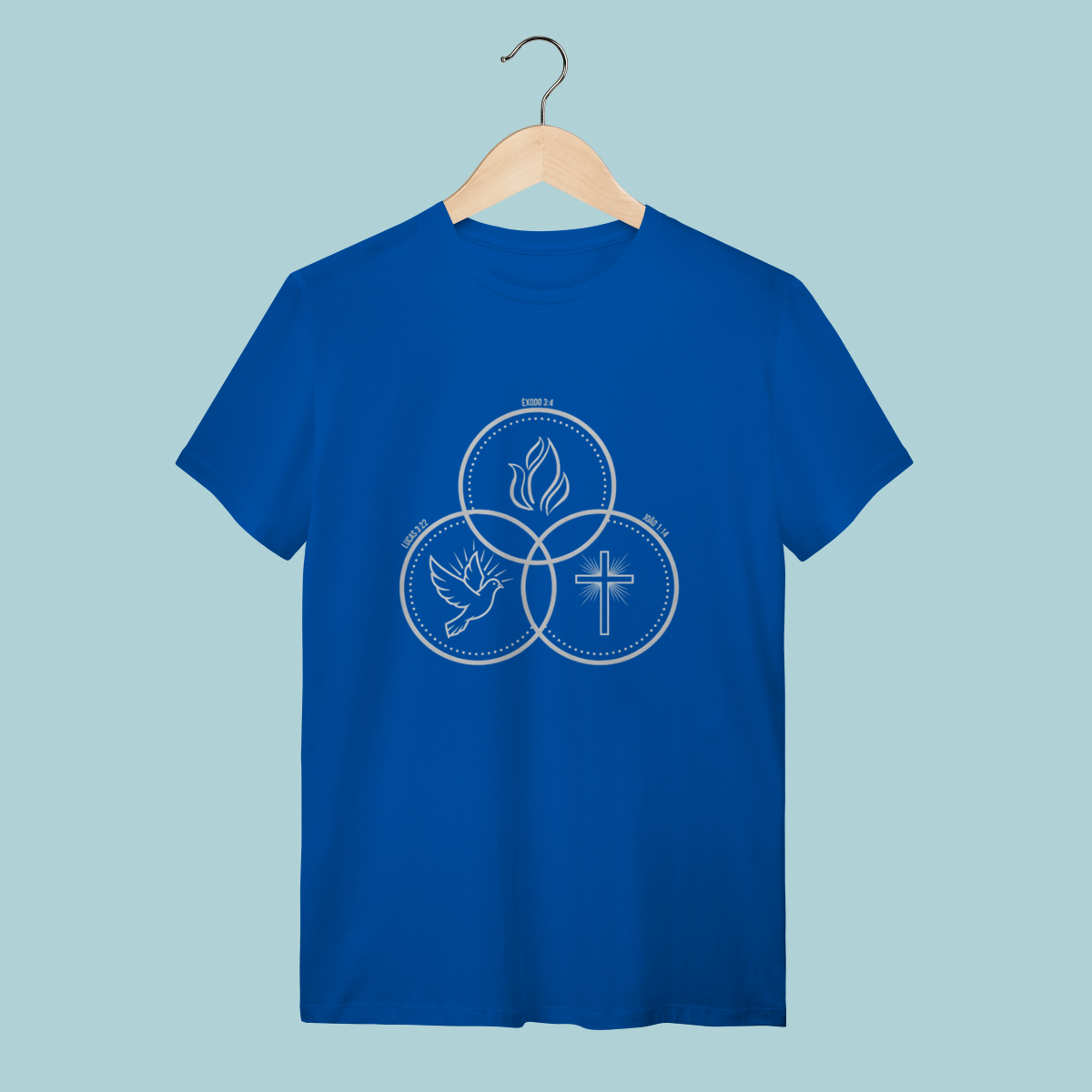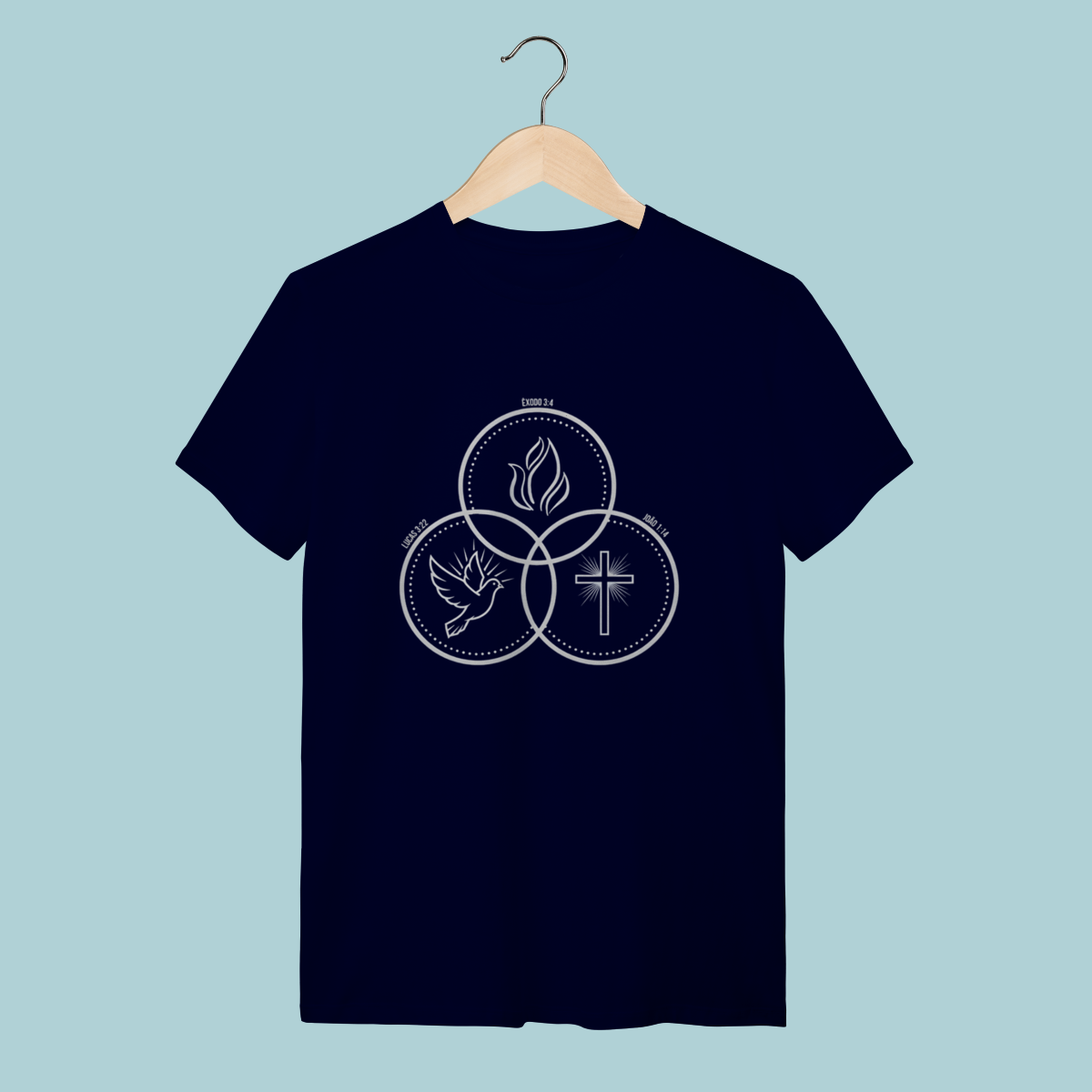 Camiseta com design que ilustra a co-igualdade do Espírito Santo (Pomba), do Filho (Cruz) e do Pai (Fogo/Glória). Doutrina fundamental com estilo minimalista.