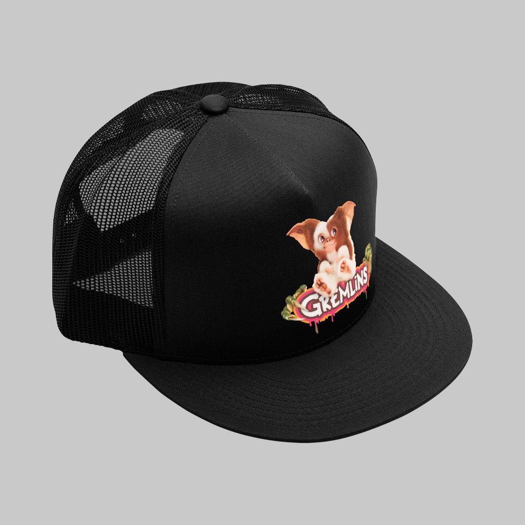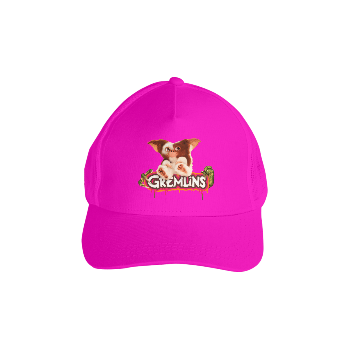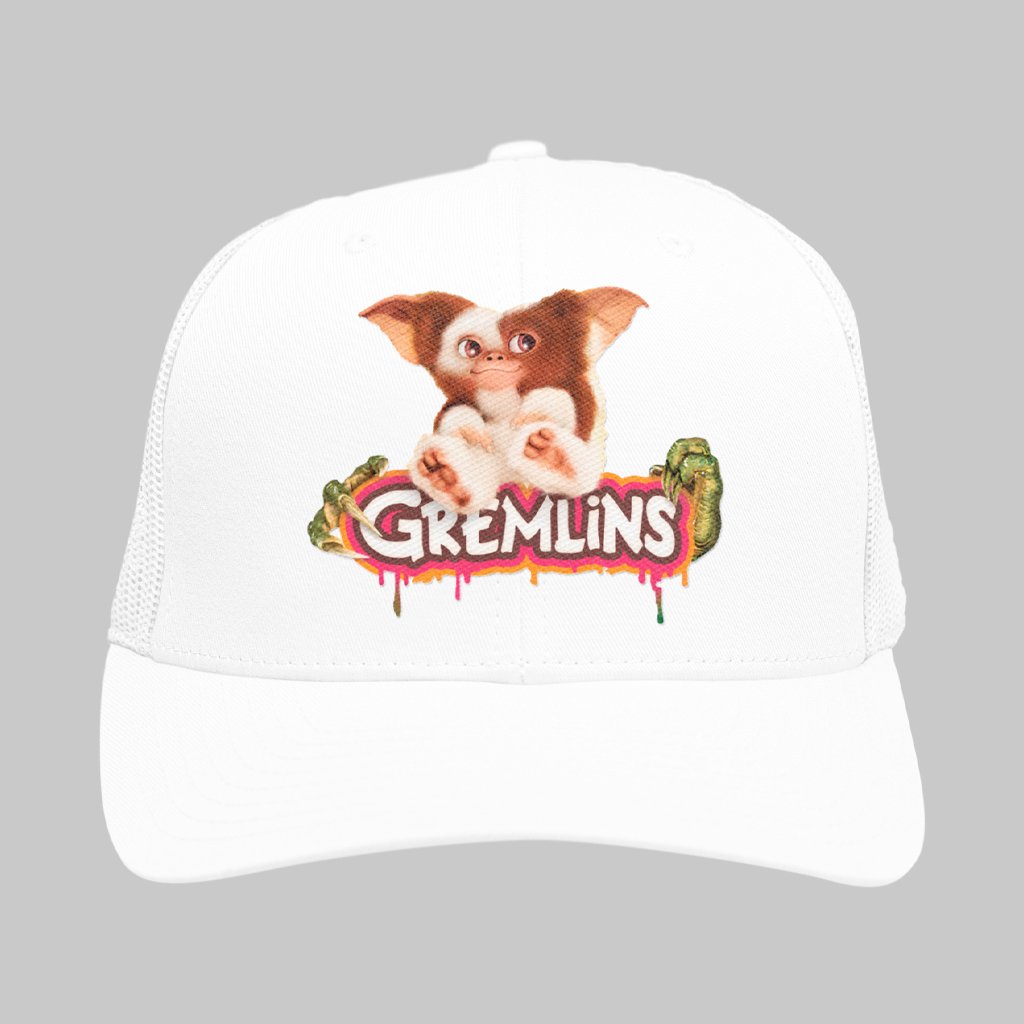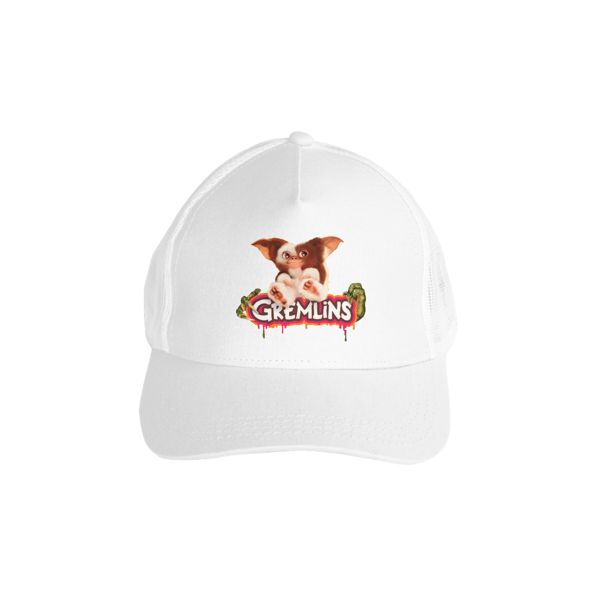 Se você decorou as três regras (nada de luz forte, nada de água e nada de comida depois da meia-noite), este boné vai direto no coração. A arte traz o contraste perfeito entre a fofura do Mogwai e as garras afiadas dos Gremlins, com lettering chapado que parece ter saído da capa do VHS. É um aceno divertido às sessões da tarde e às locadoras lotadas em dezembro de 84 — quando o caos tomou conta da telinha.