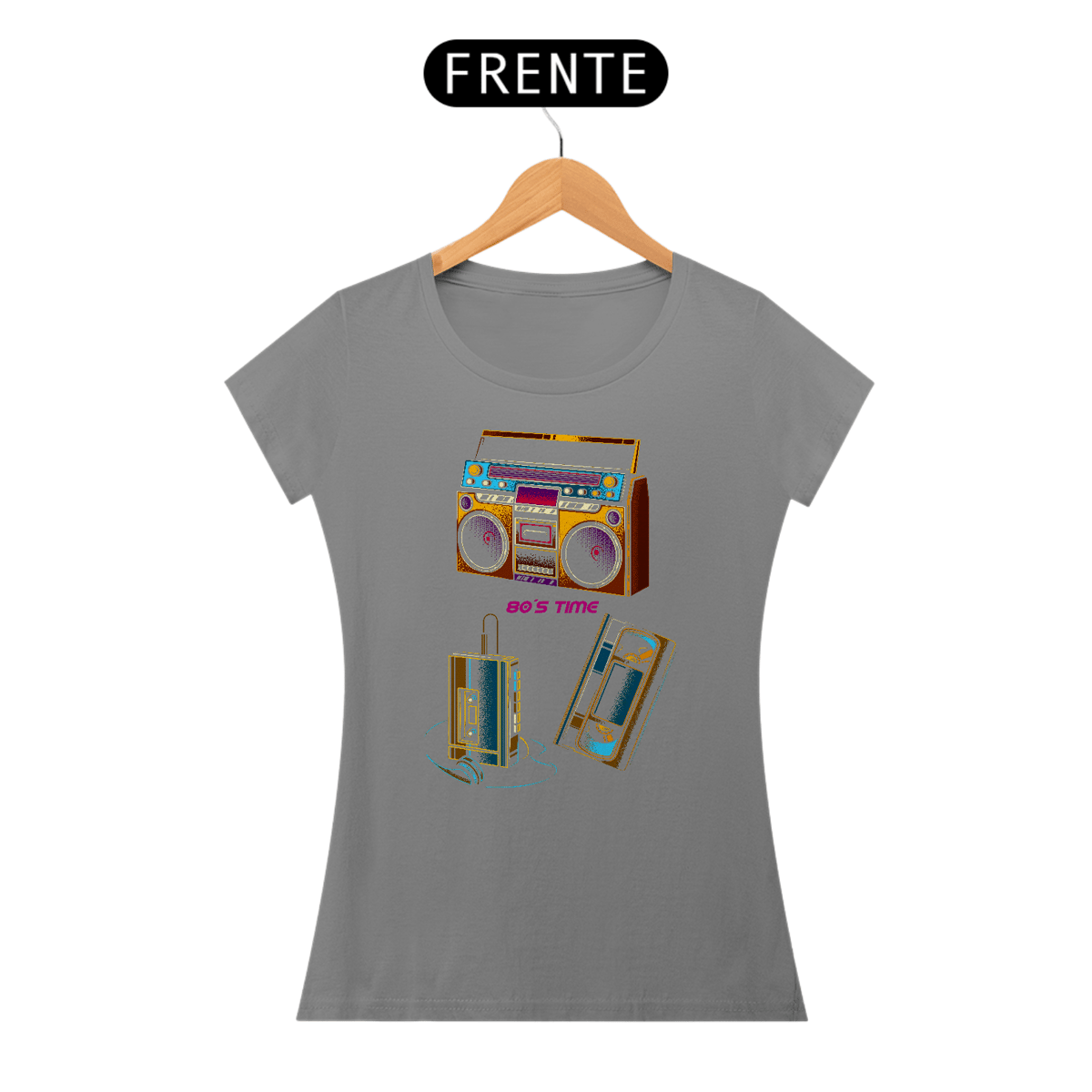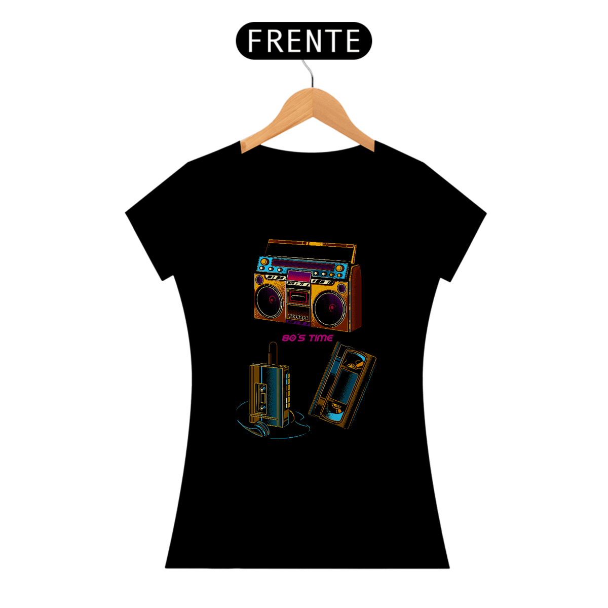 Se você esperava a locutora parar de falar para apertar REC, essa estampa é seu cartão de memória afetiva. O visual colorido reúne os gadgets que acompanharam posters de banda, meias arrastão e reuniões na porta da escola: boombox potente, walkman inseparável e uma VHS para registrar os clipes da madrugada.