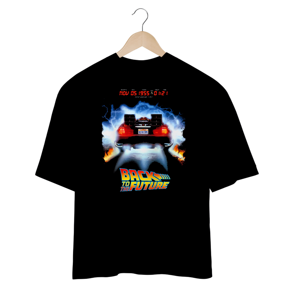 Nov 5, 1955. O painel vermelho acende, o DeLorean dispara a 88 mph e duas trilhas de fogo ficam na rua — cena que a gente rebobinou na fita mil vezes. Essa estampa celebra o auge do cinema oitentista: o carro mais famoso da cultura pop, a placa OUTATIME e a eletricidade que fez a sala inteira vibrar. É vestir e ouvir o zumbido do capacitor de fluxo.