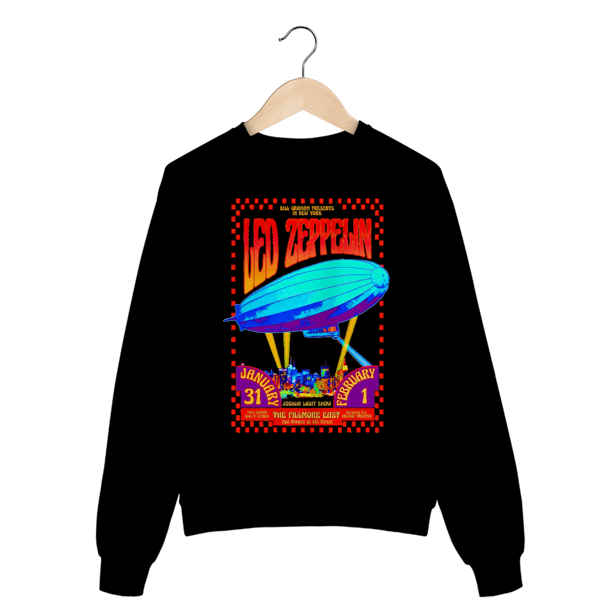 Este moletom fechado unissex traz a icônica arte psicodélica do cartaz original dos shows do Led Zeppelin no Fillmore East, em Nova York. Um design vibrante e histórico que transforma um momento épico do rock em peça de roupa para seu dia a dia.