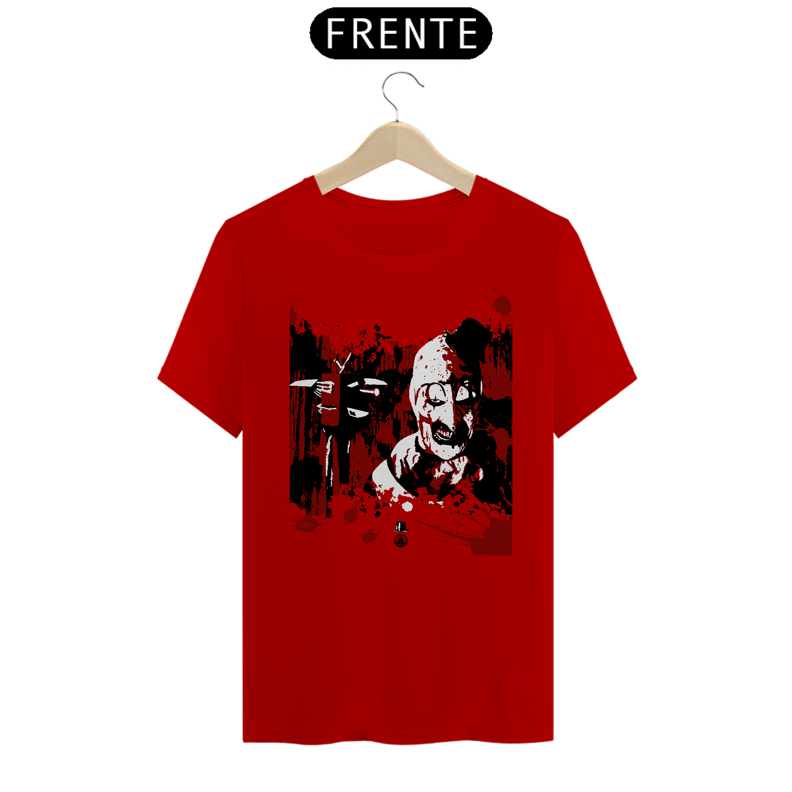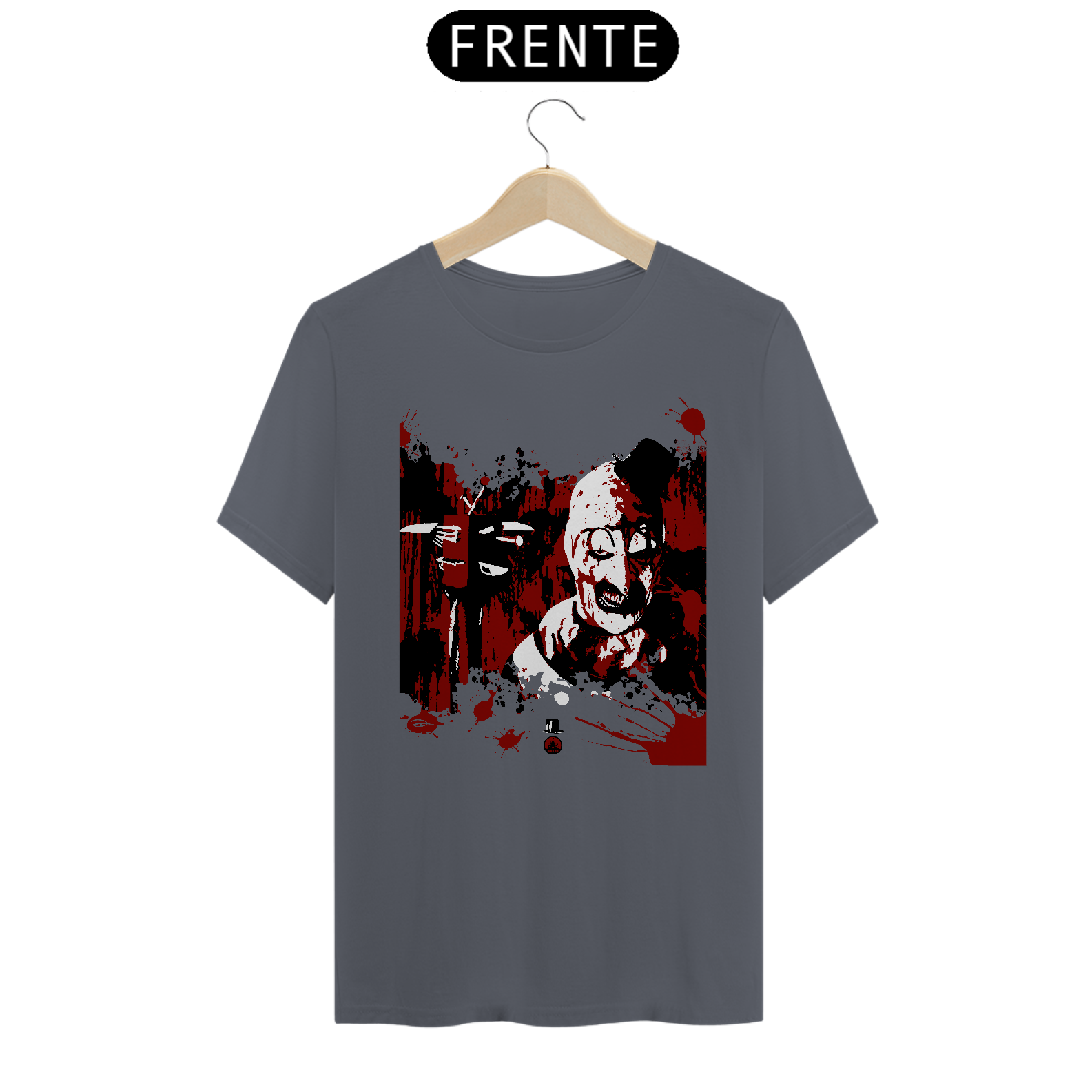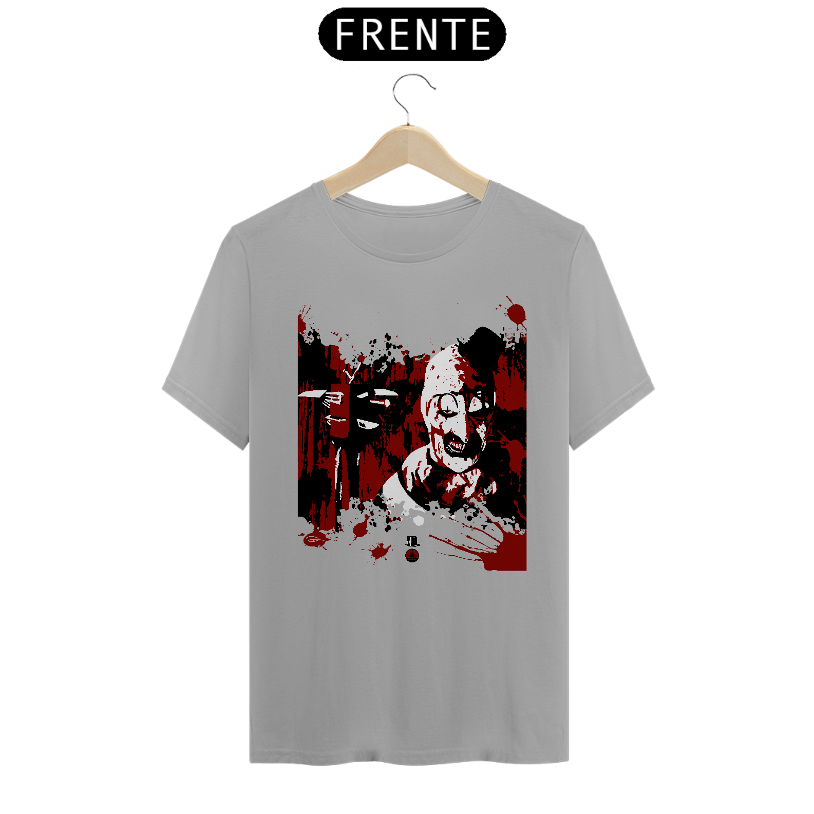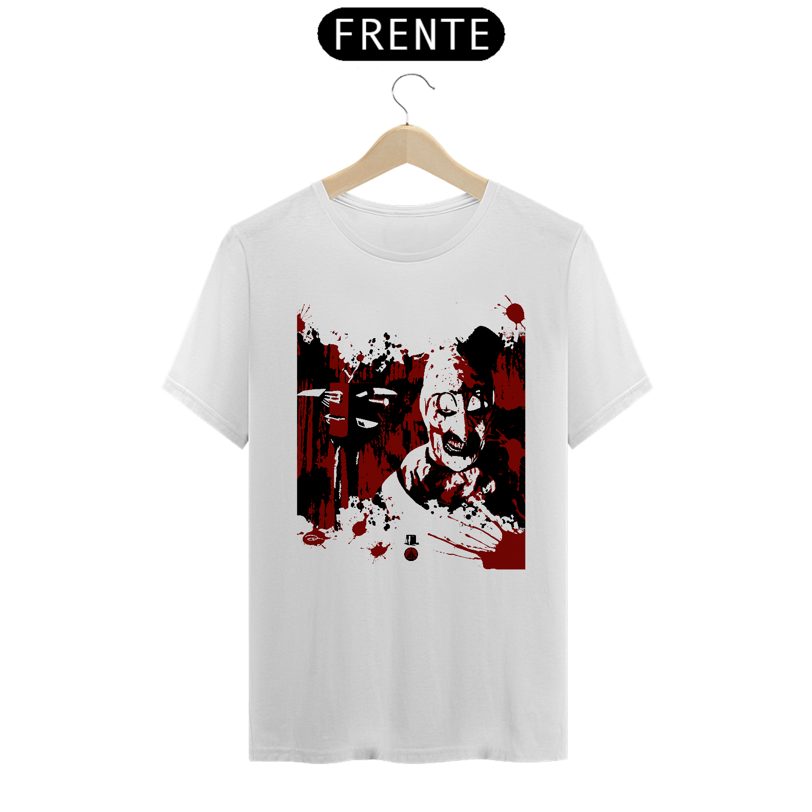 Estampa em homenagem a Art, o palhaço, do filme de 2016, Terrifier, que já teve uma continuação (2022) e outra que sairá em Dezembro de 2024. Confirmada também a próxima sequência, Terrifier 4.