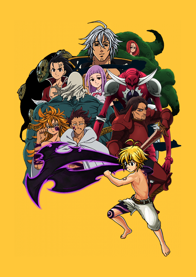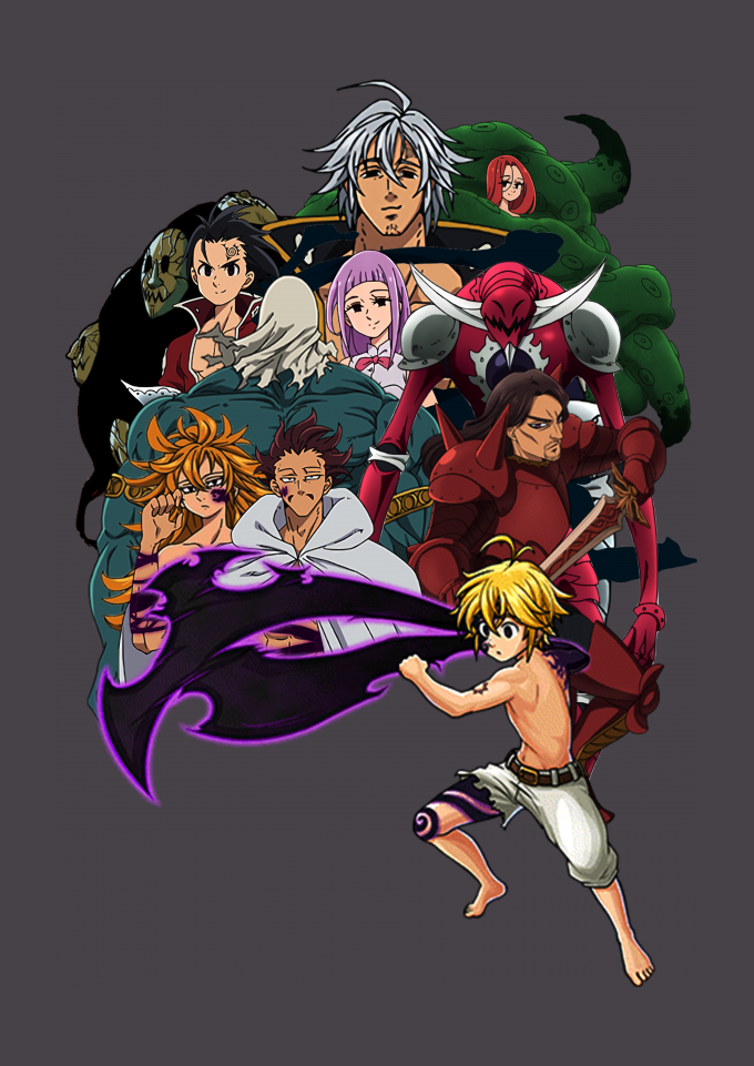 Os 10 Mandamentos e Meliodas fazem Parte do anime "Nanatsu no Taizai" " Melascula, Derieri, Drole, Fraudrin, Monspeet, Estarossa, Zeldris, Galand, Gloxinia, Meliodas "