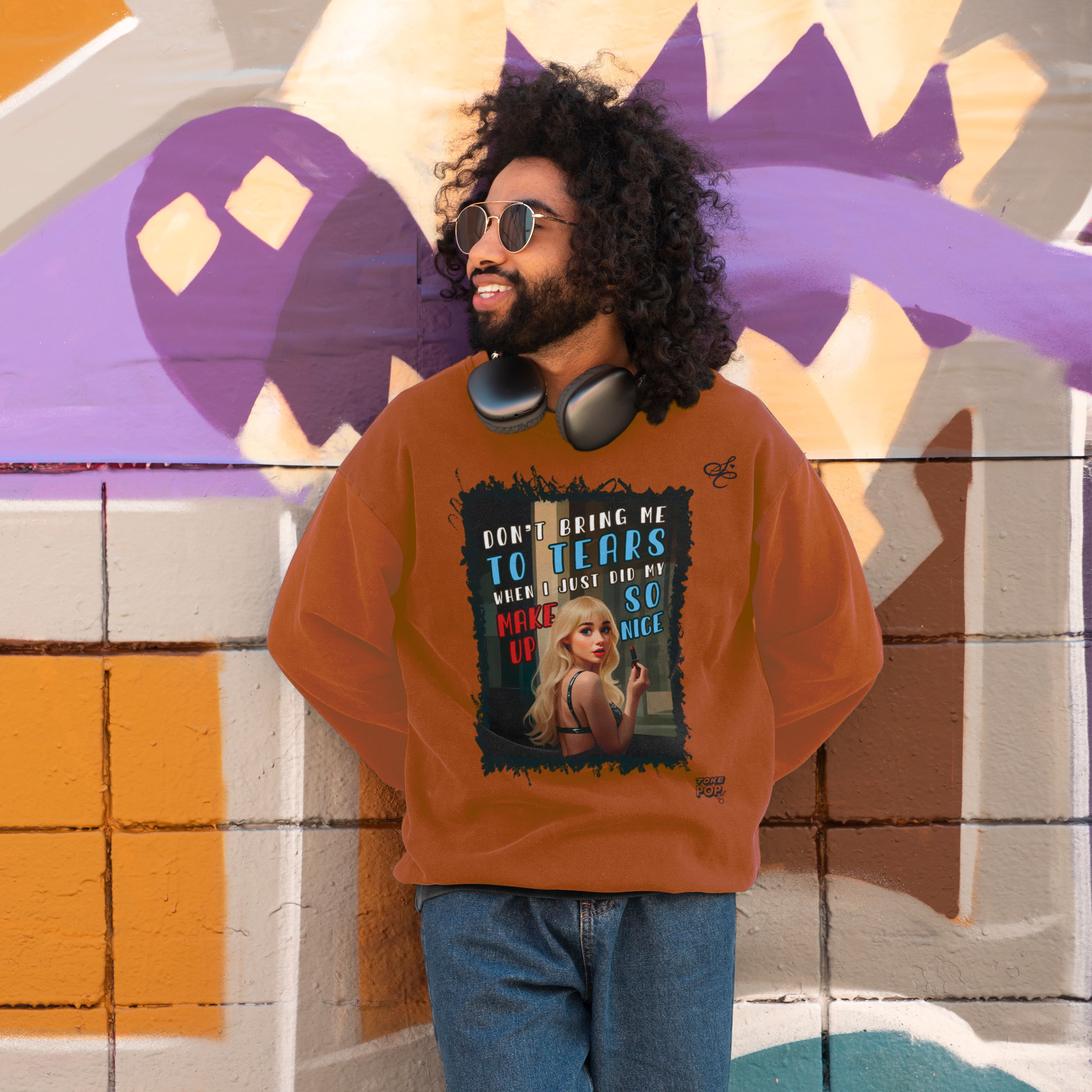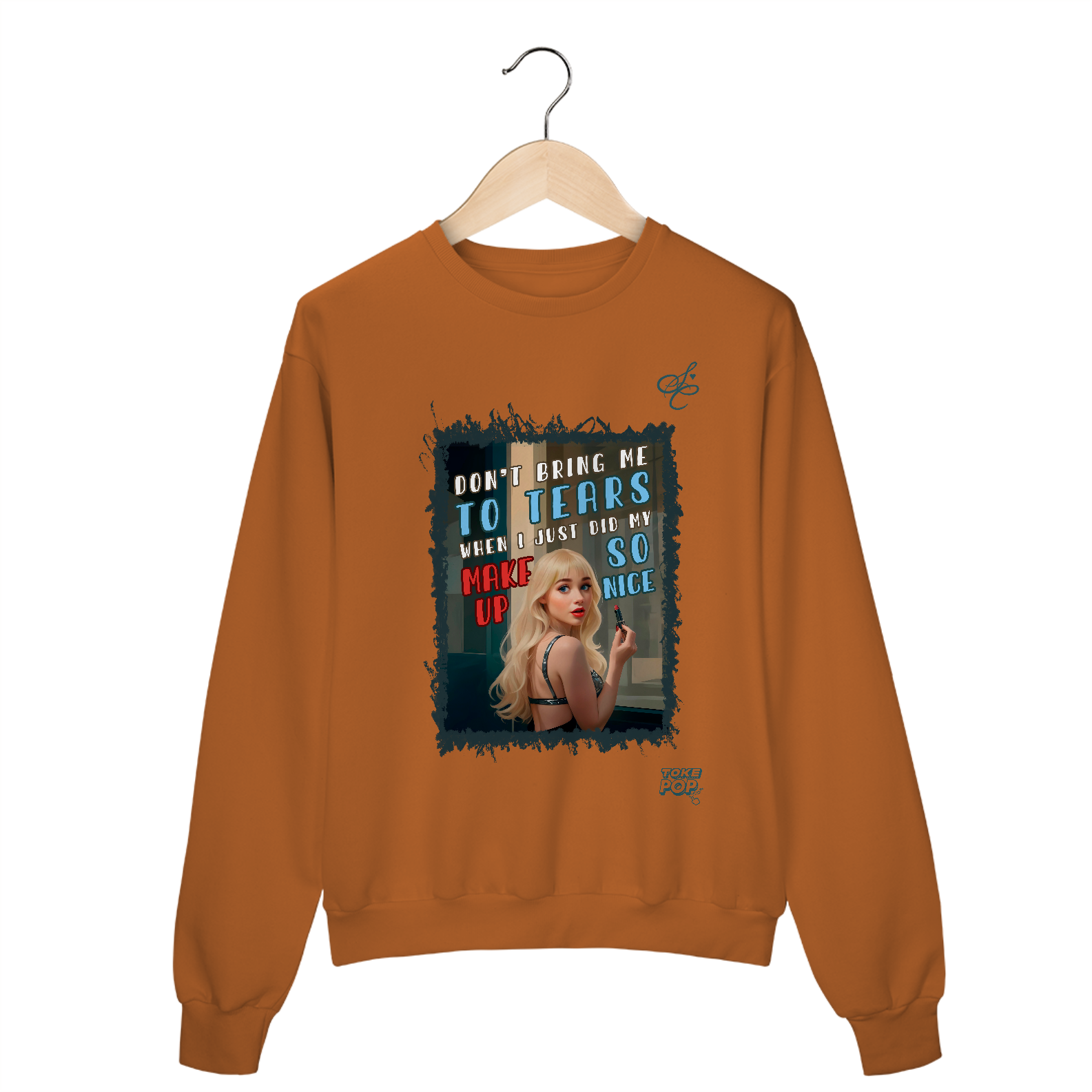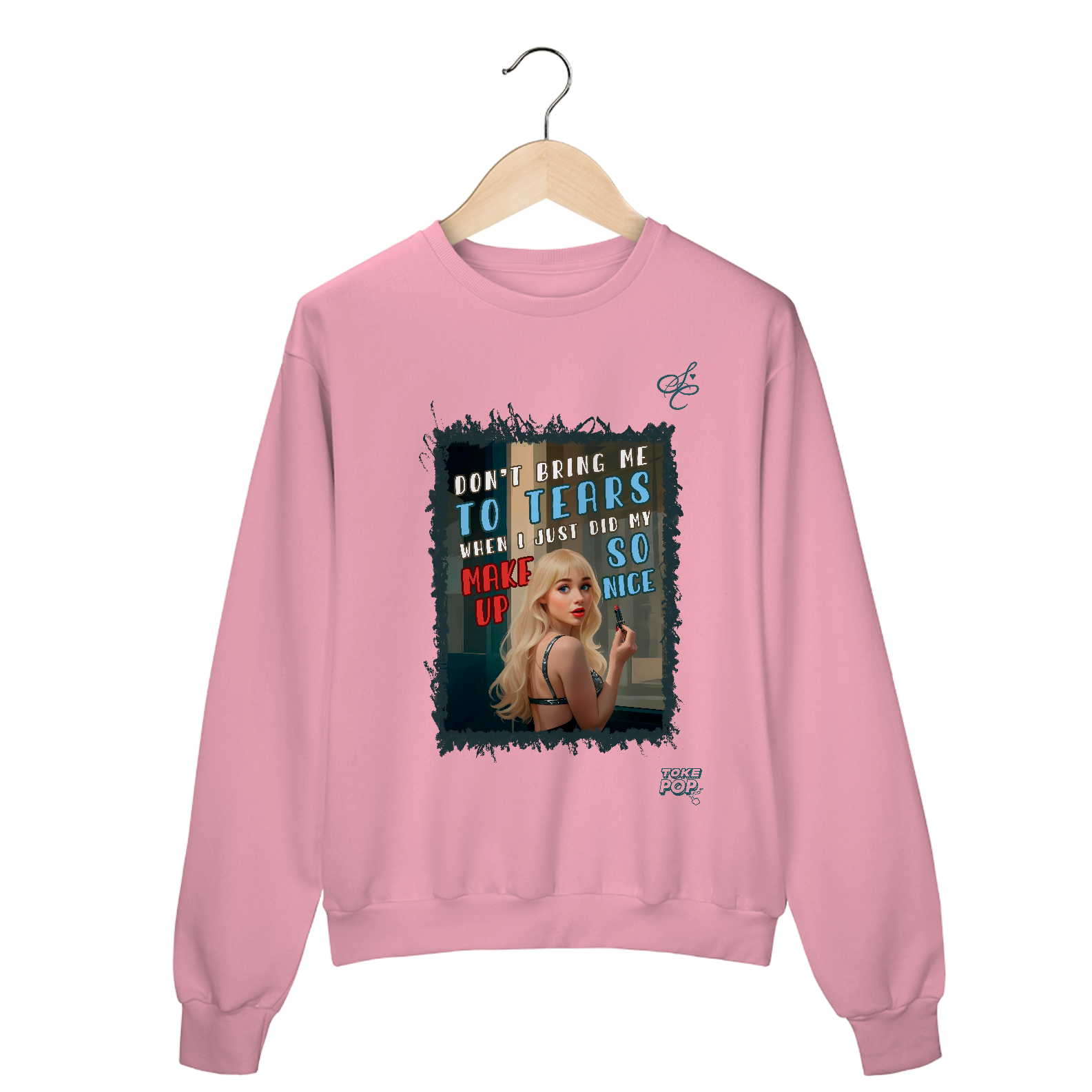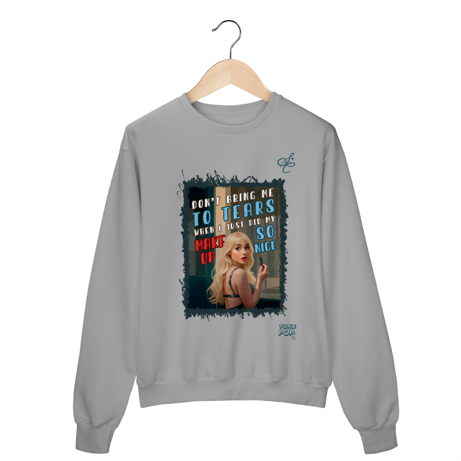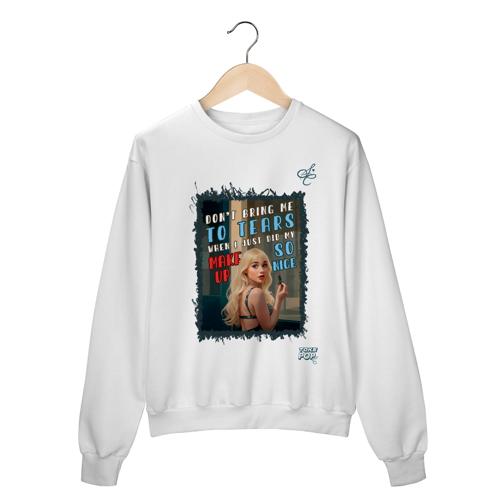 Moletom Sabrina Carpenter - Cartoon tears Crewneck - SABRINA CARPENTER | SHORT 'N SWEET COLLECTION Gola redonda com foto de Sabrina Carpenter com letras de música "Don't bring me to tears when I just did my makeup so nice" impresso na frente.