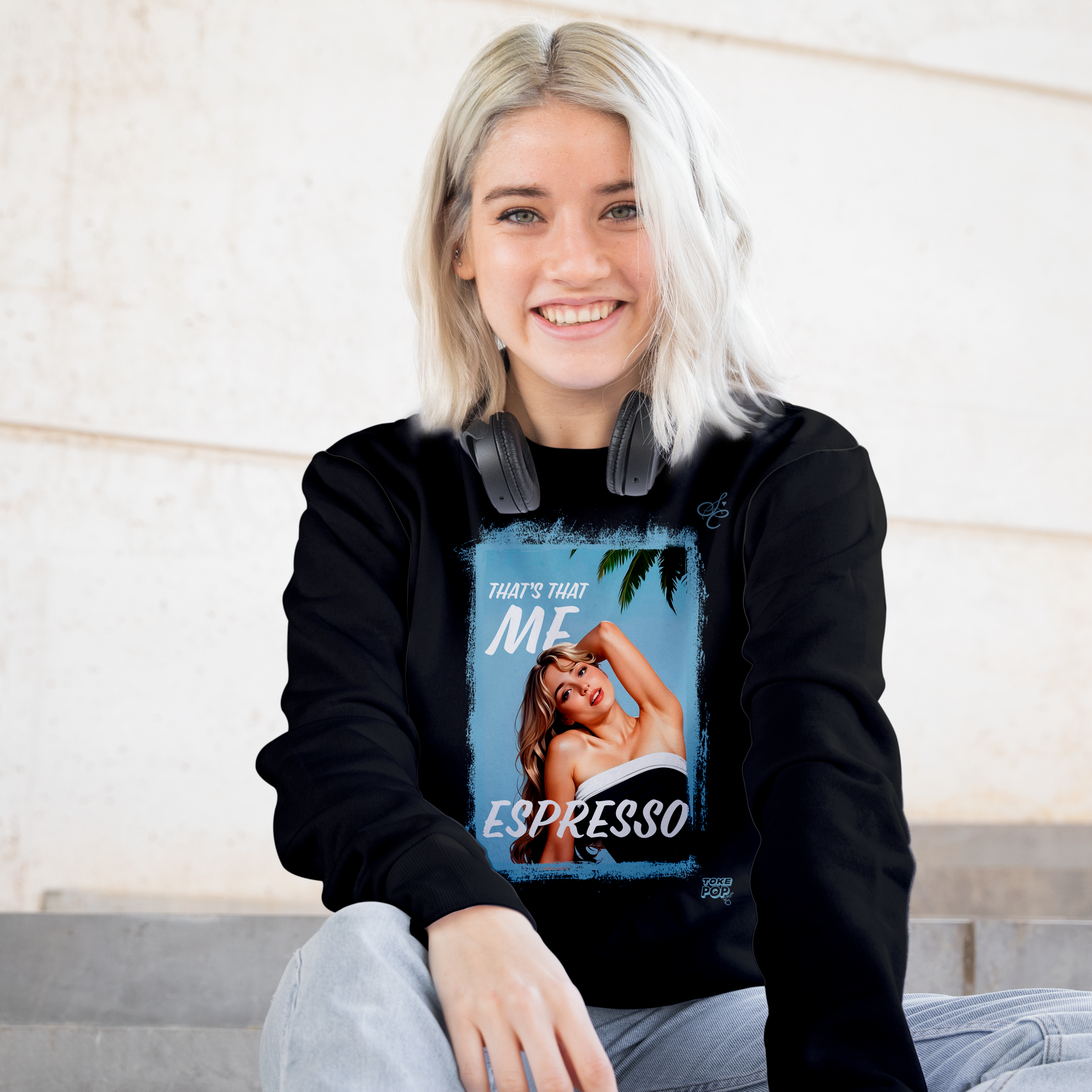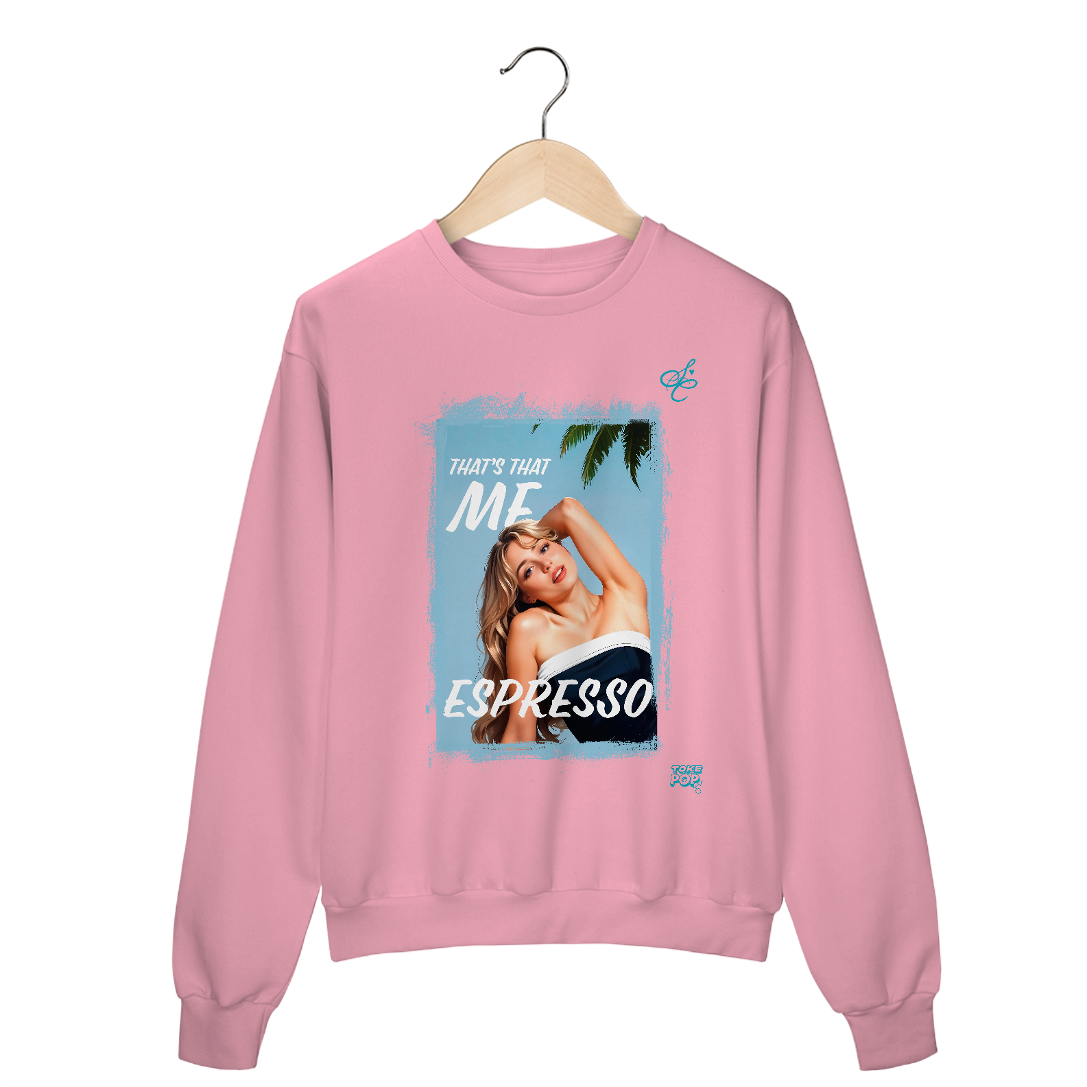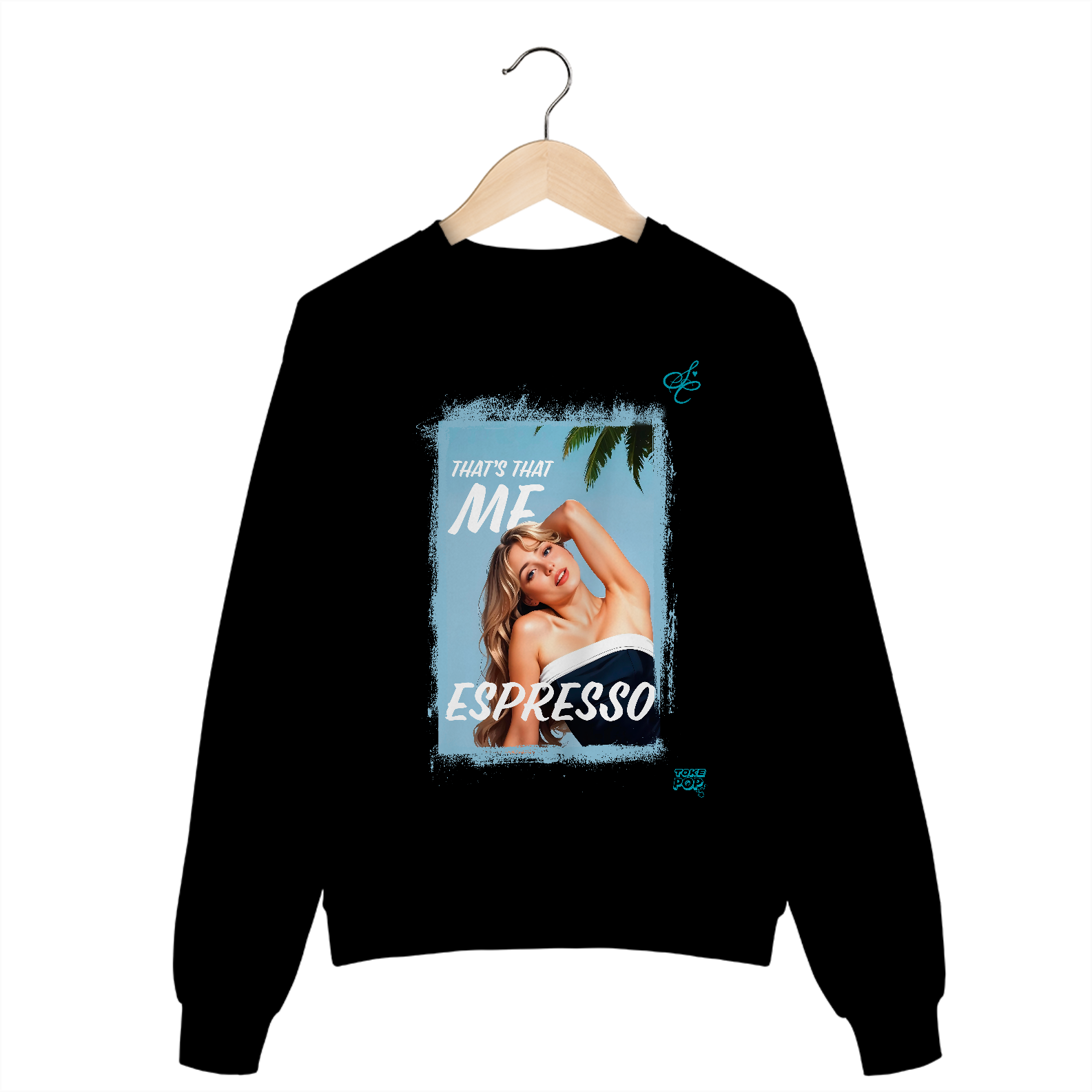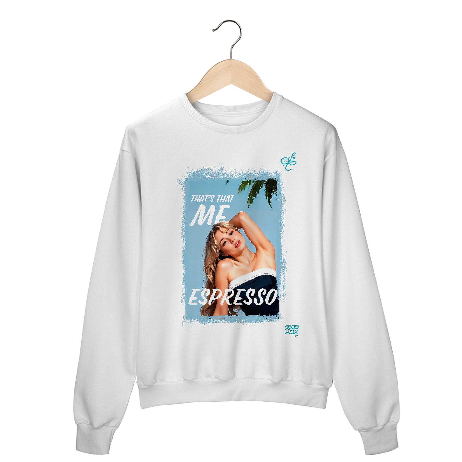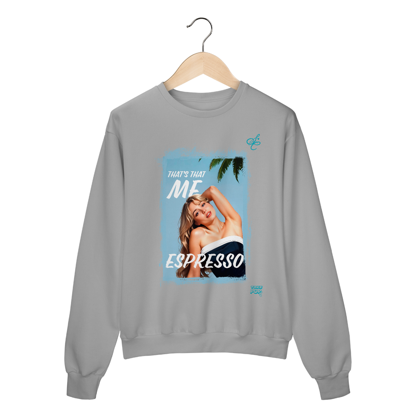 Moletom Sabrina Carpenter - Espresso Crewneck - SABRINA CARPENTER | SHORT 'N SWEET COLLECTION Gola redonda com foto de Sabrina Carpenter com letras de música "That's that me espresso" impresso na frente.