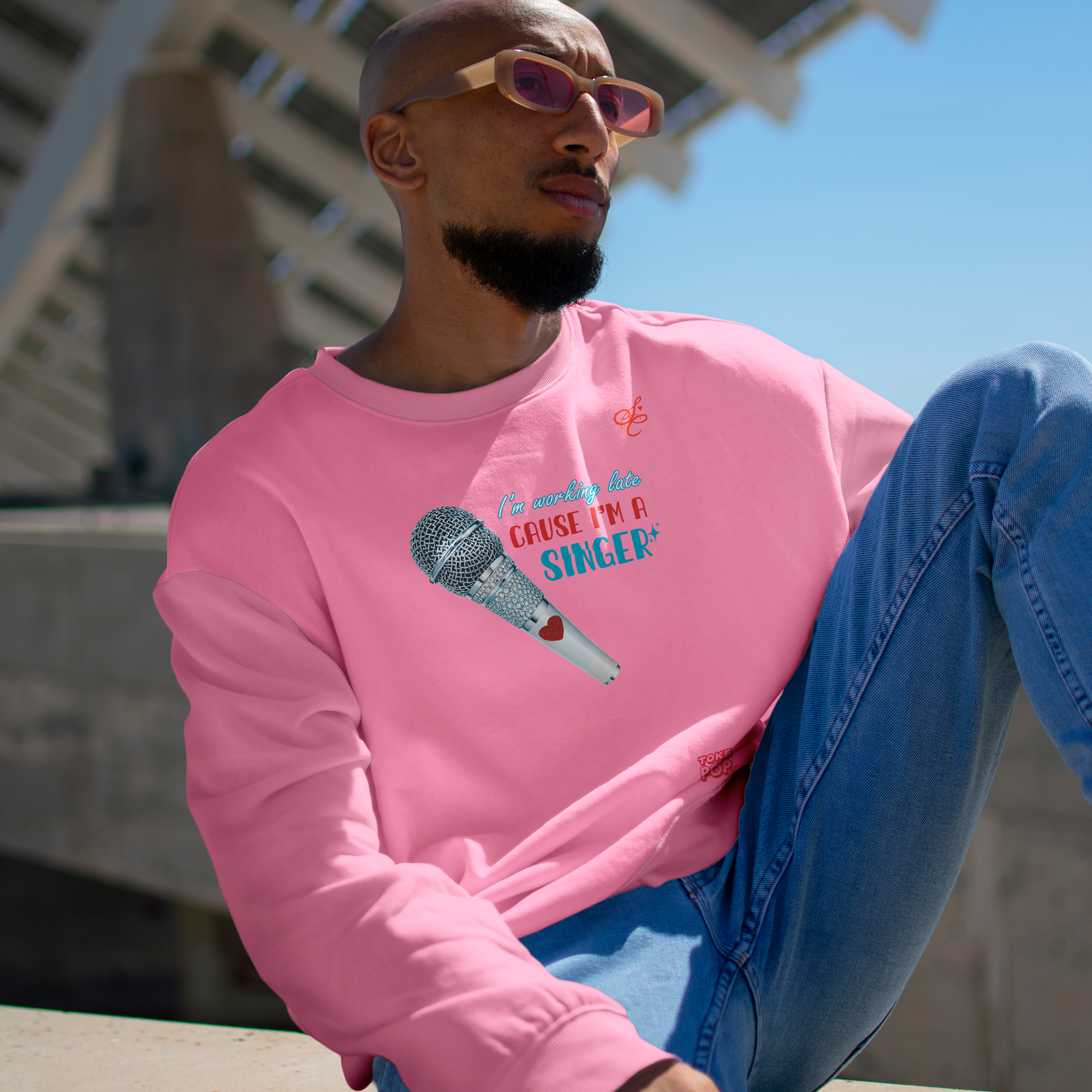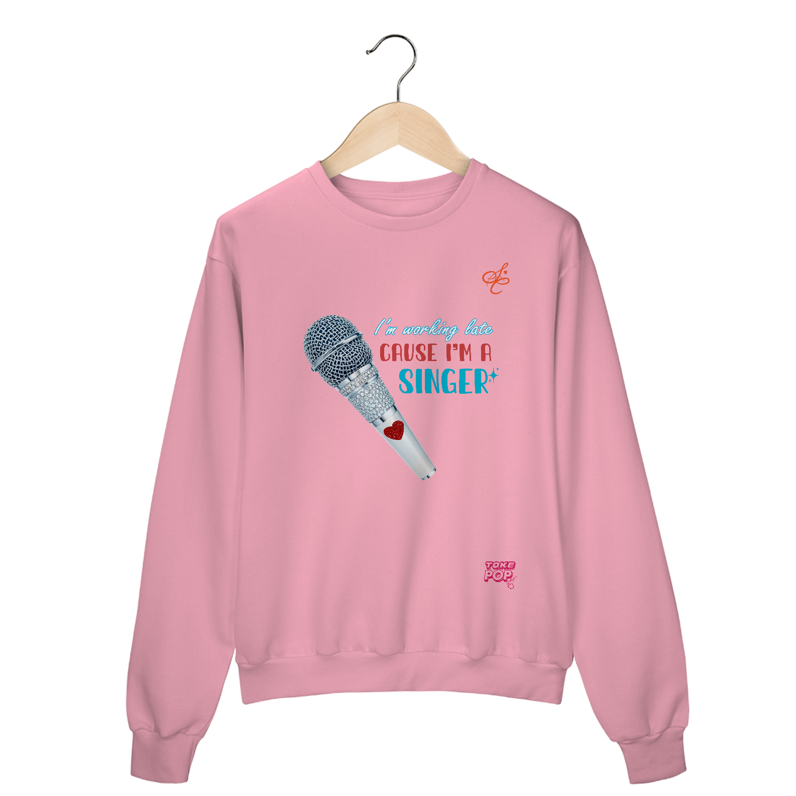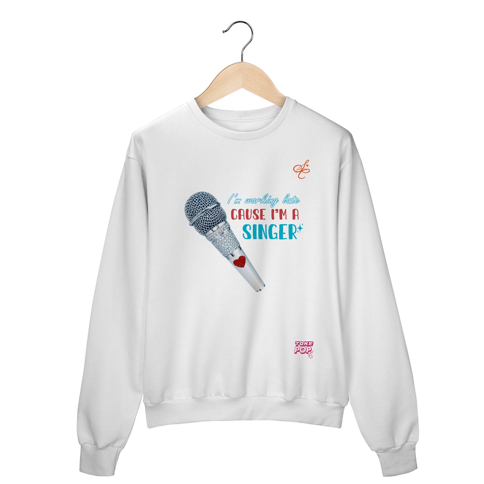 Moletom Sabrina Carpenter - Late alt Crewneck - SABRINA CARPENTER | SHORT 'N SWEET COLLECTION Gola redonda com foto de microfone com letras de música "I'm working late cause I'm a singer" impresso na frente.