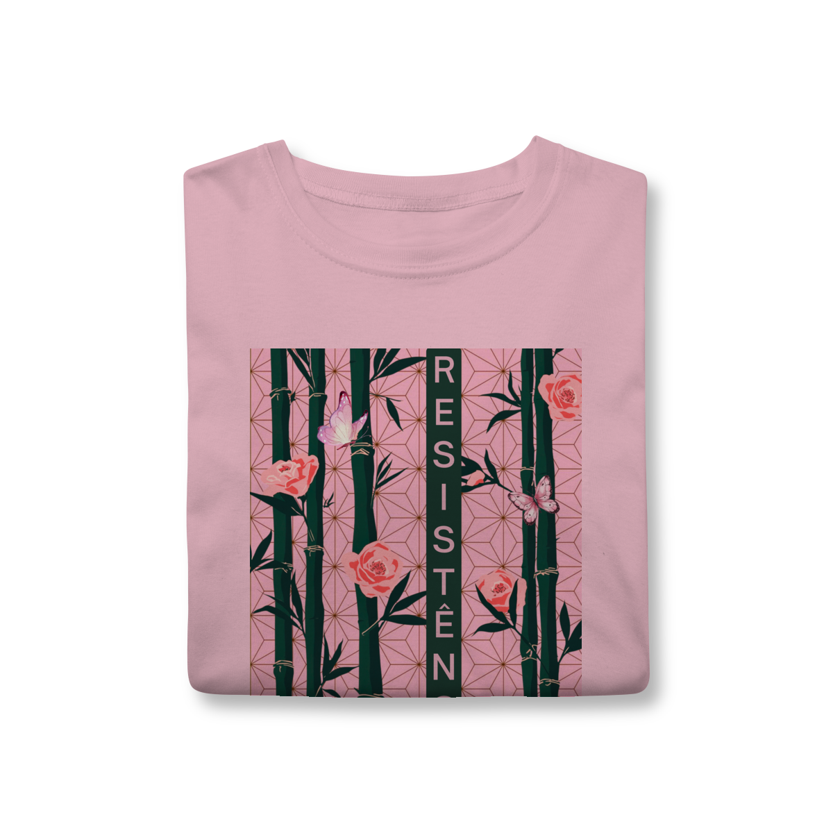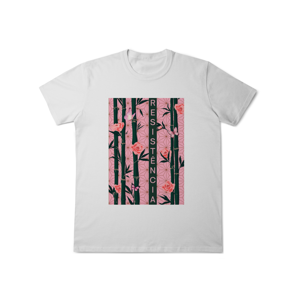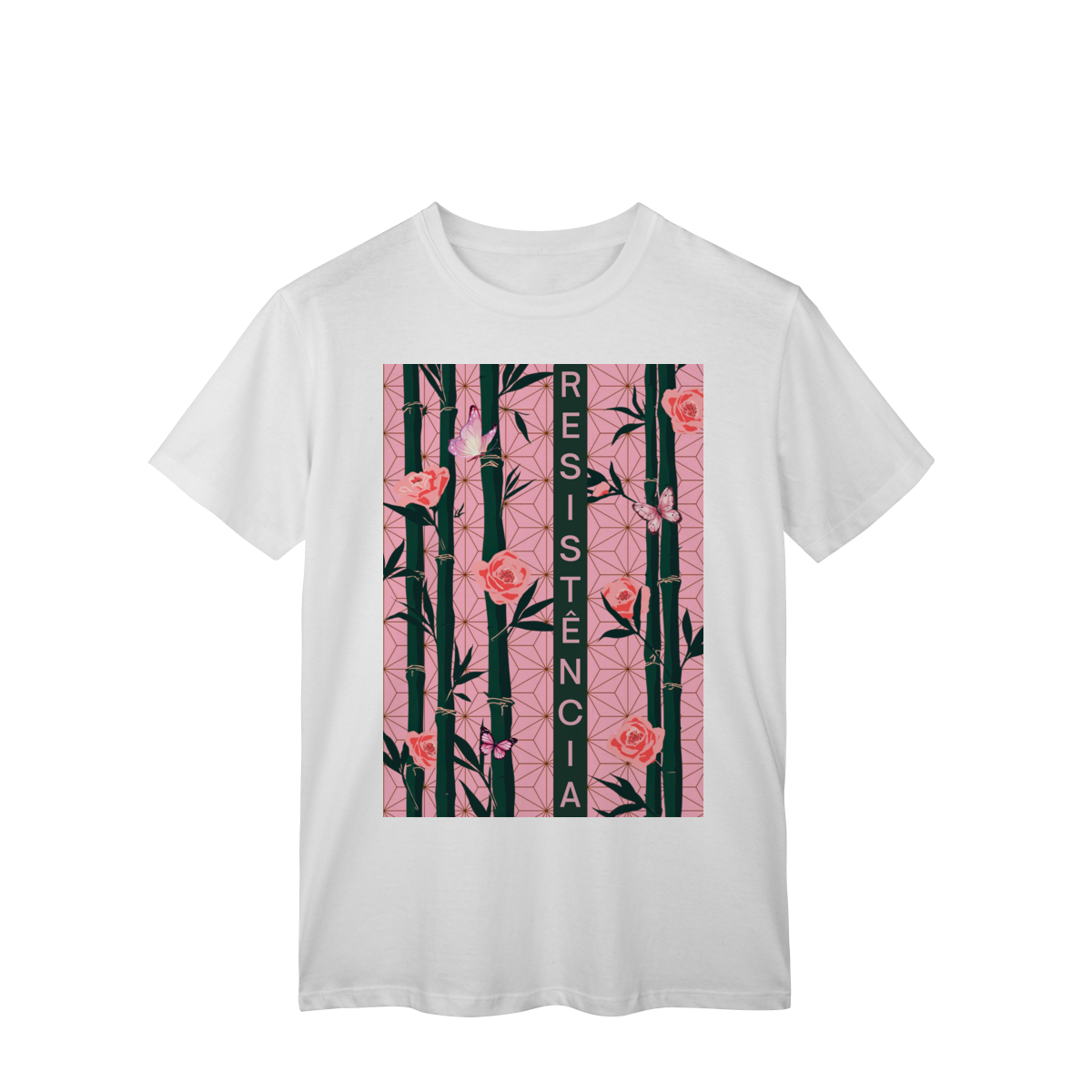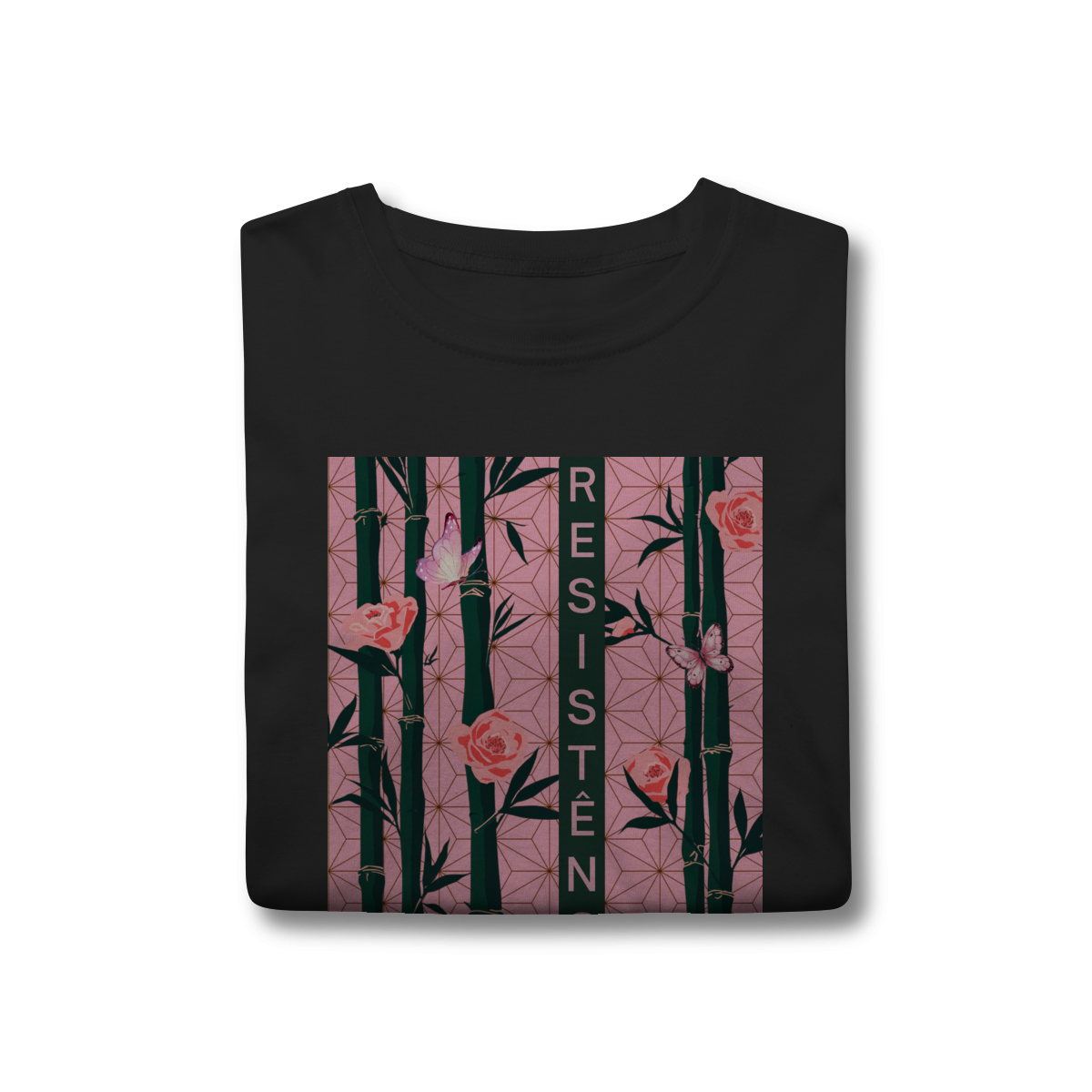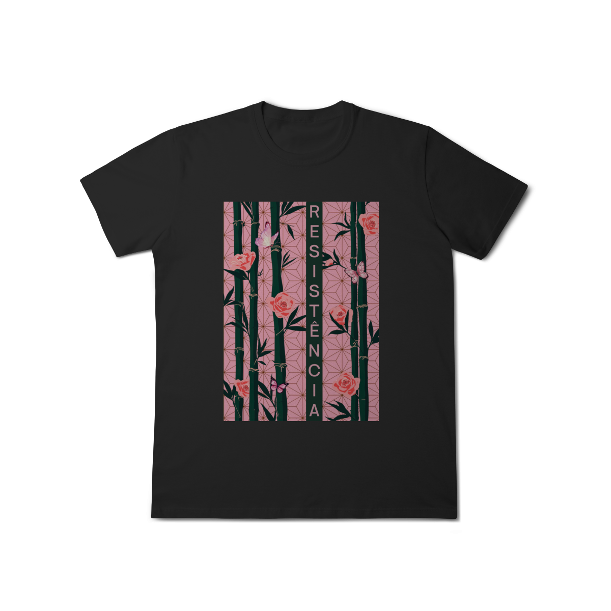 Inspirada em Nezuko Kamado, de Kimetsu no Yaiba, esta estampa mistura delicadeza e poder. O bambu, as flores e as borboletas simbolizam a resistência e a beleza que existe na luta silenciosa.